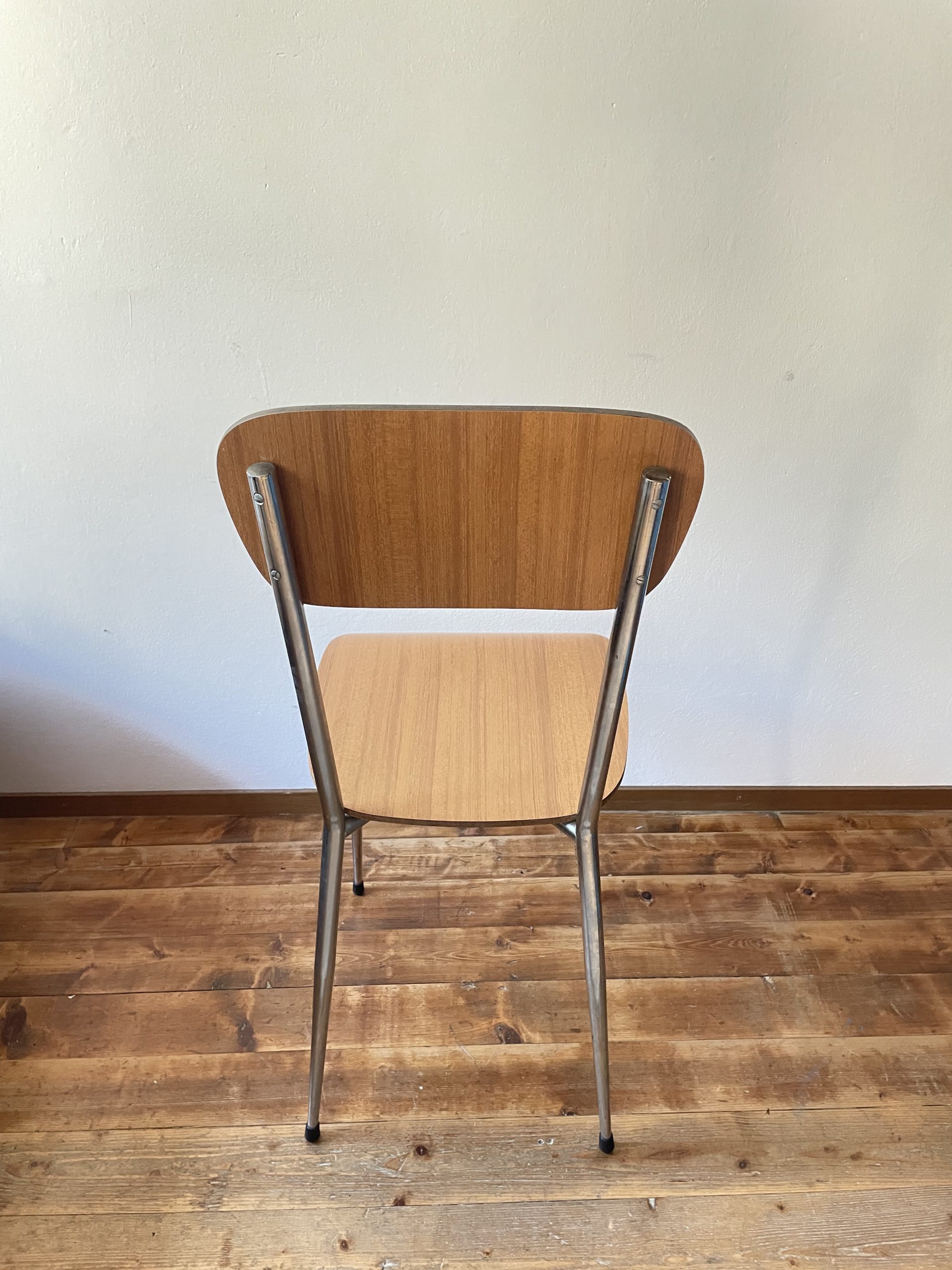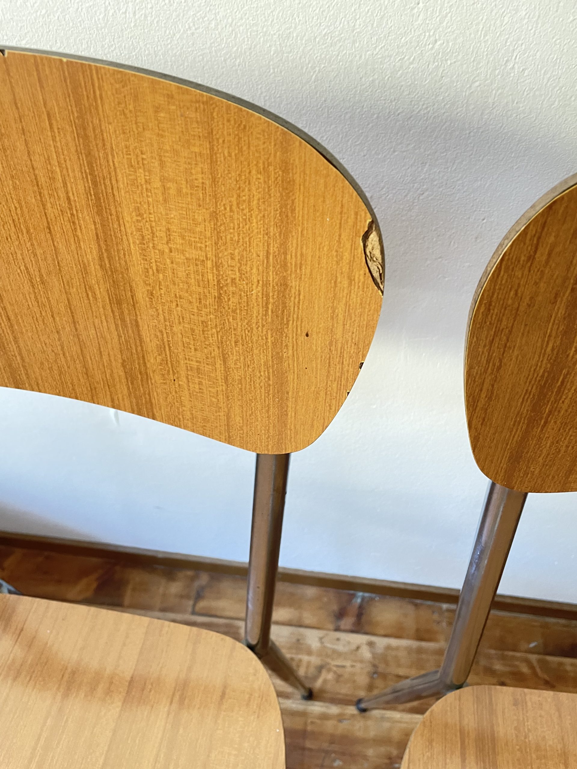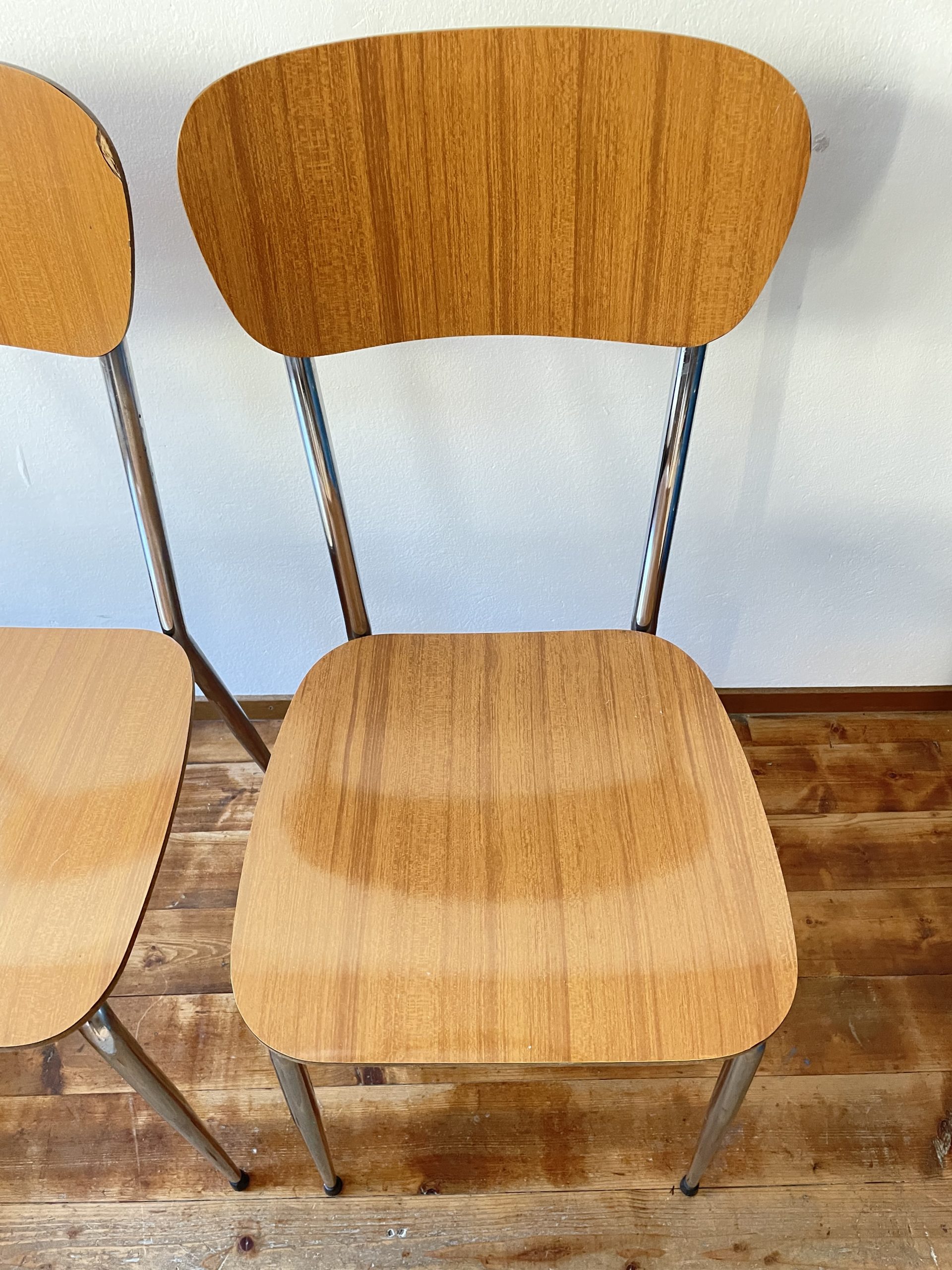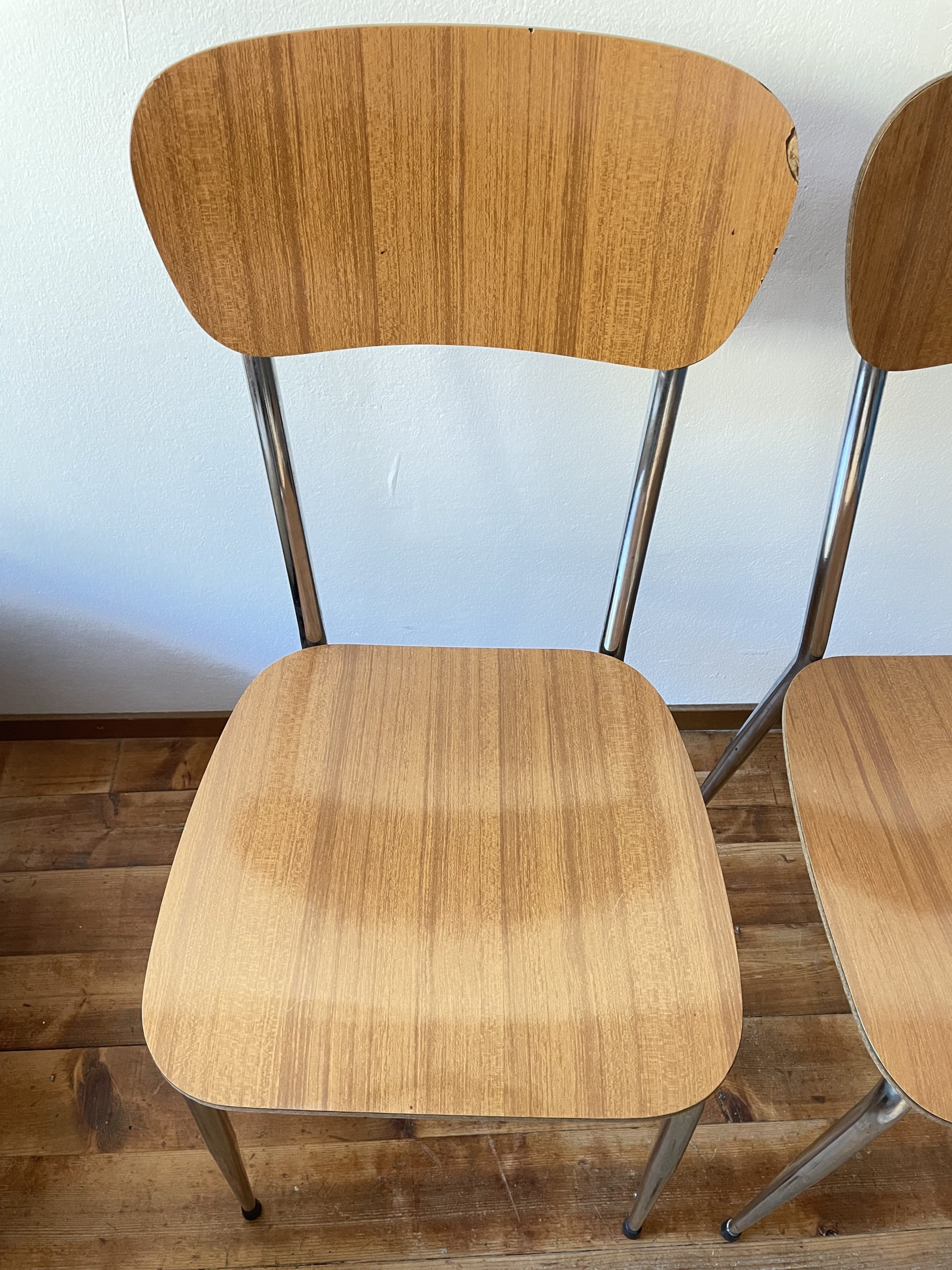 Produit venduPaire de chaises en formica de couleur marron clair, avec sa structure en métal argenté.
