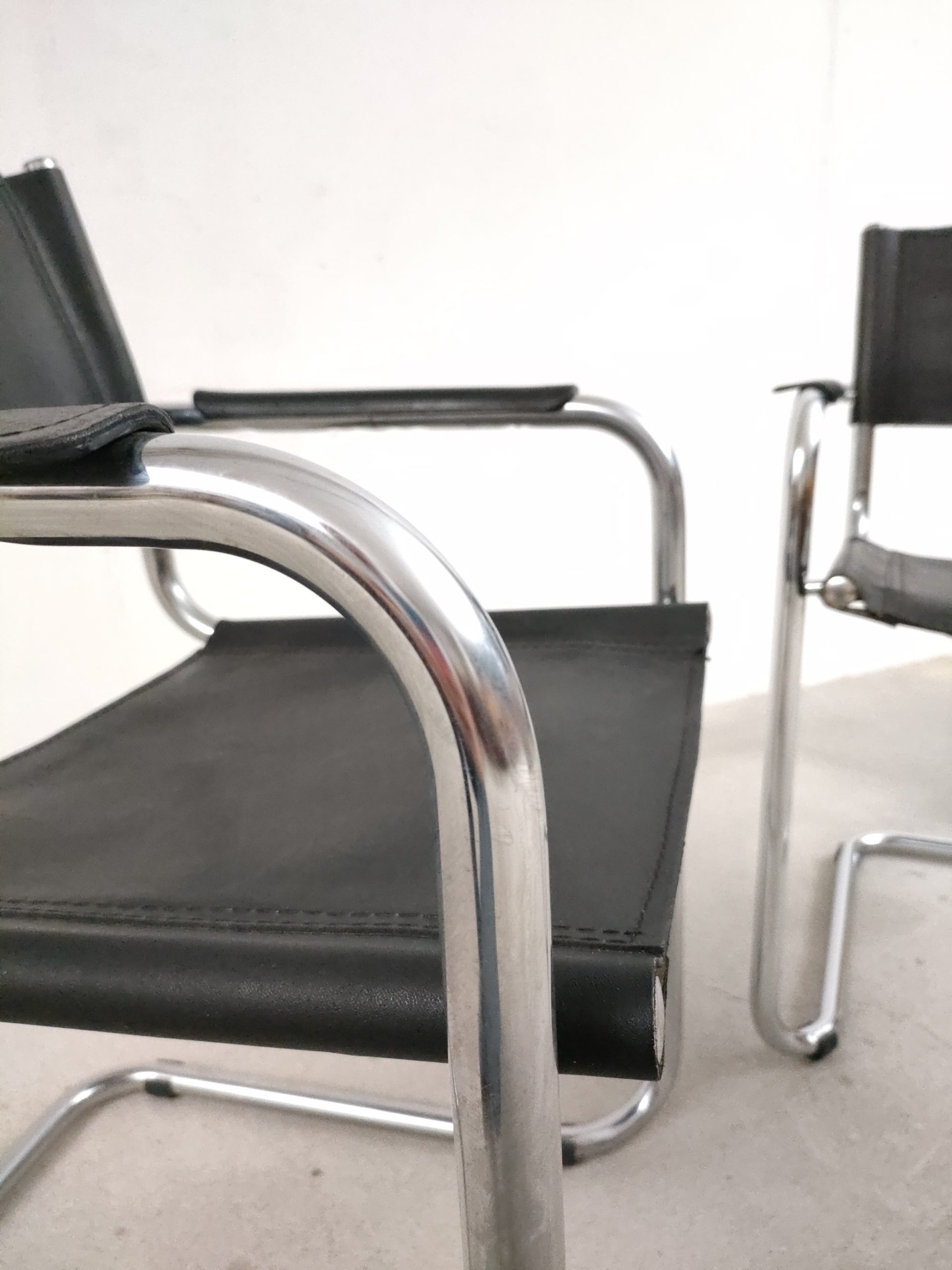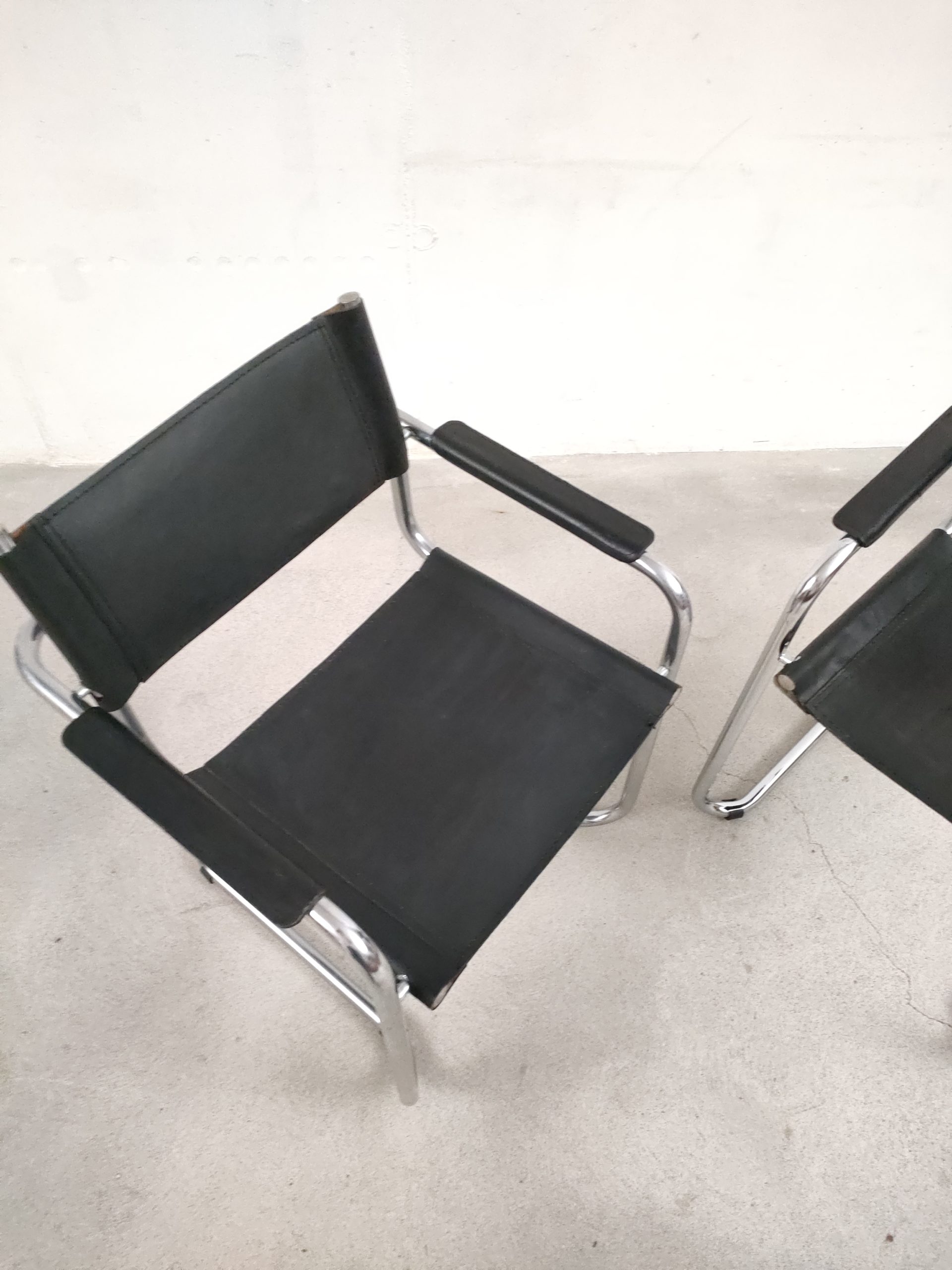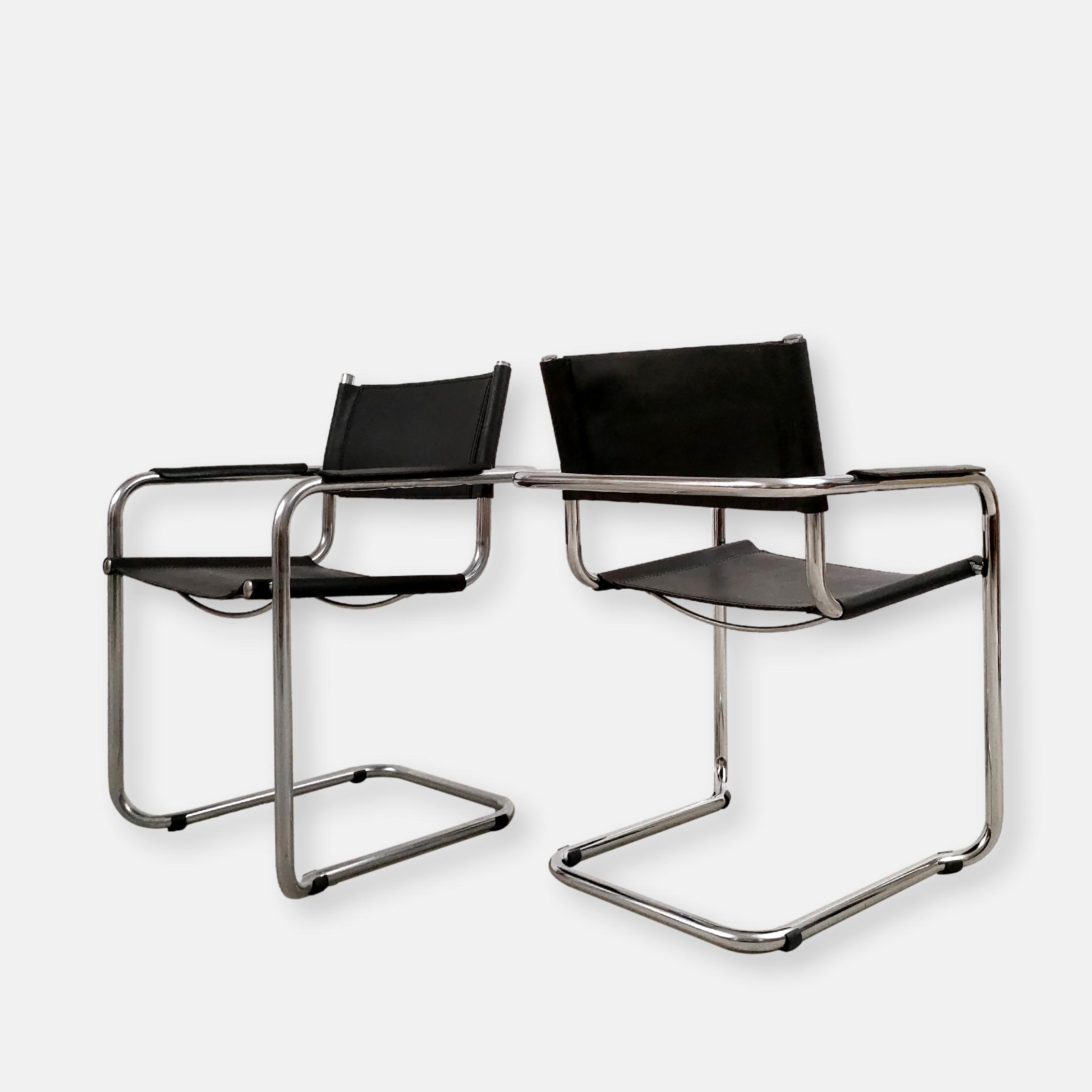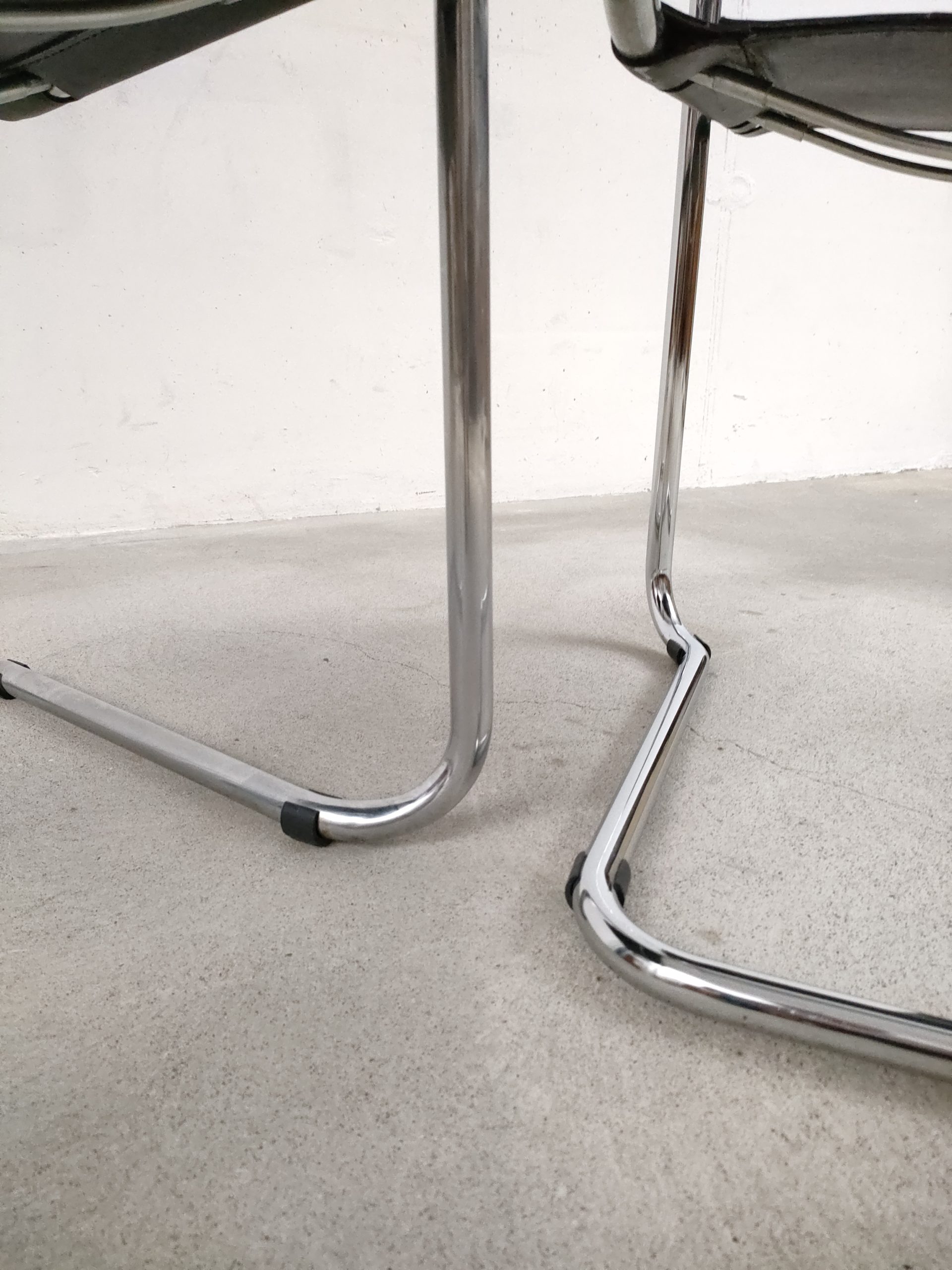 Produit venduPaire de chaises avec assise, dossier et accoudoirs en cuir et structure tubulaire en métal.