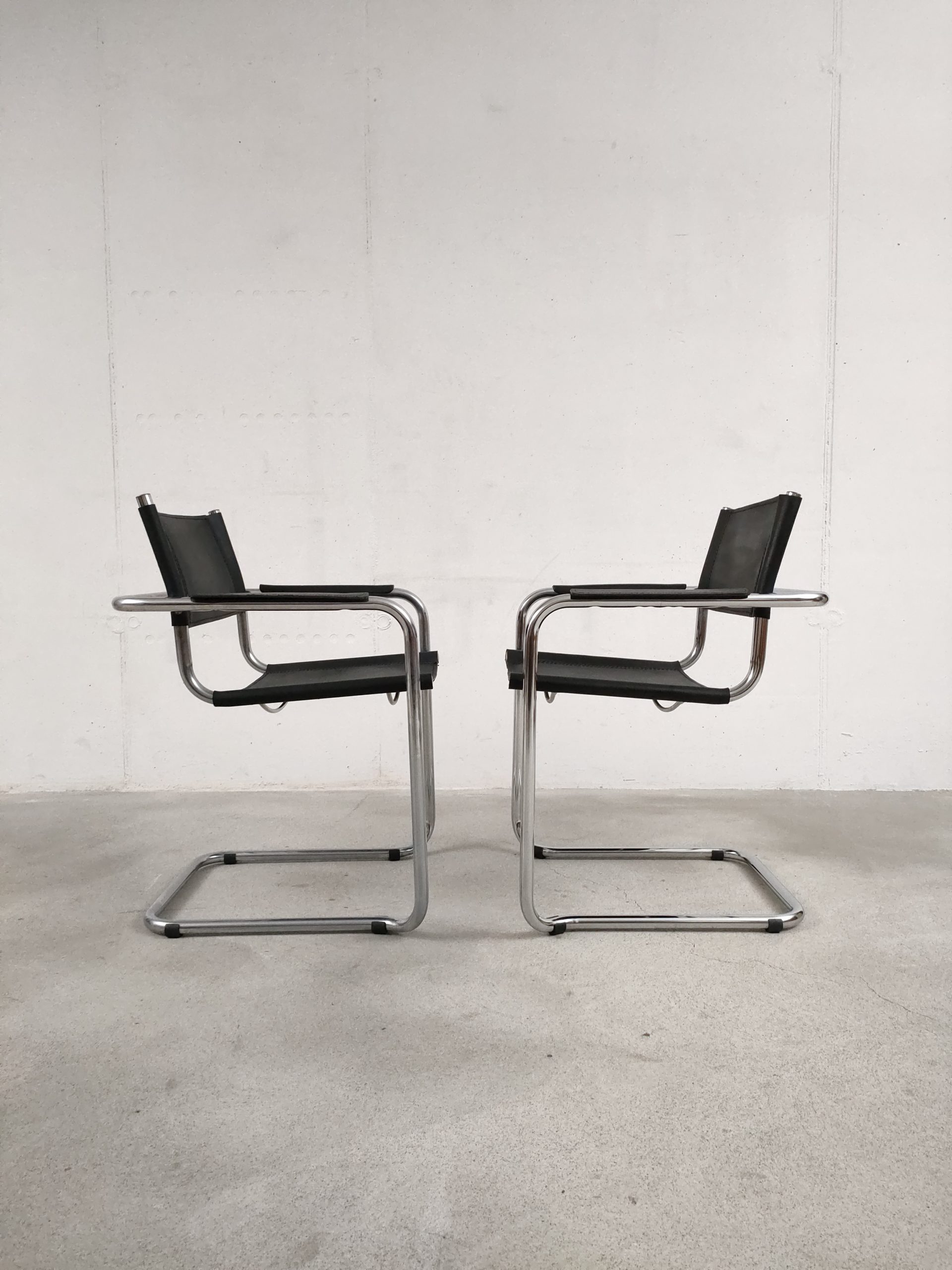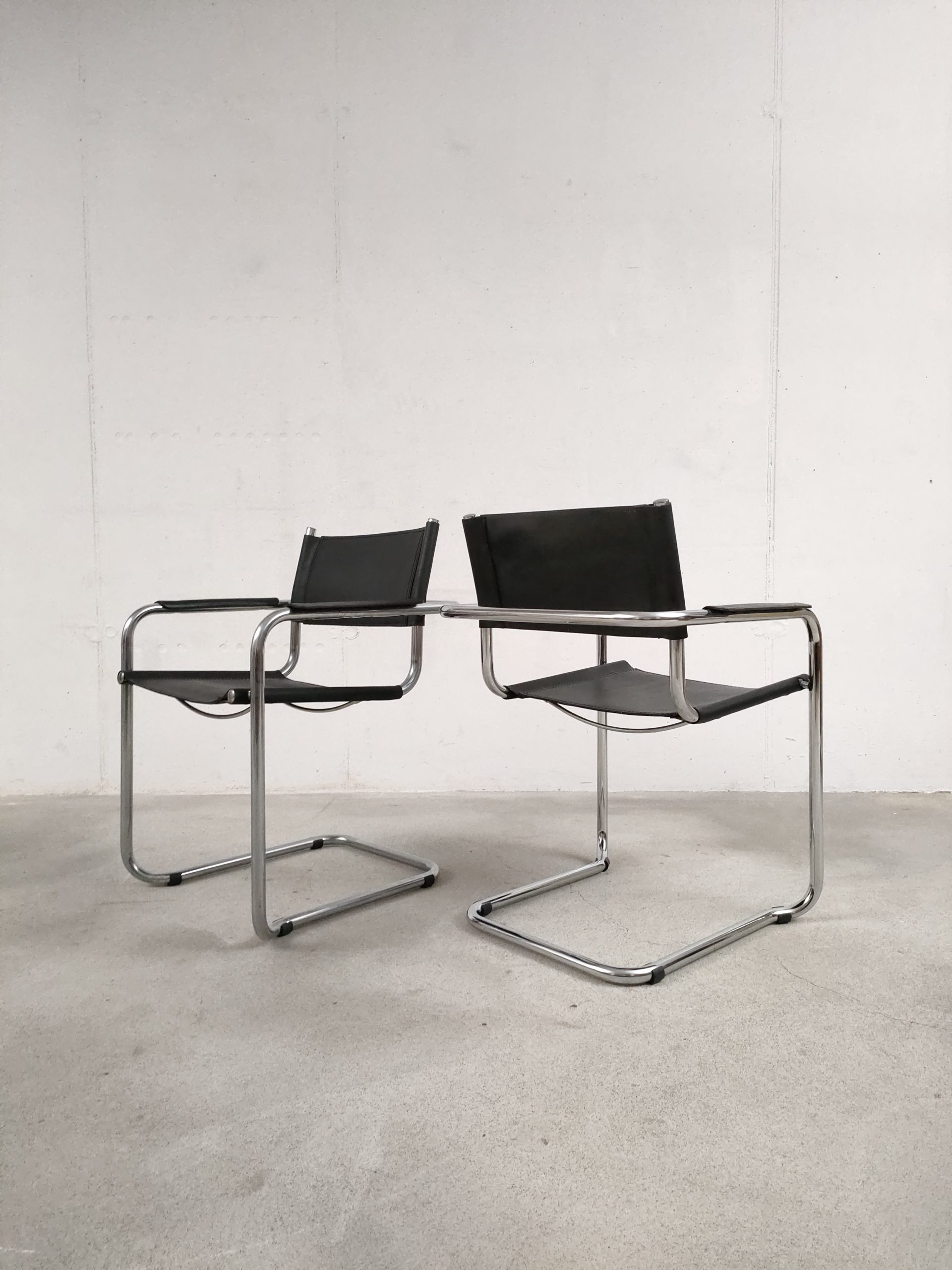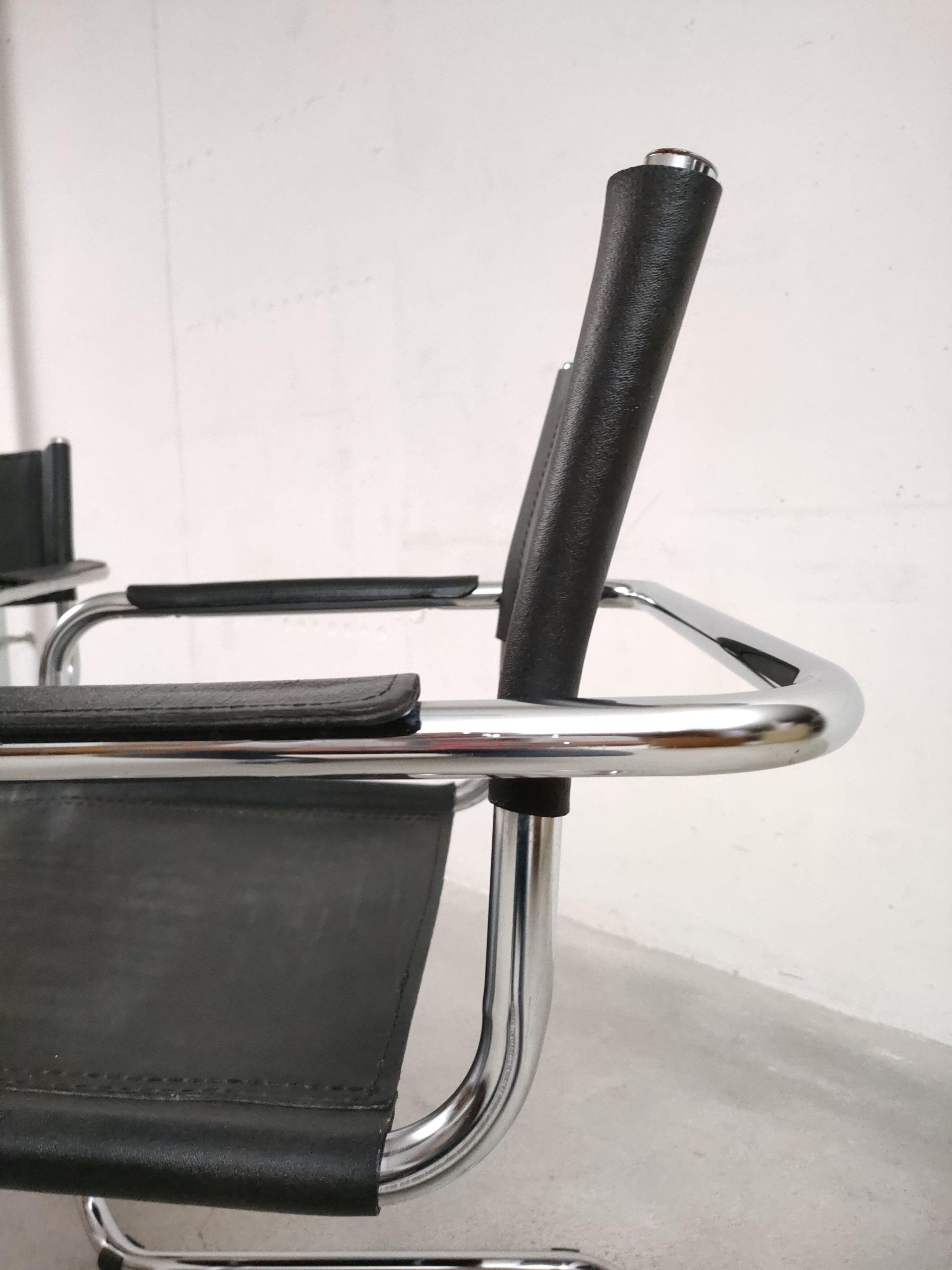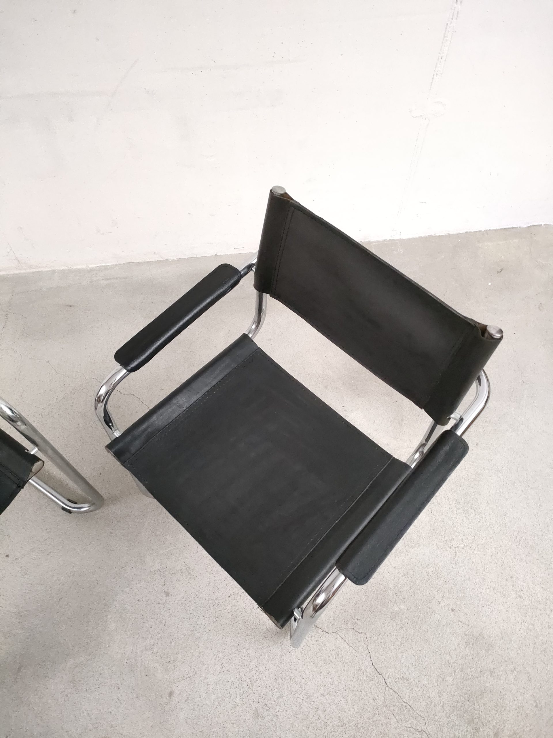 Produit venduPaire de chaises avec assise, dossier et accoudoirs en cuir et structure tubulaire en métal.