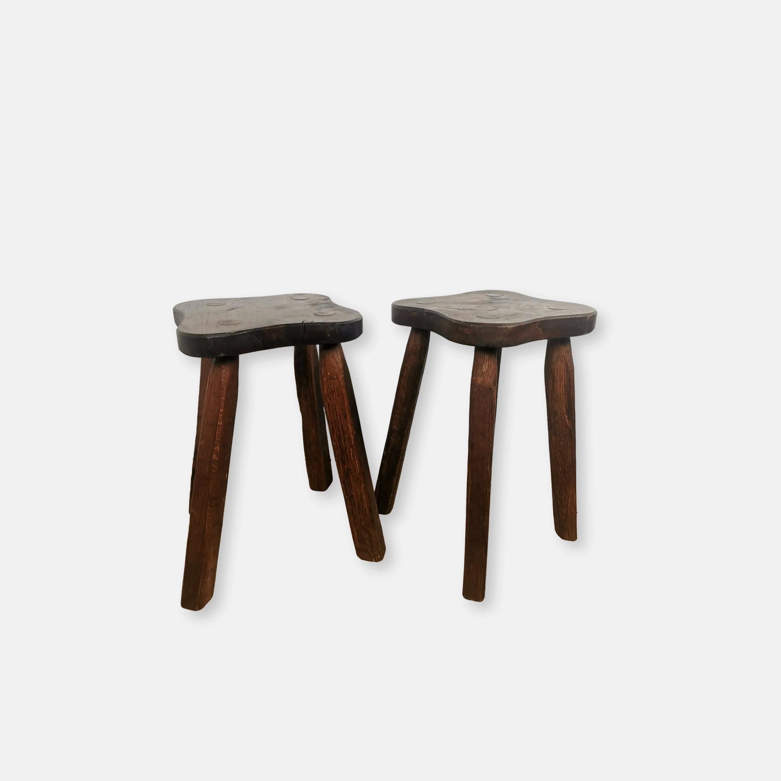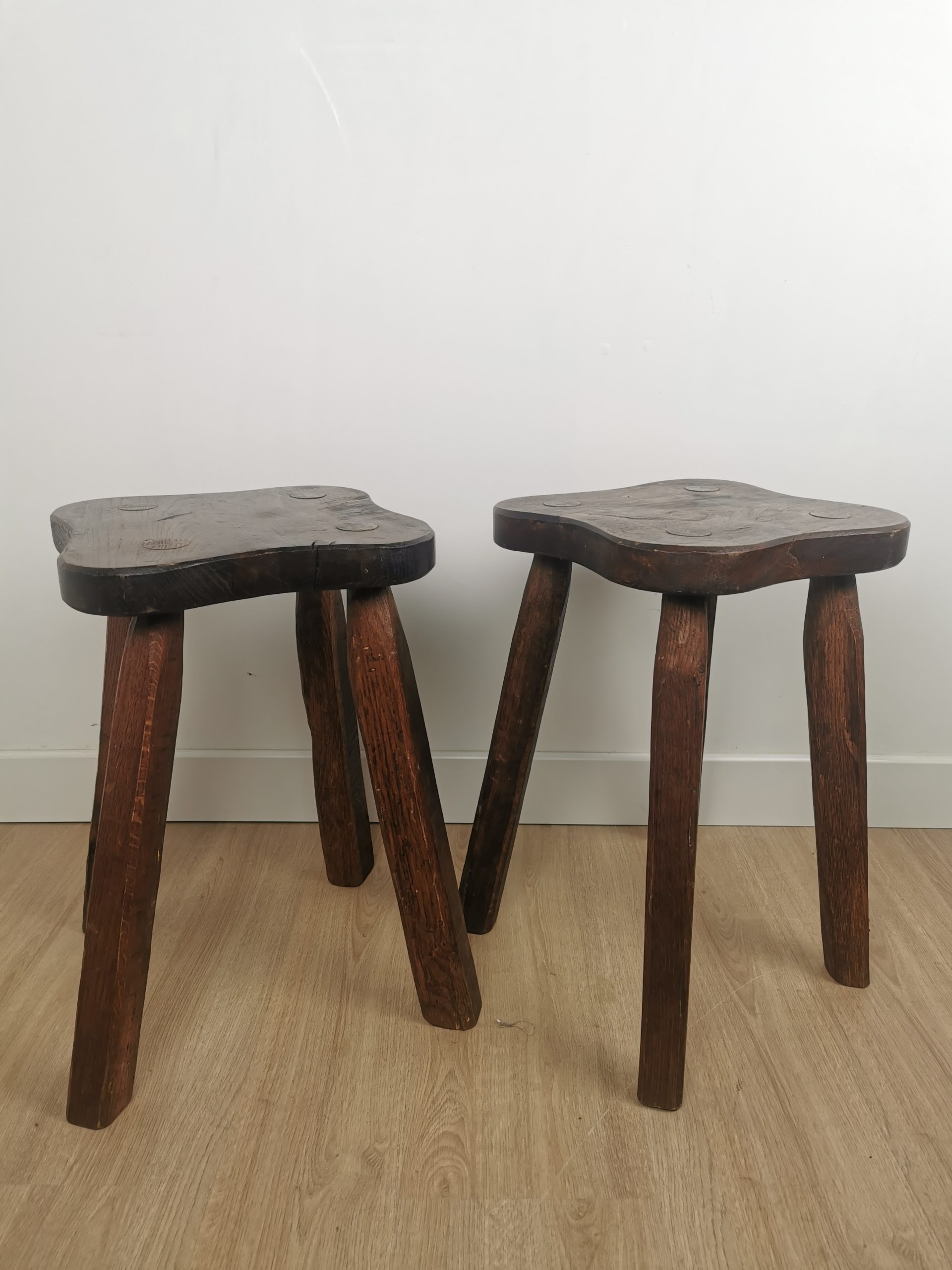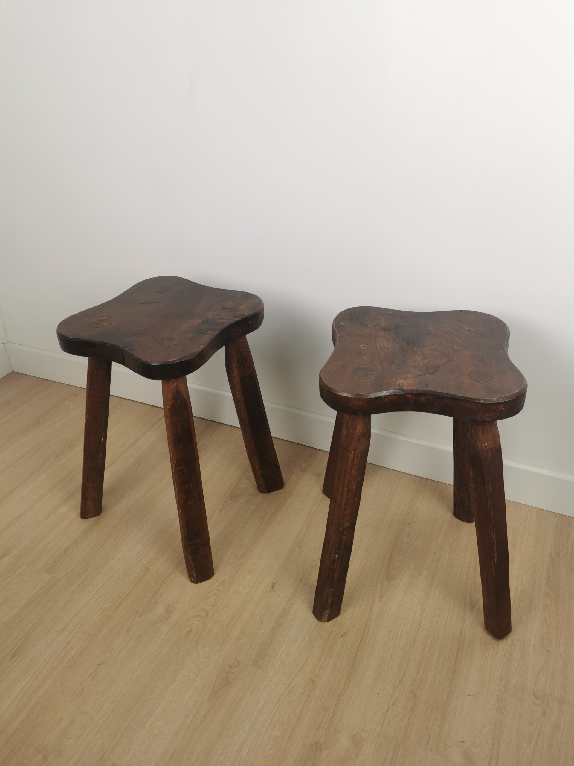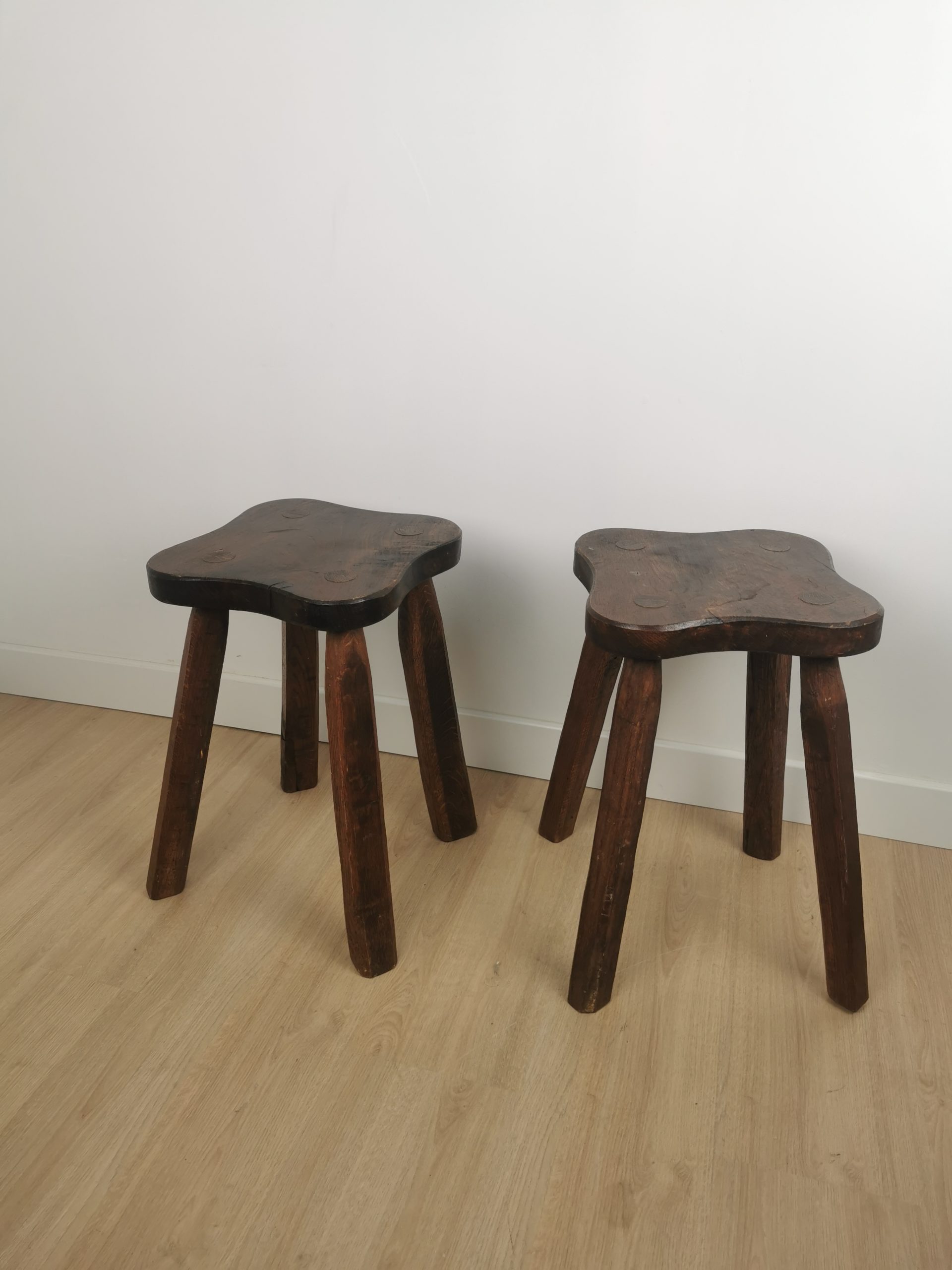 Produit venduPaire de tabourets anciens brutaliste en bois massif.
