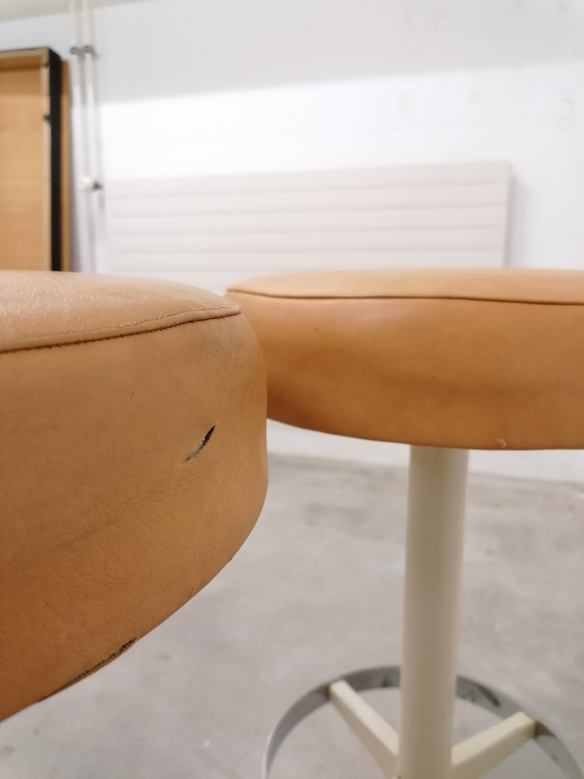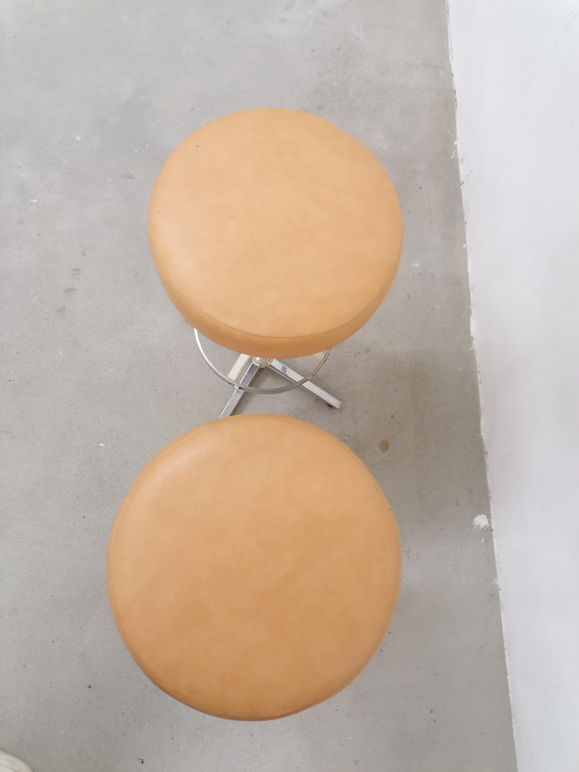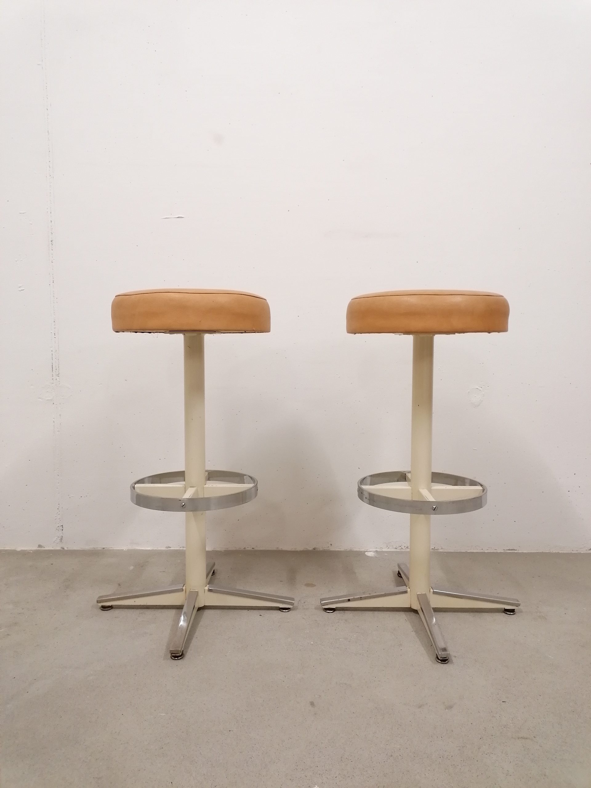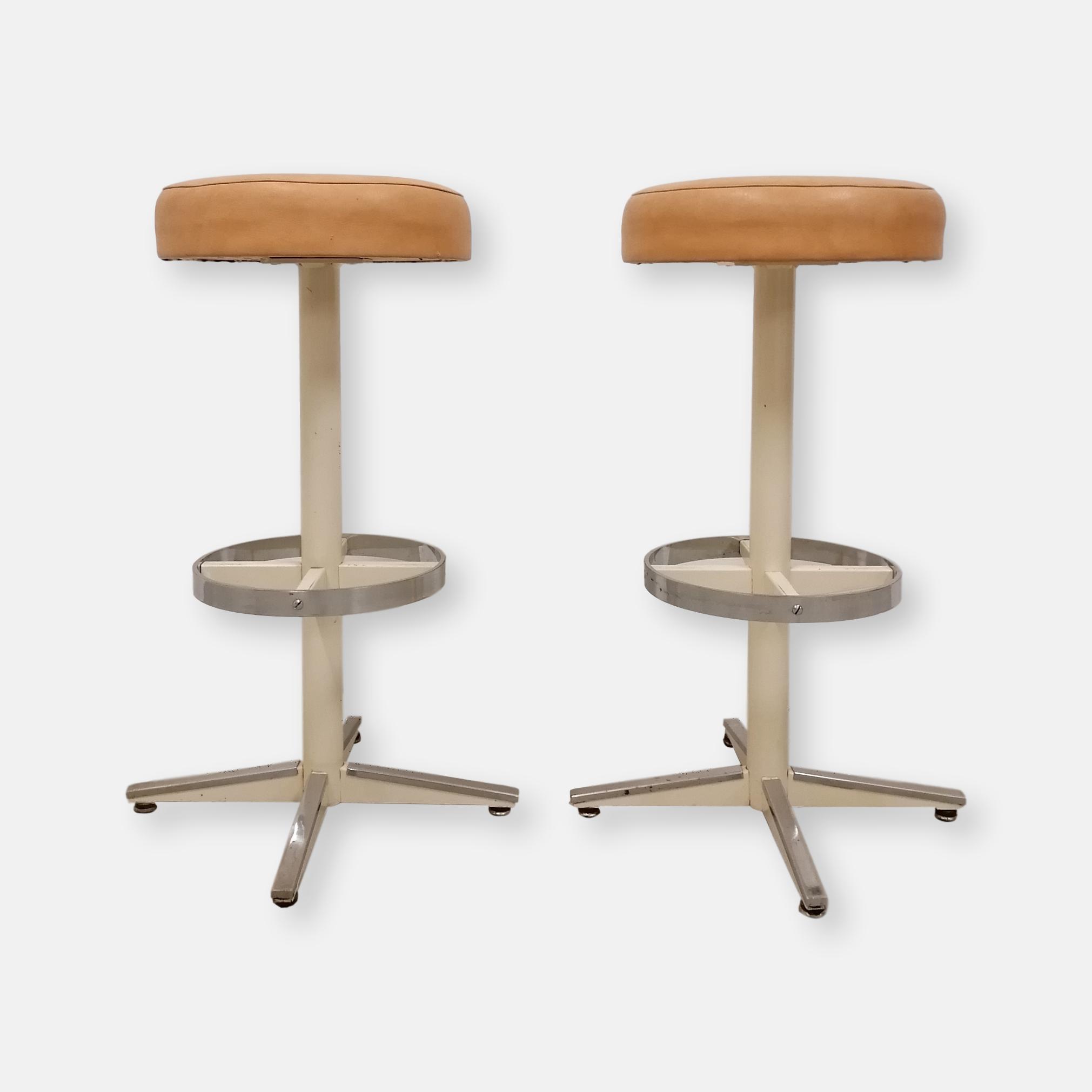 Produit venduPaire de tabourets de bar vintage. Structure en métal avec base en étoile et repose-pieds circulaire. Assise en simili-cuir. Quelques traces d’usure sur la structure en métal et sur les assises (voir photos). Les tabourets sont stables et fonctionnels.