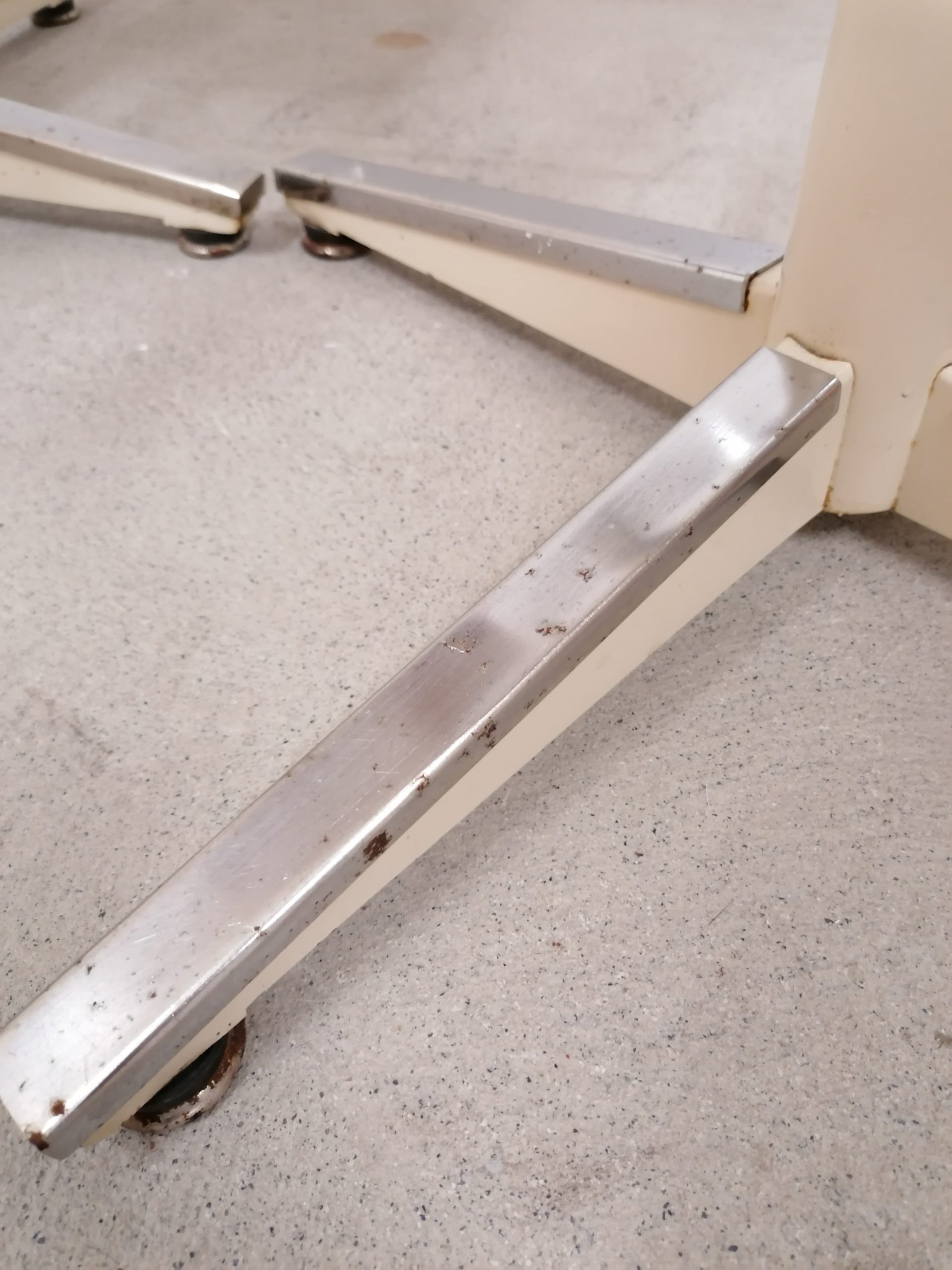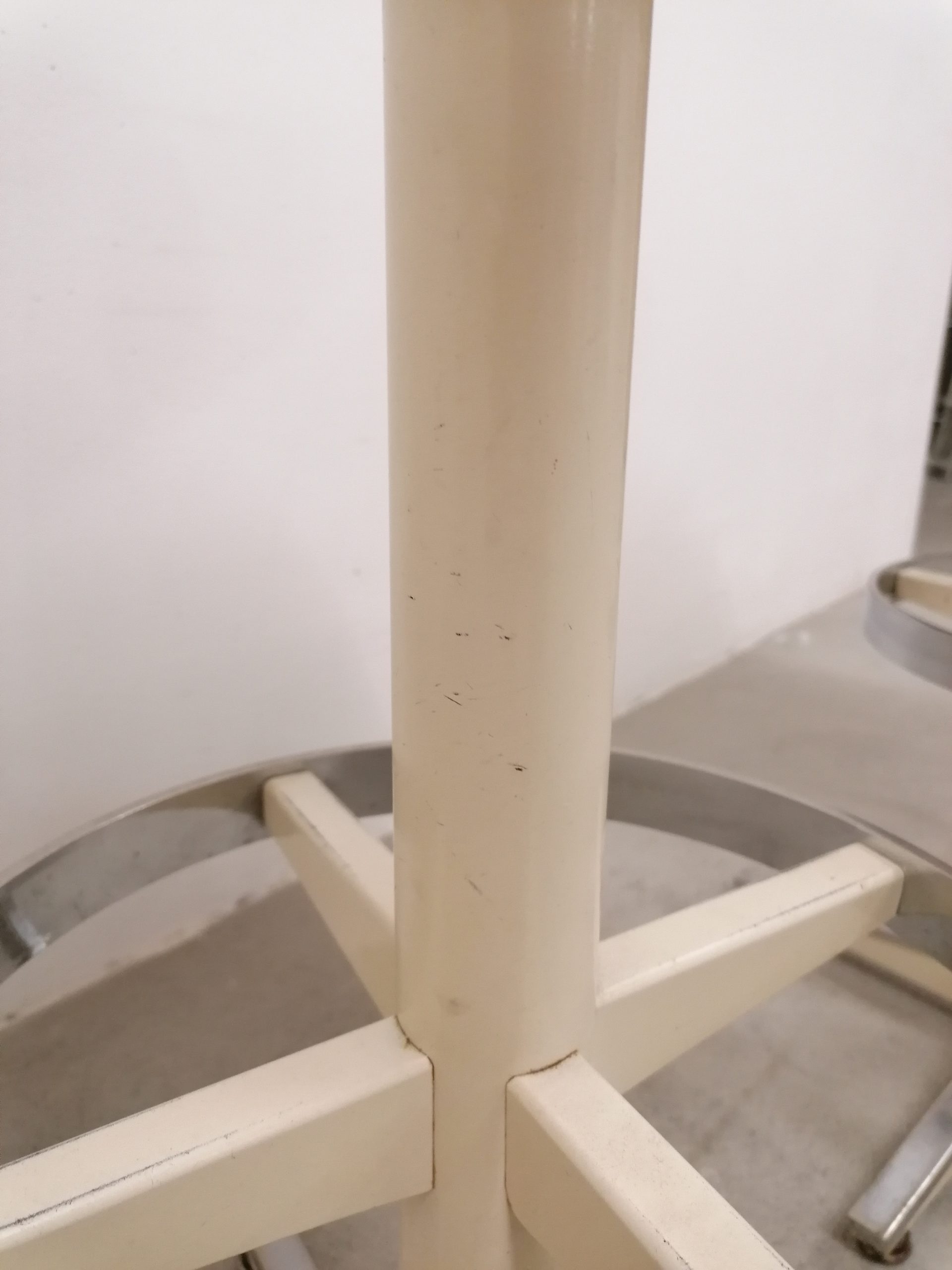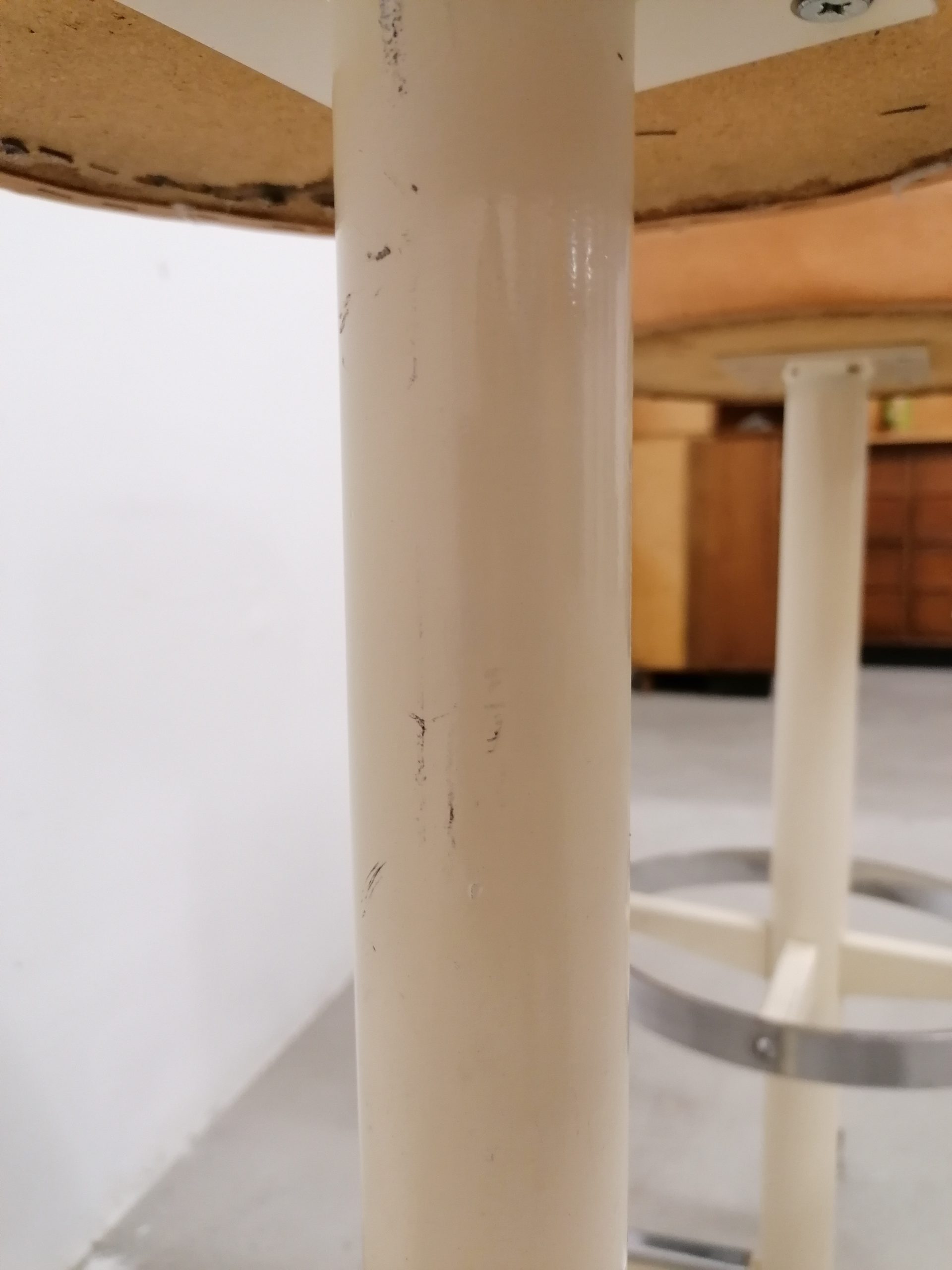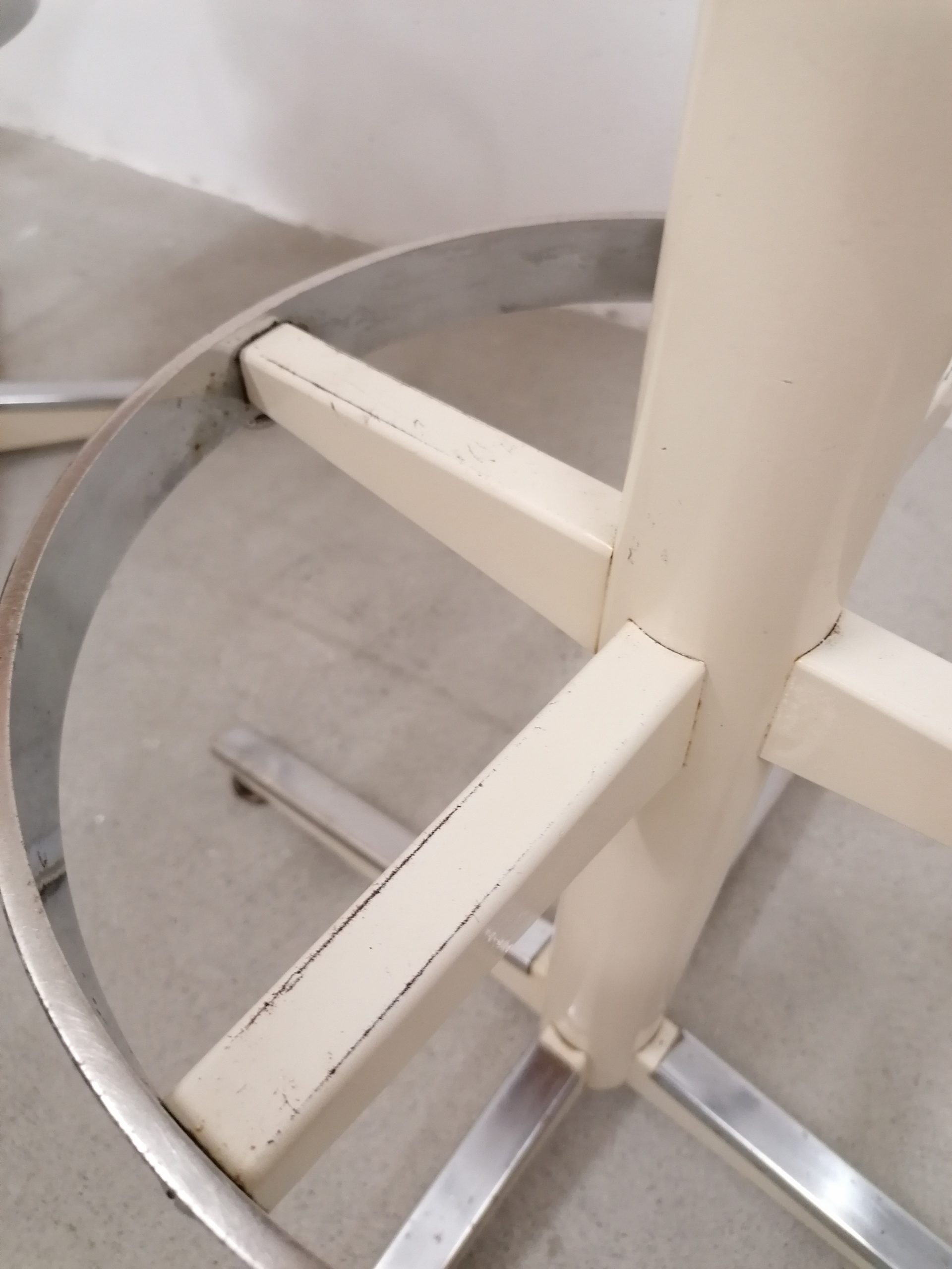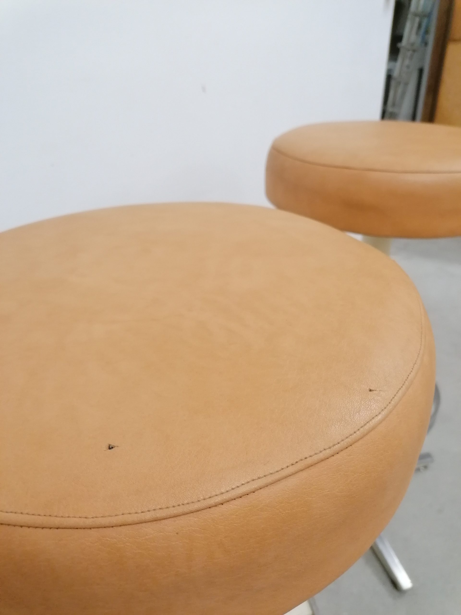 Produit venduPaire de tabourets de bar vintage. Structure en métal avec base en étoile et repose-pieds circulaire. Assise en simili-cuir. Quelques traces d’usure sur la structure en métal et sur les assises (voir photos). Les tabourets sont stables et fonctionnels.