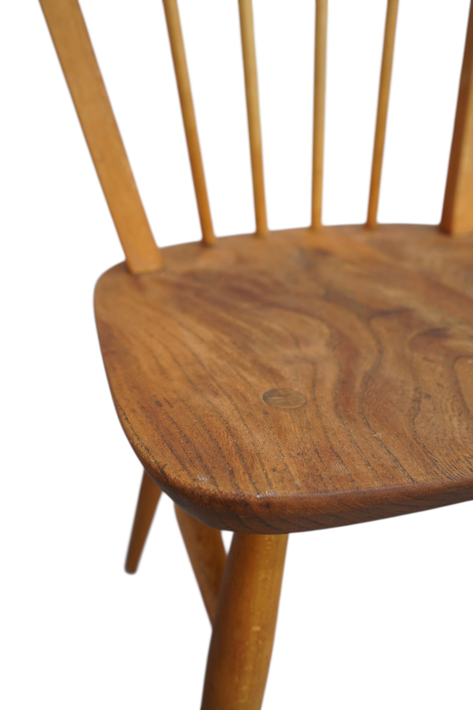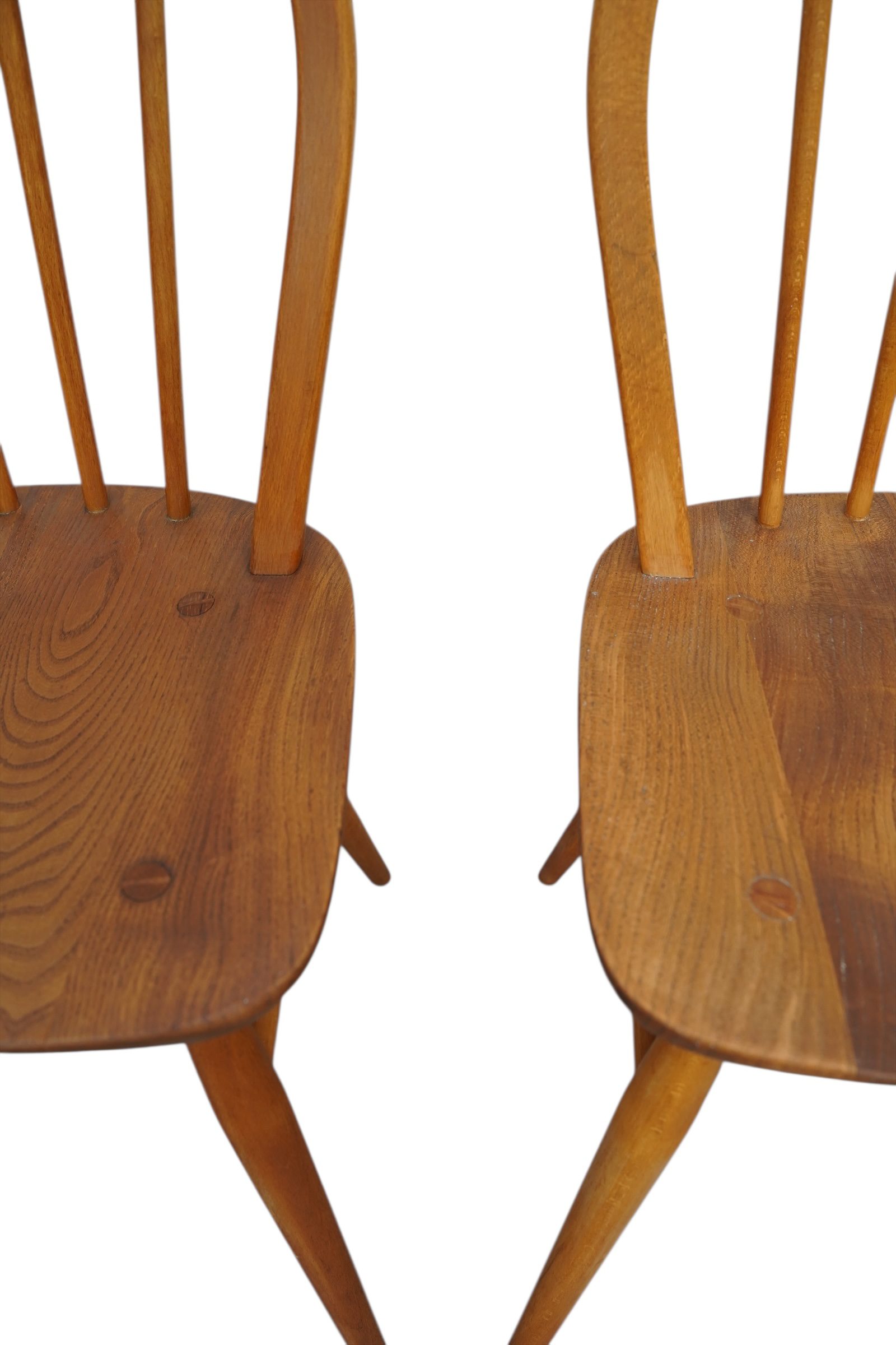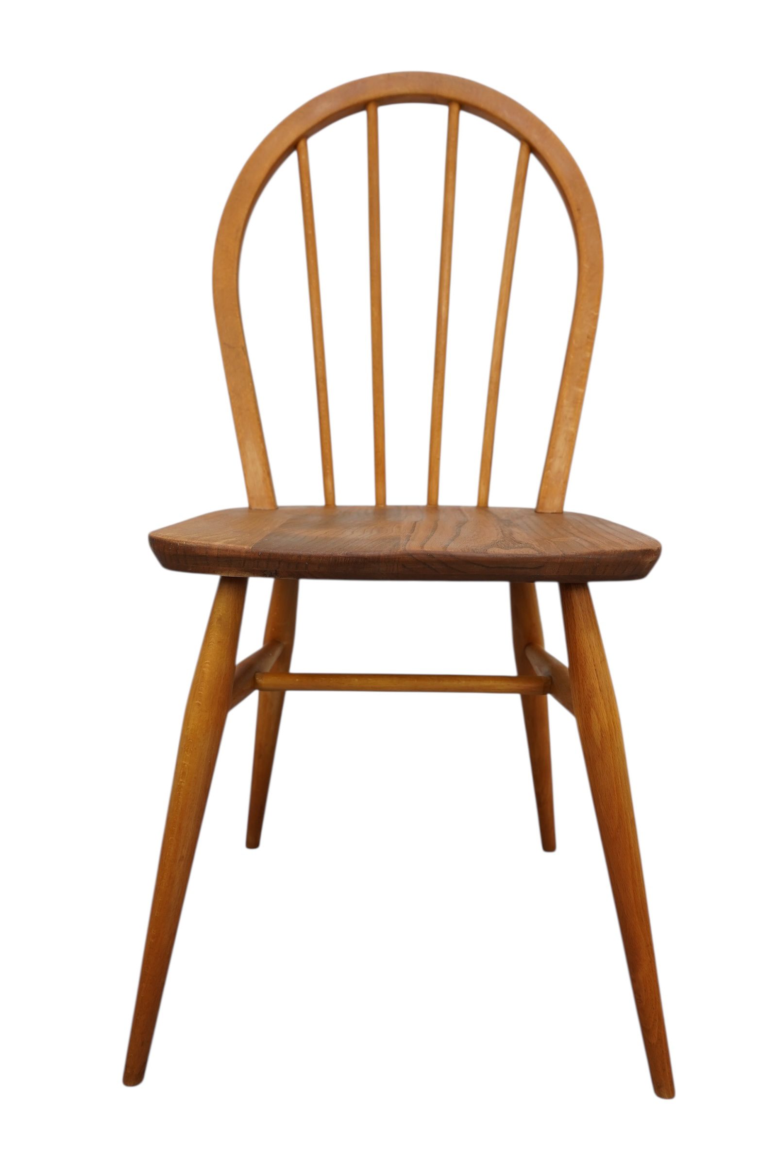 Série de 4 chaises Windsor Goldsmith Modèle 400 par Lucian Ercolani pour Ercol. Ces fauteuils en bois d’orme de couleurs blonde furent conçues dans les années 1960′ en Angleterre. Elles présentent un dossier incurvé en arc de cercle, six fuseaux tournés, un siège sculpté en forme de selle et des pieds effilés. Les chaises sont fabriquées à l’aide de techniques traditionnelles, notamment des joints à cheville pour les pieds et le dossier.