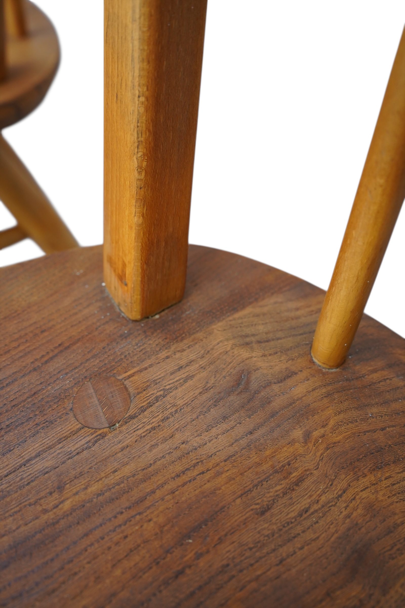 C’est à High Wycombe, la « capitale de la chaise » en Angleterre, que Lucian Ercolani a créé sa propre fabrique de chaises en 1920. Il utilise le bois d’orme pour fabriquer ses chaises et ses canapés. Un type de bois dur que la plupart des fabricants ignoraient parce qu’il était réputé impossible à travailler. Ercolani s’y est pourtant attelé, avec succès. L’estampille du fabricant est visible sur le dessous de l’assise.