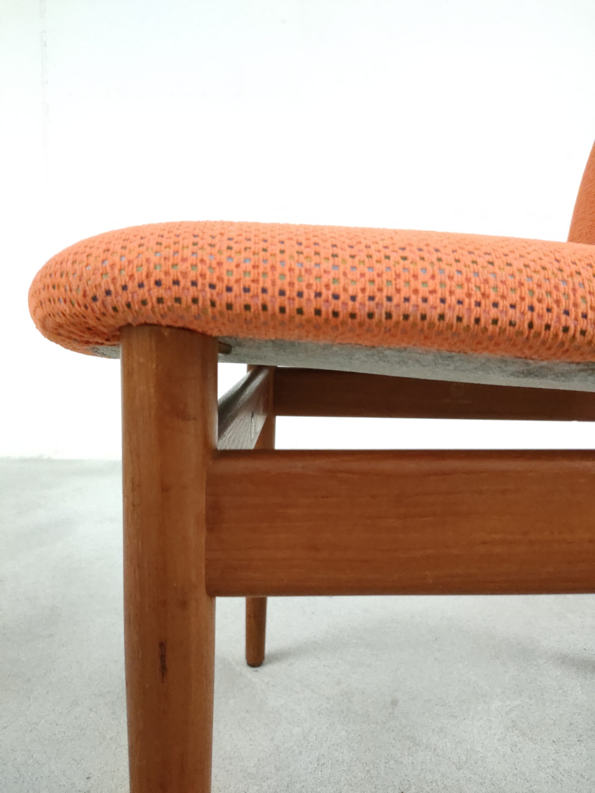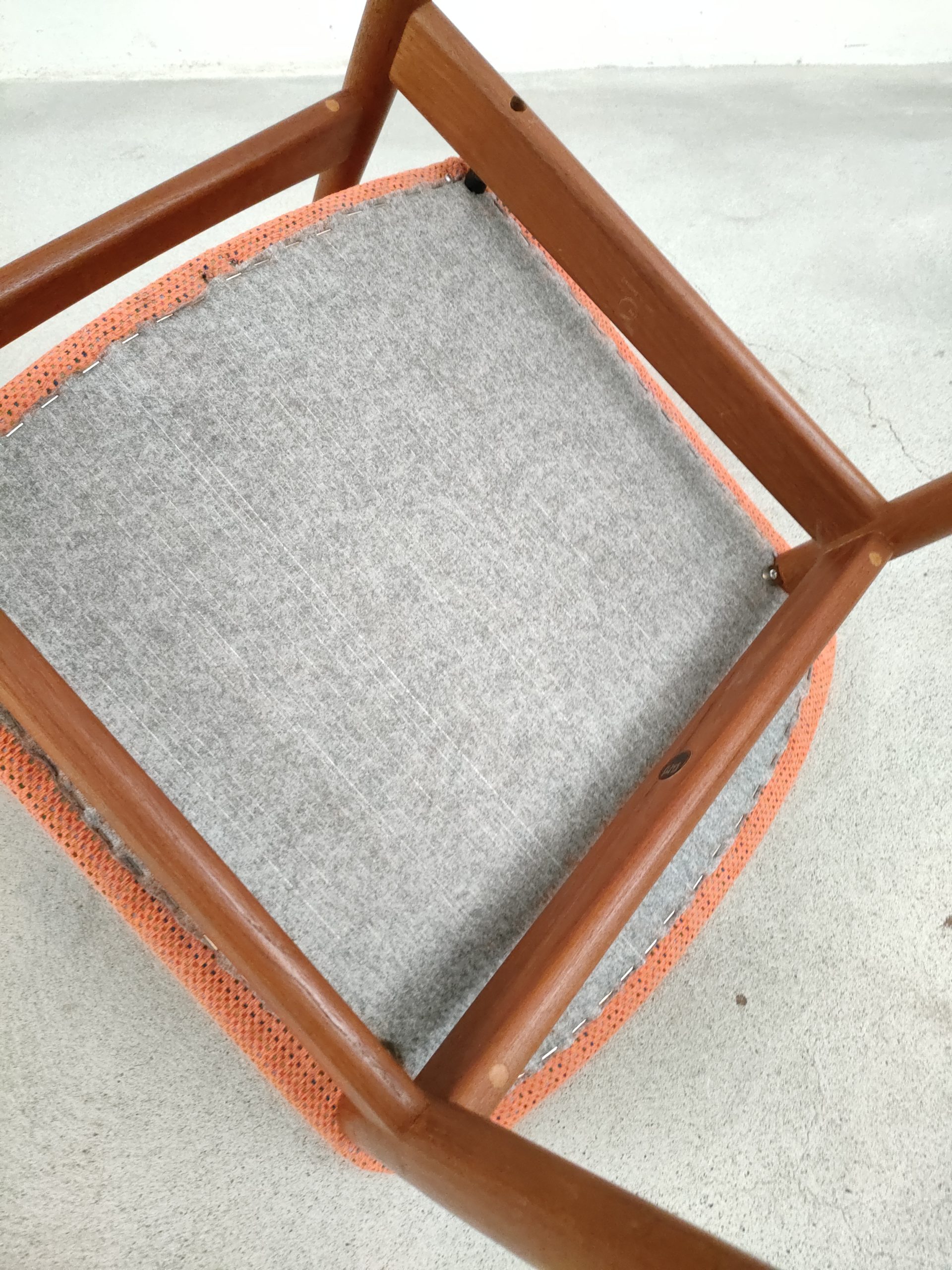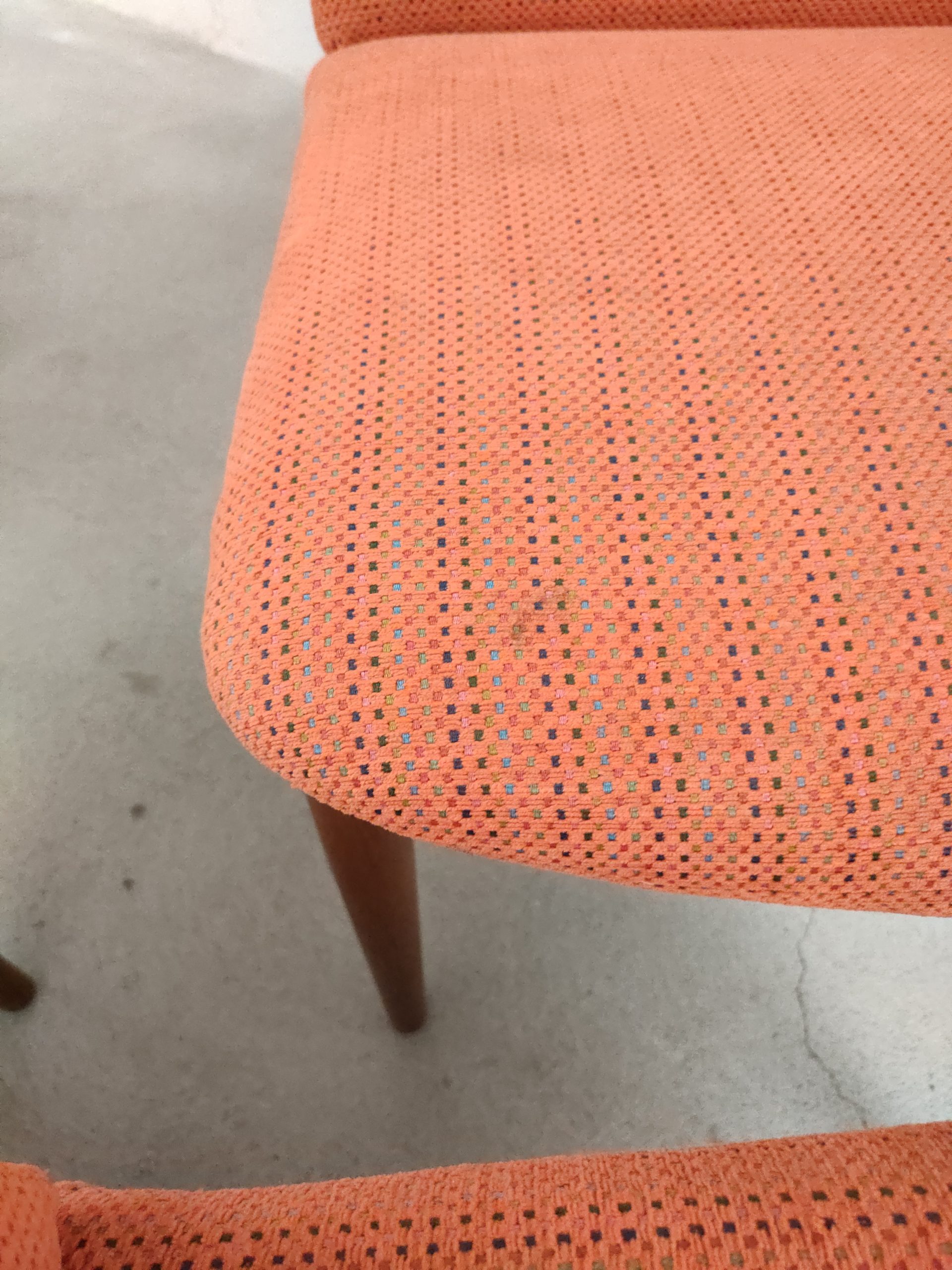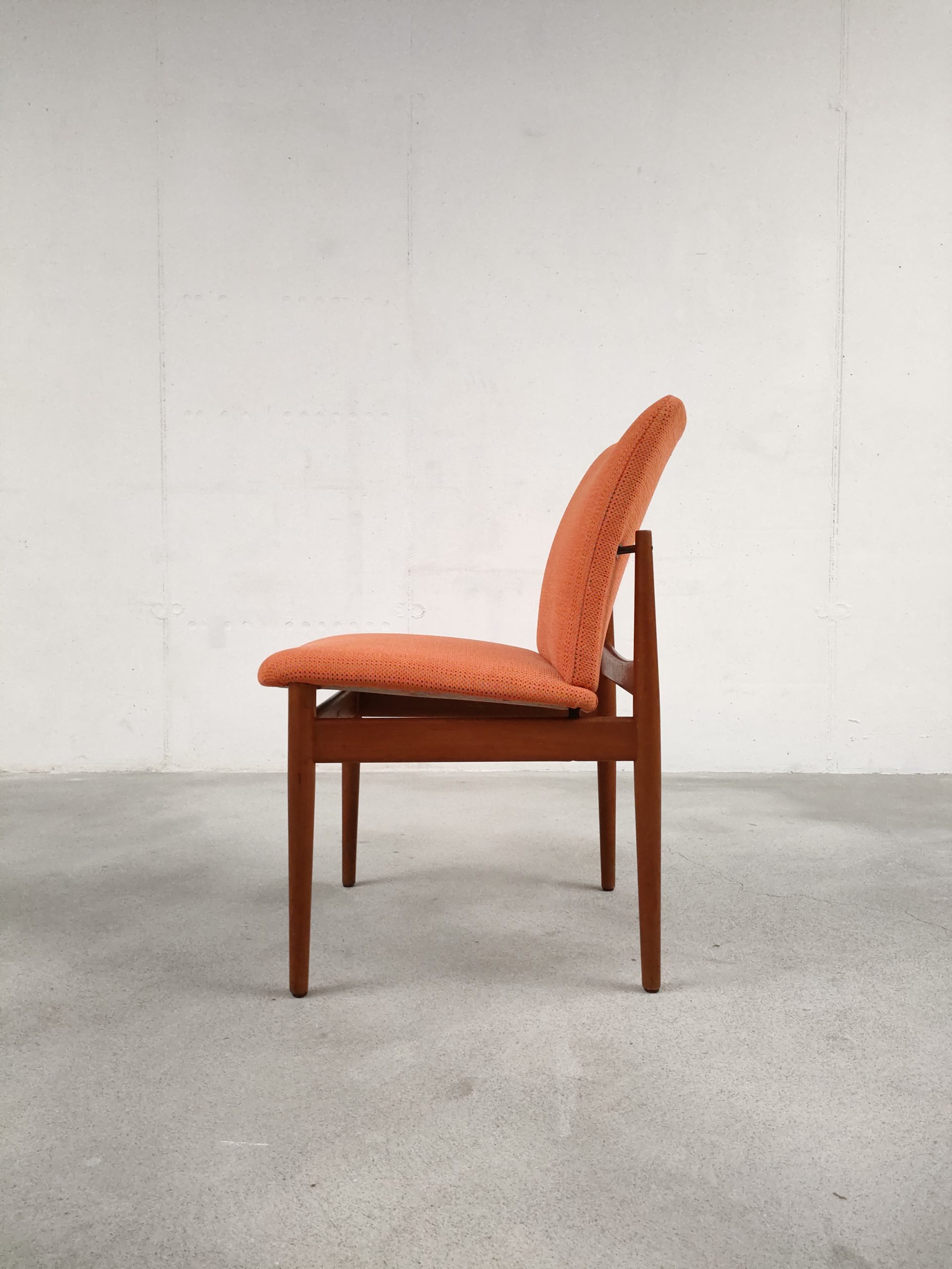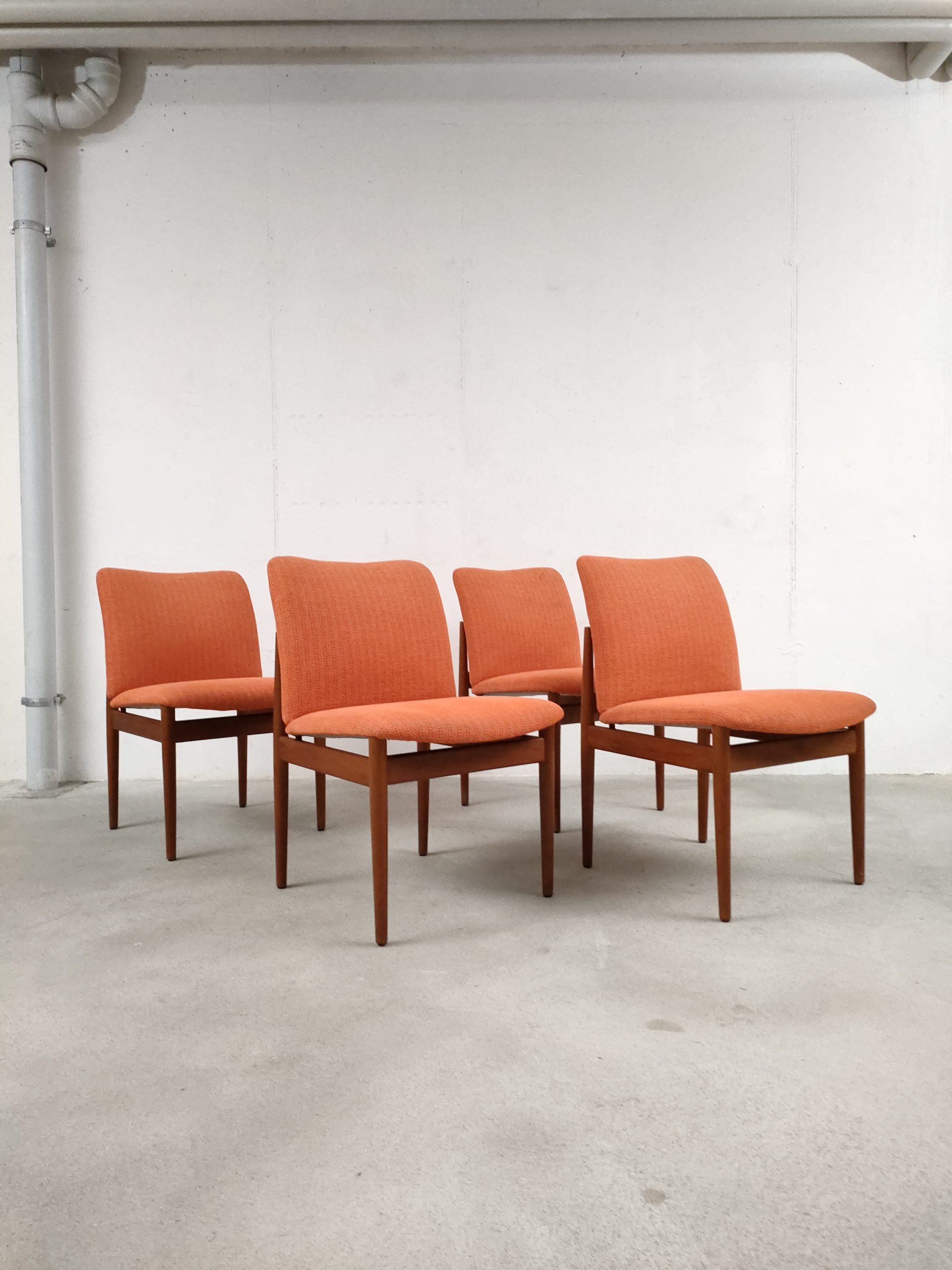 Produit venduSet de 4 chaises de salle à manger en teck et tissu couleur saumon dessinées par le designer Finn Juhl et produites par France & Sons Danemark. Quelques traces d’usure sur le bois et des légères traces sur le tissu d’une des 4 chaises (voir photos). La structure ainsi que l’assise sont en bon état. Stables et solides, elles sont confortables et très élégantes. Hauteur de l’assise: 49 cm.