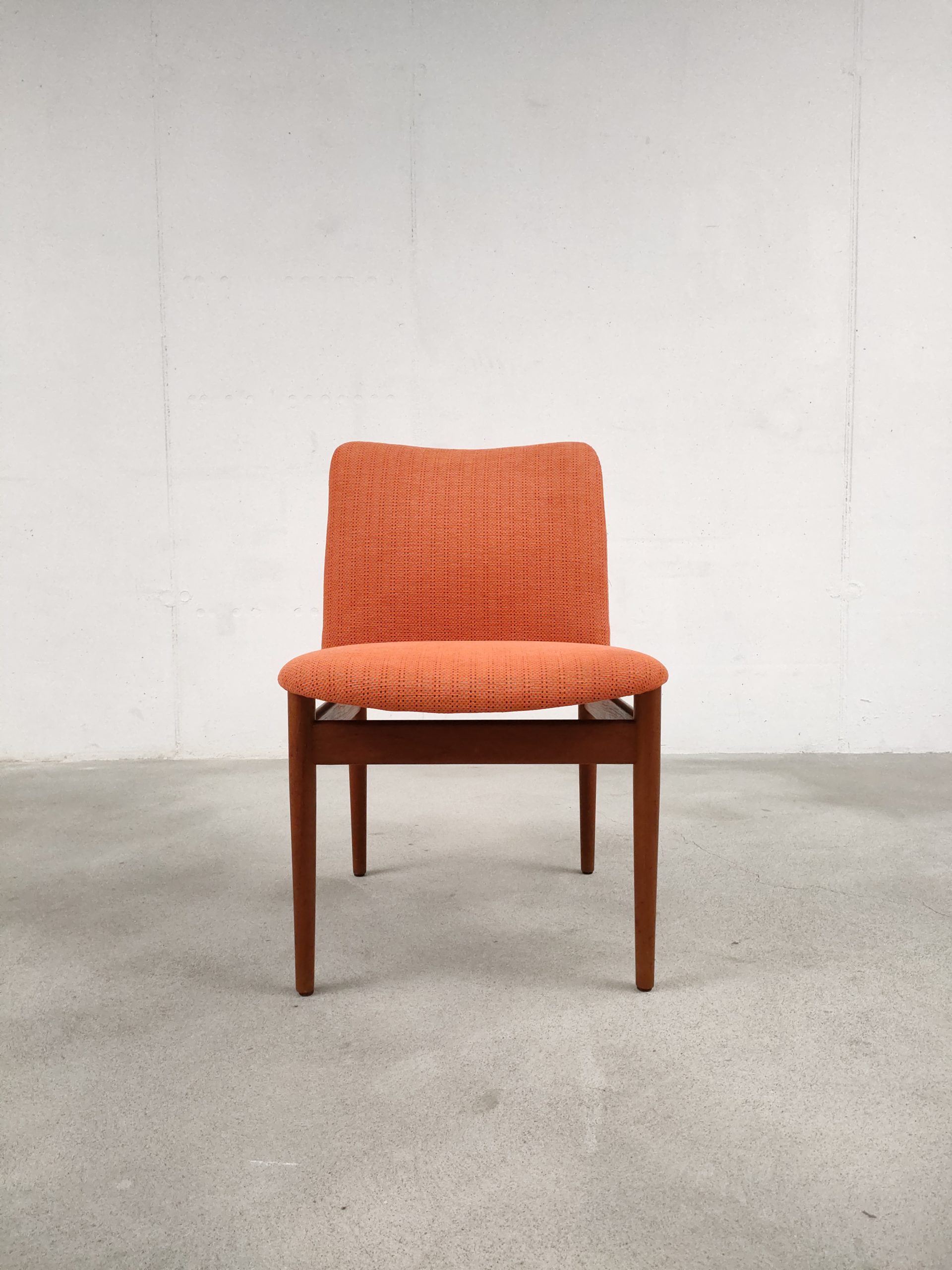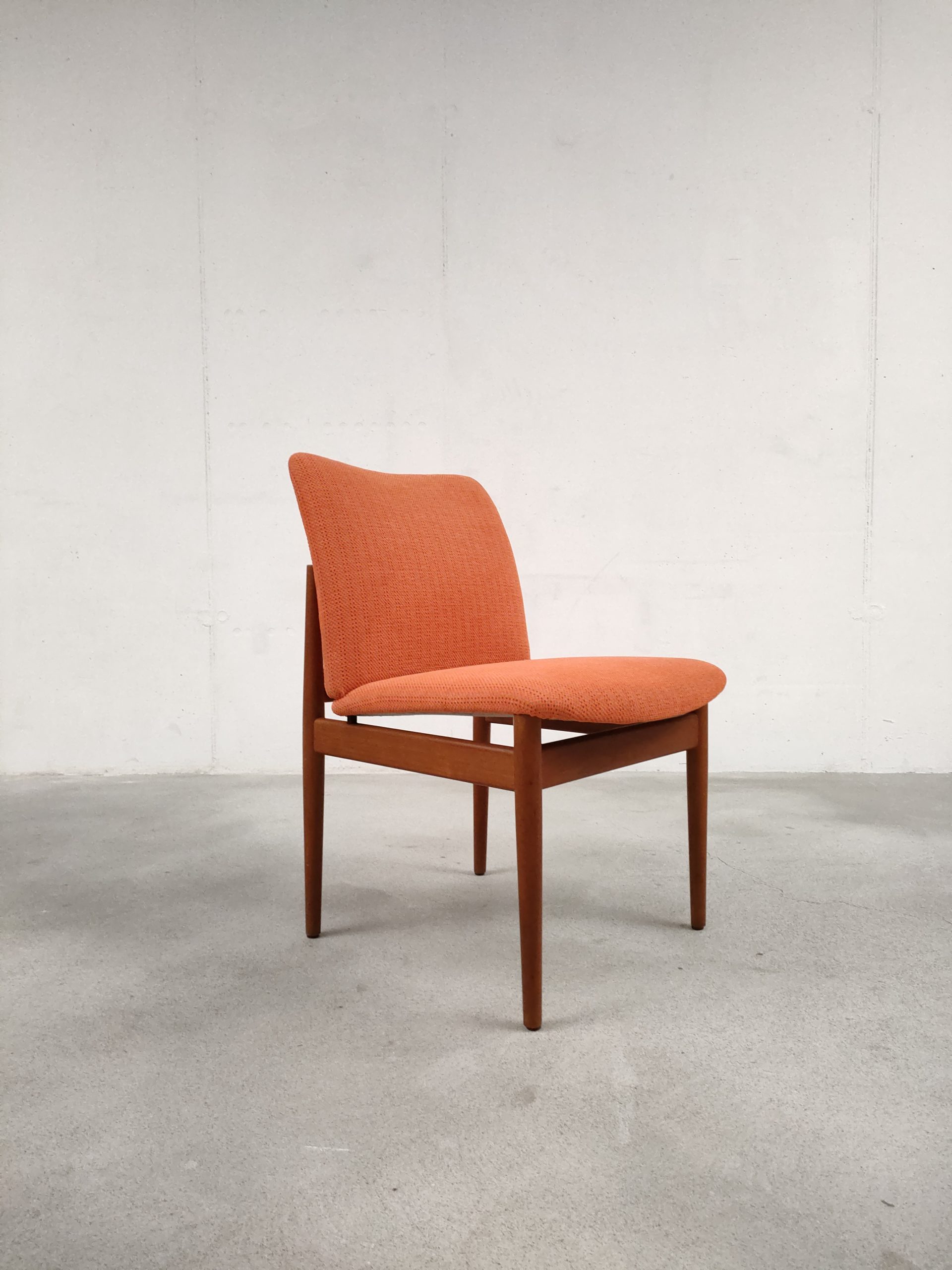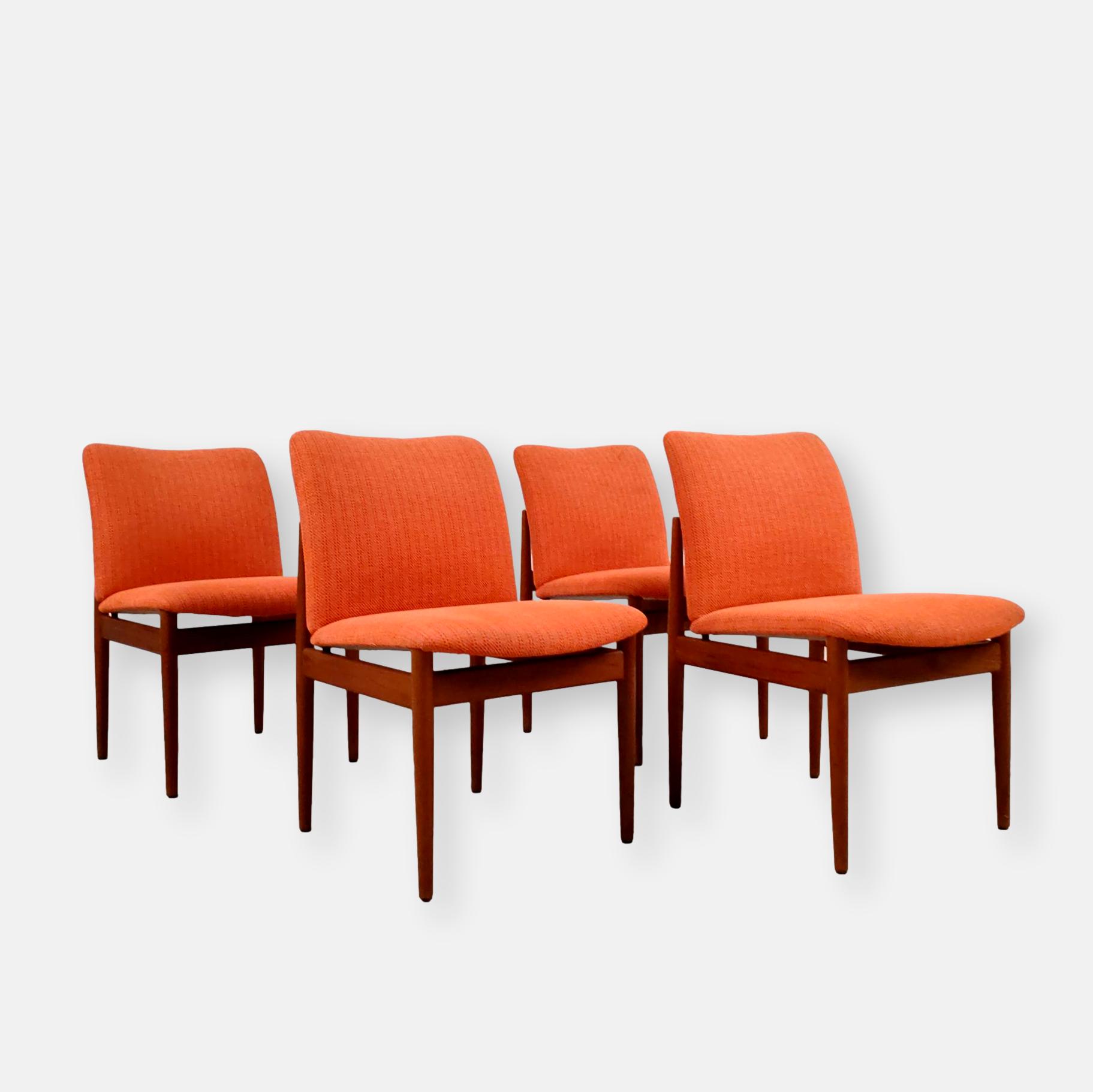 Set de 4 chaises de salle à manger en teck et tissu couleur saumon dessinées par le designer Finn Juhl et produites par France & Sons Danemark. Quelques traces d’usure sur le bois et des légères traces sur le tissu d’une des 4 chaises (voir photos). La structure ainsi que l’assise sont en bon état. Stables et solides, elles sont confortables et très élégantes. Hauteur de l’assise: 49 cm.
