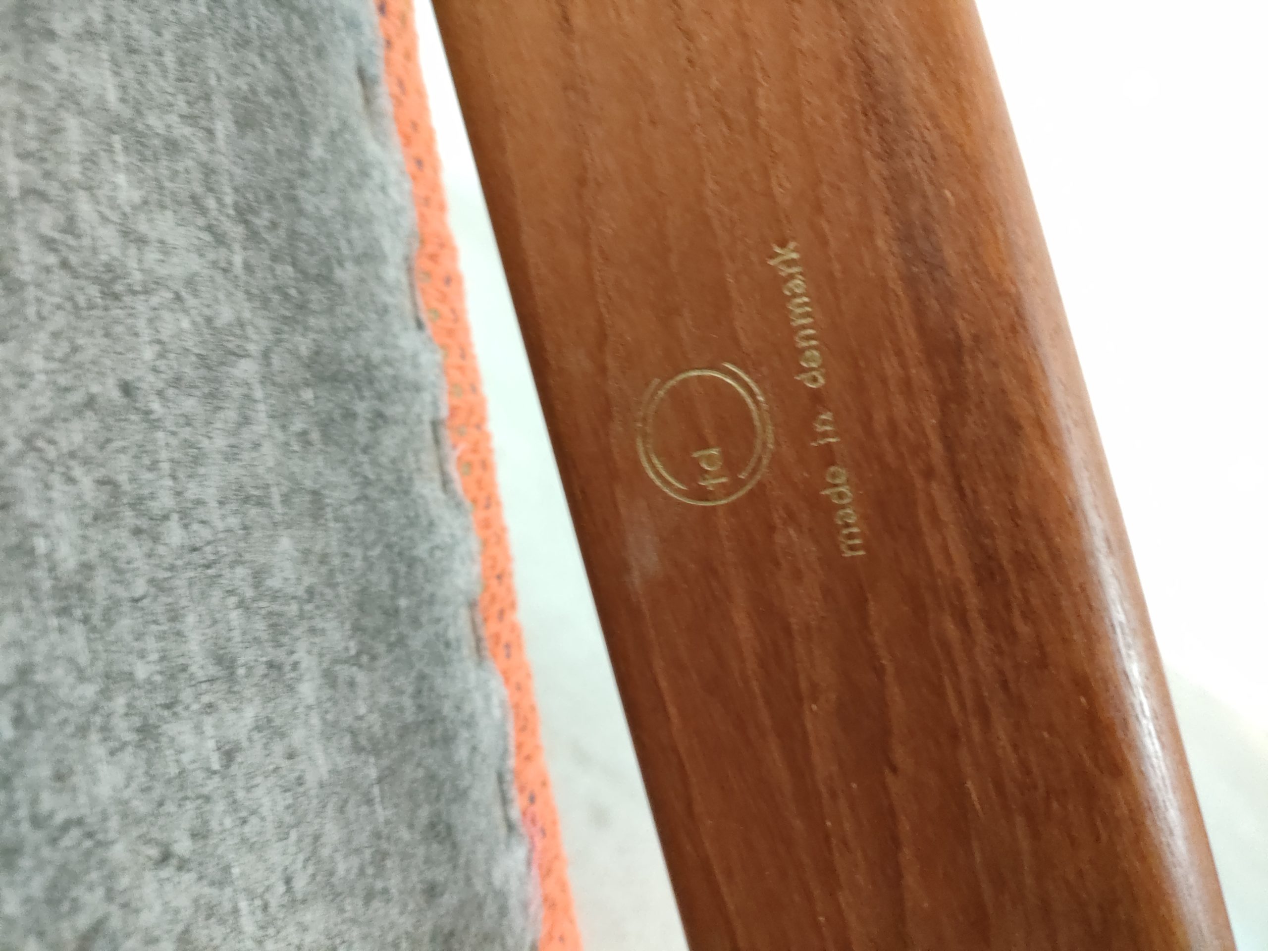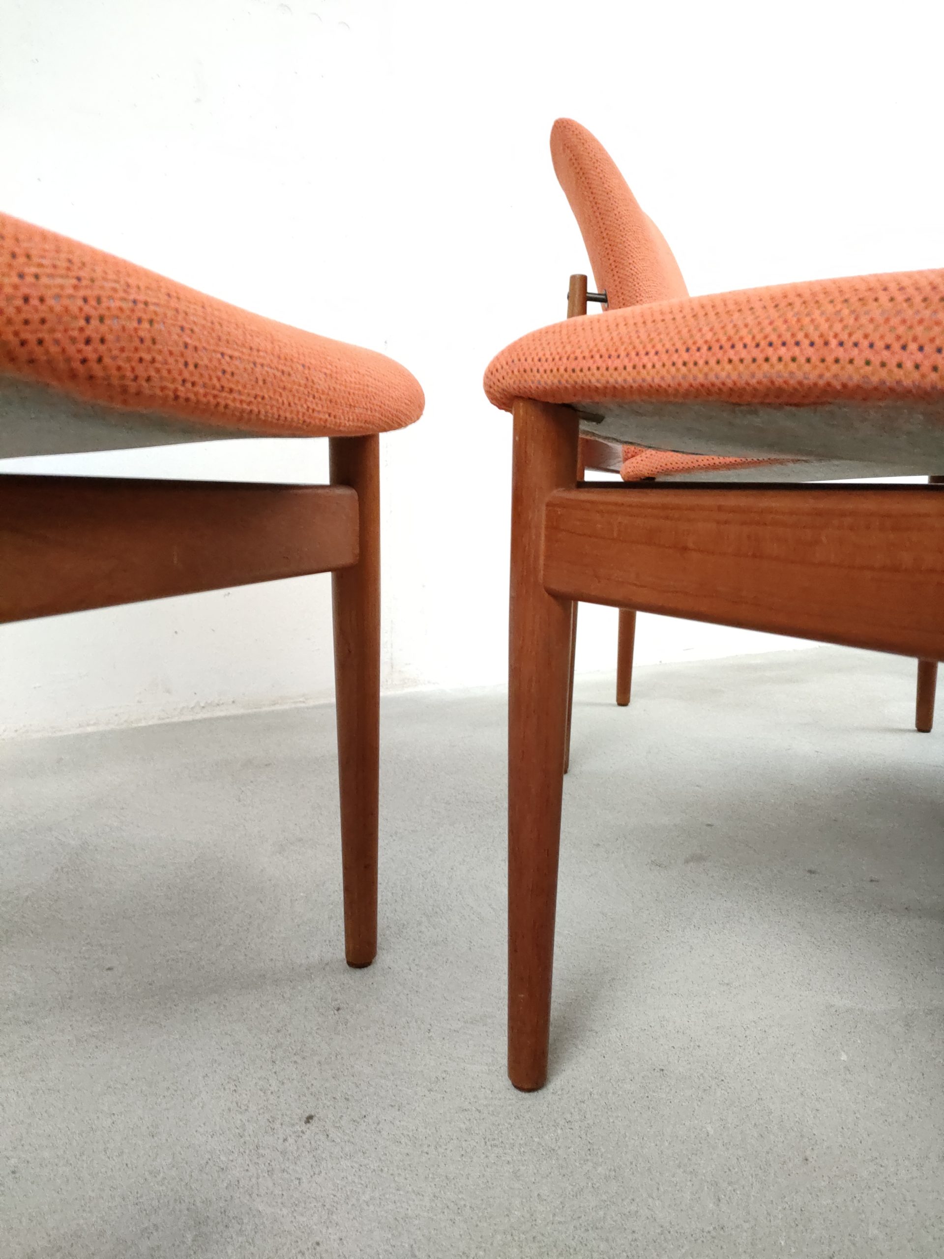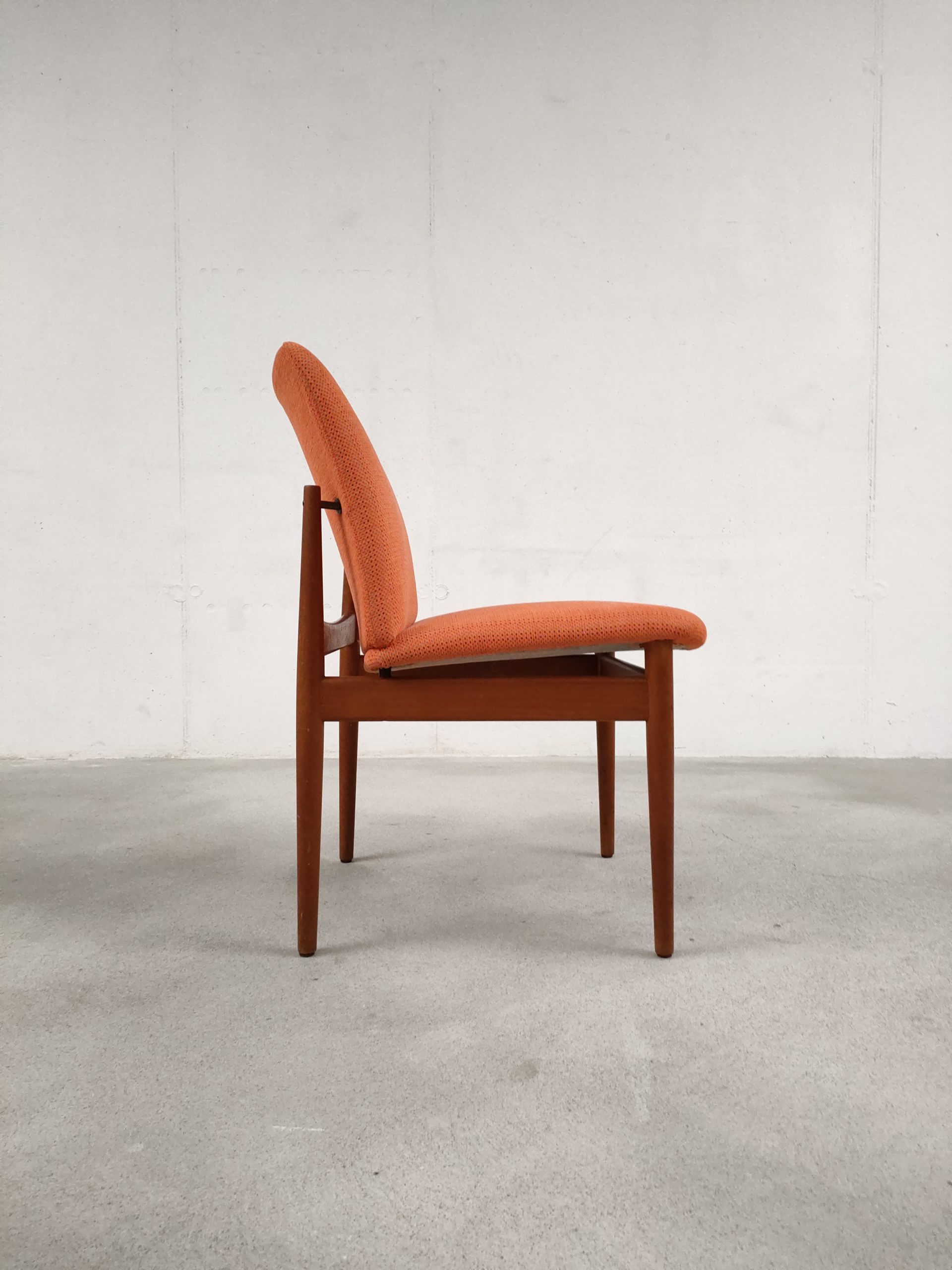 Set de 4 chaises de salle à manger en teck et tissu couleur saumon dessinées par le designer Finn Juhl et produites par France & Sons Danemark. Quelques traces d’usure sur le bois et des légères traces sur le tissu d’une des 4 chaises (voir photos). La structure ainsi que l’assise sont en bon état. Stables et solides, elles sont confortables et très élégantes. Hauteur de l’assise: 49 cm.