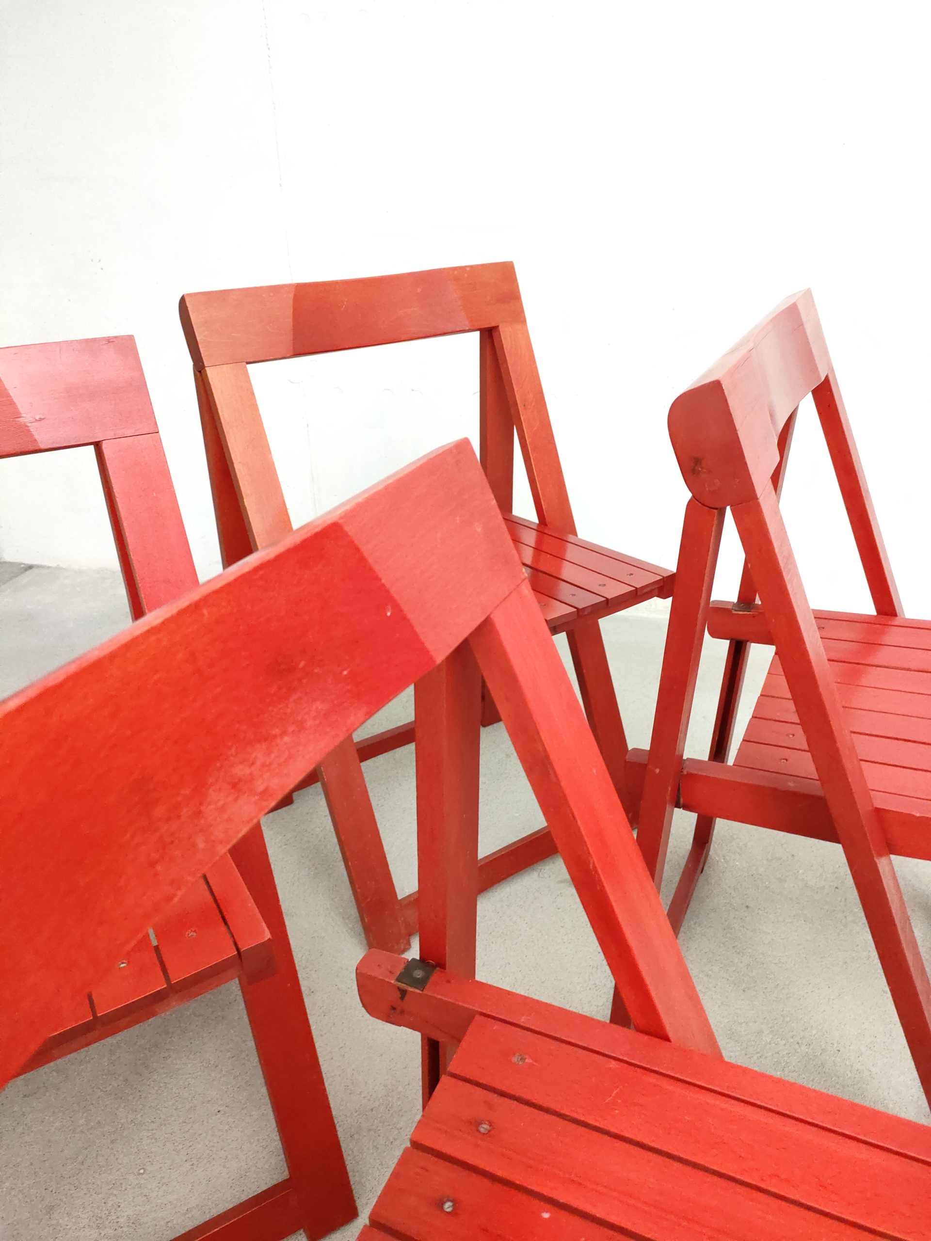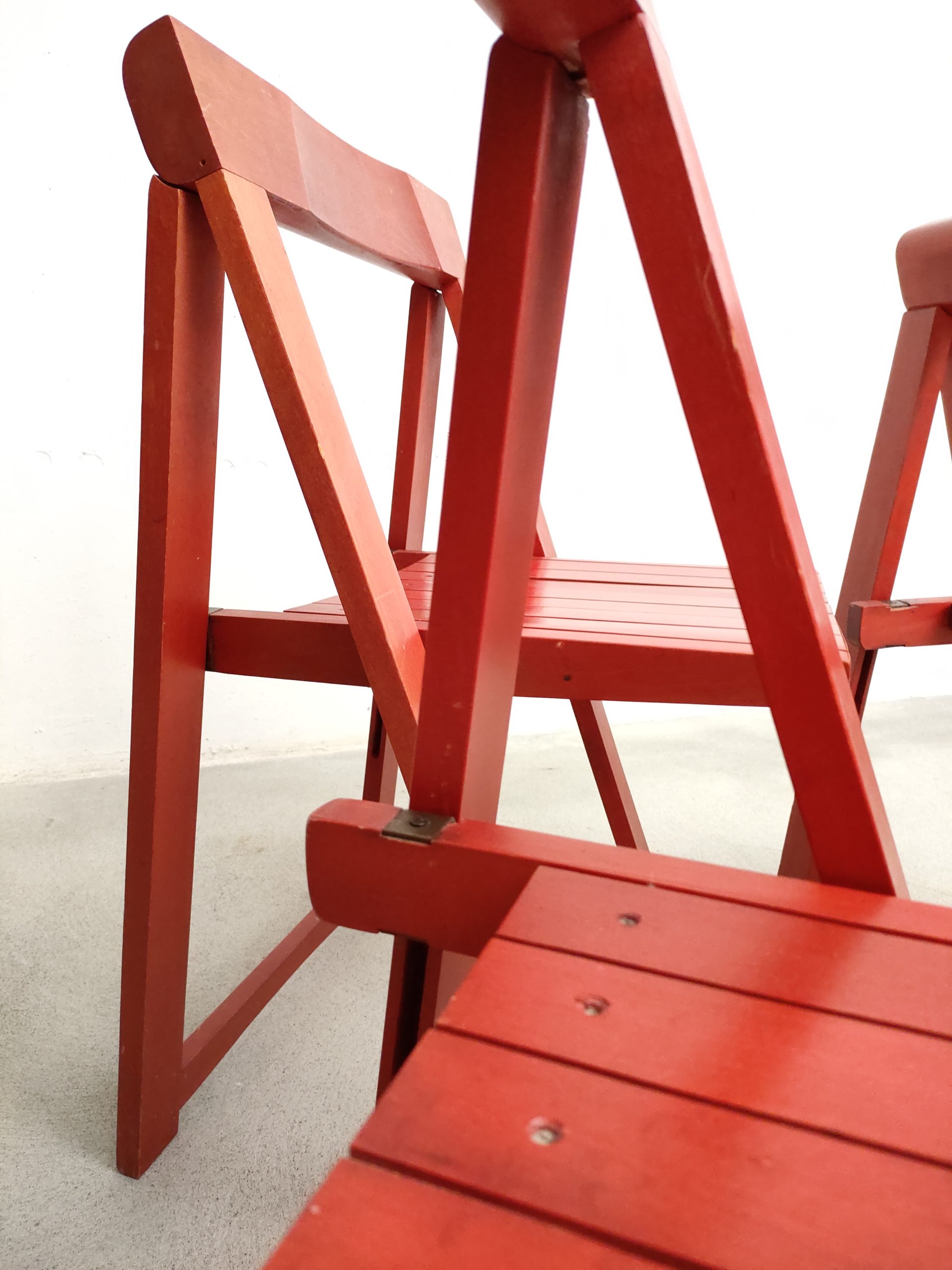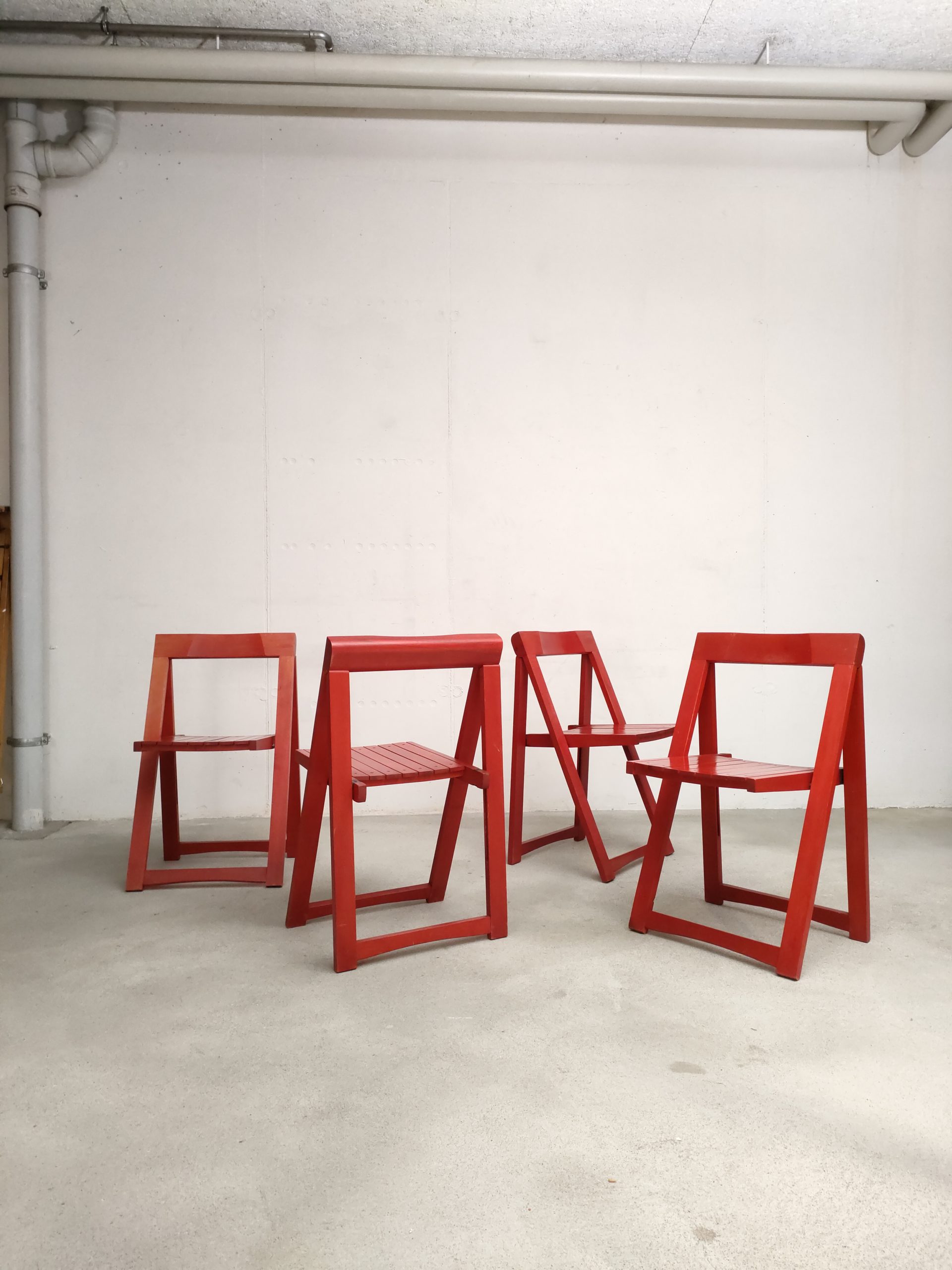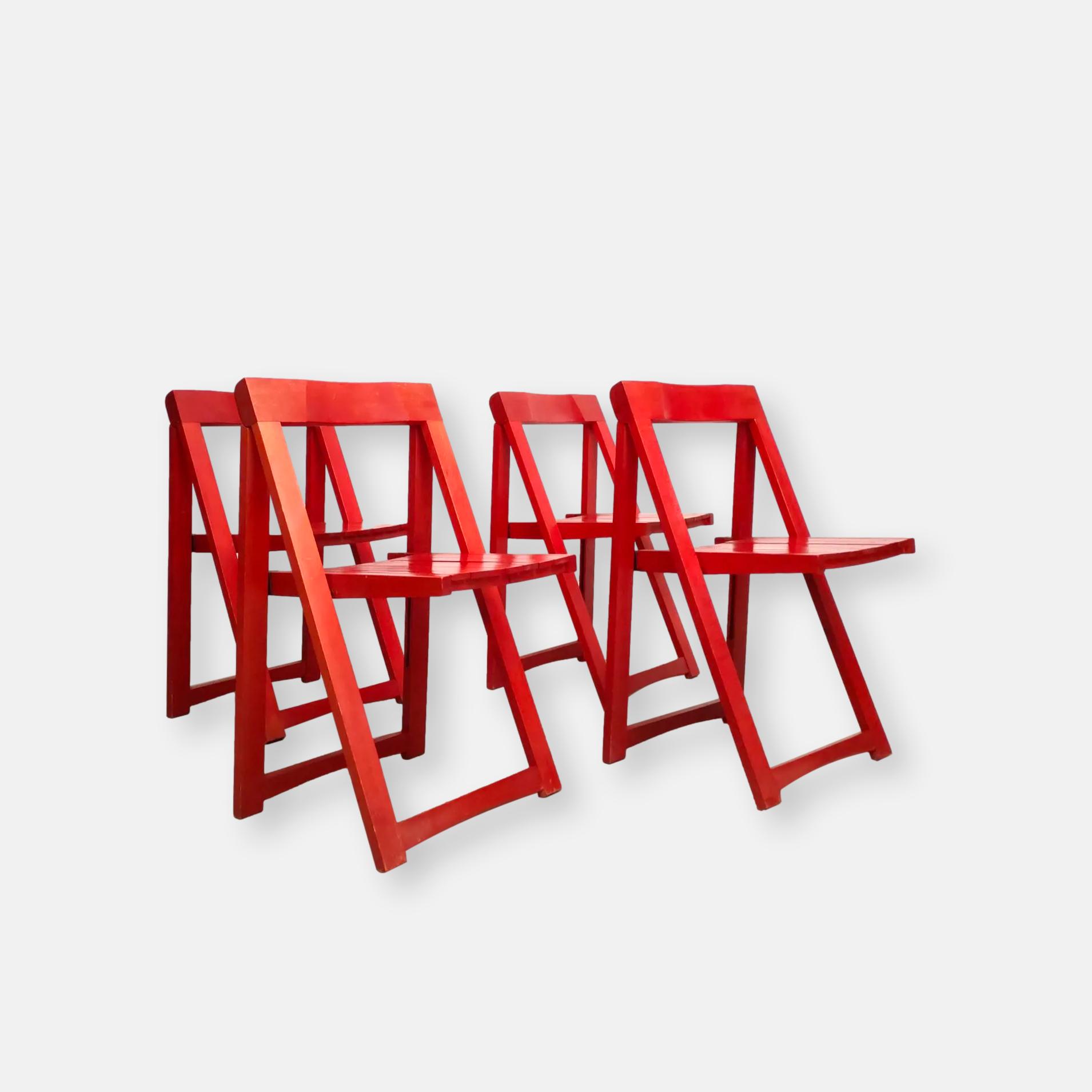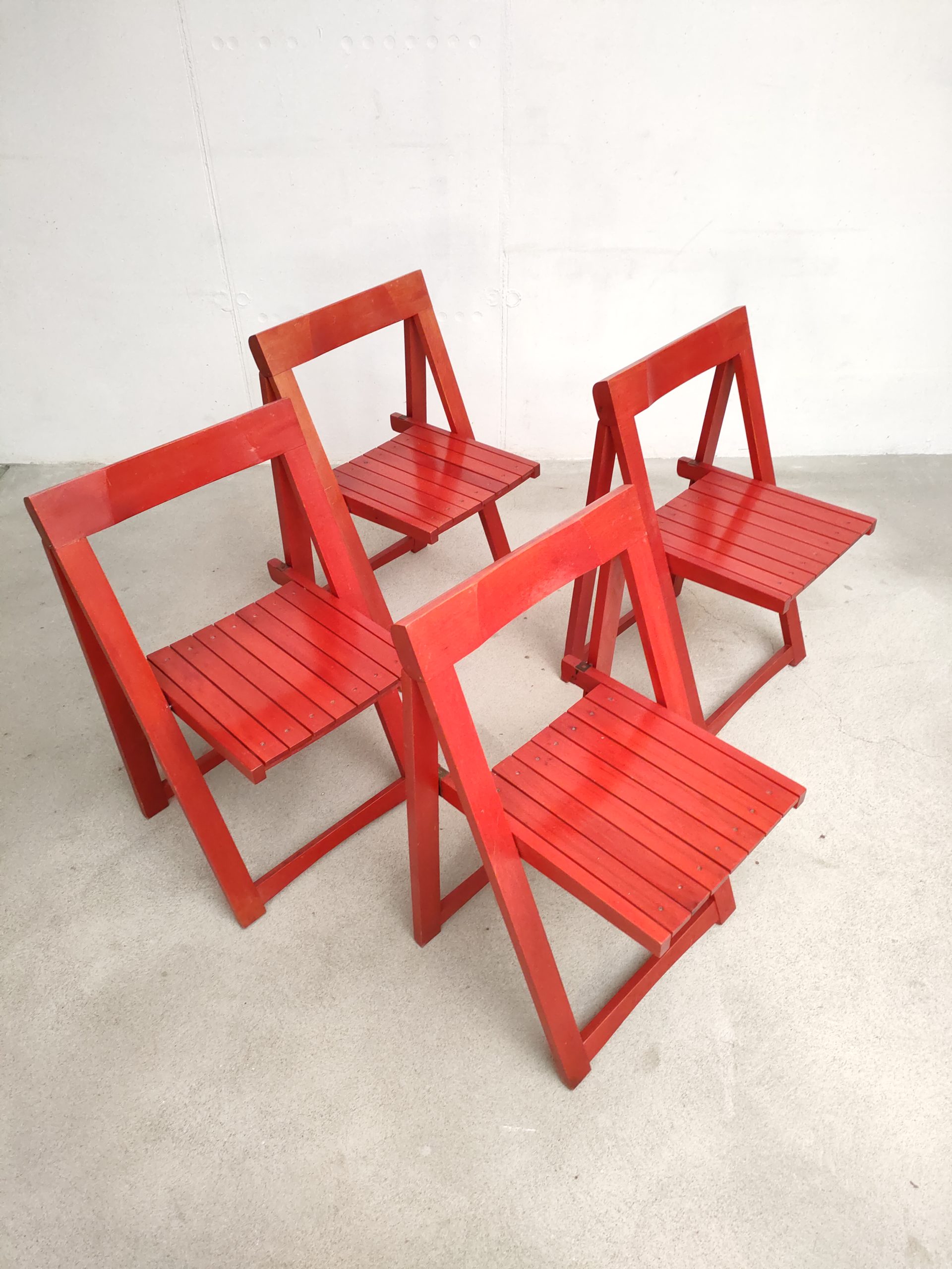Produit venduSet de 4 chaises pliantes en hêtre massif, dessinées par Aldo Jacober et produites par Alberto Bazzani. Elles présentes quelques marques sur le bois à cause de l’usure et au temps. Elles sont stables et solides et parfaitement fonctionnelles. Hauteur de l’assise: 45 cm devant et 43 cm derrière.