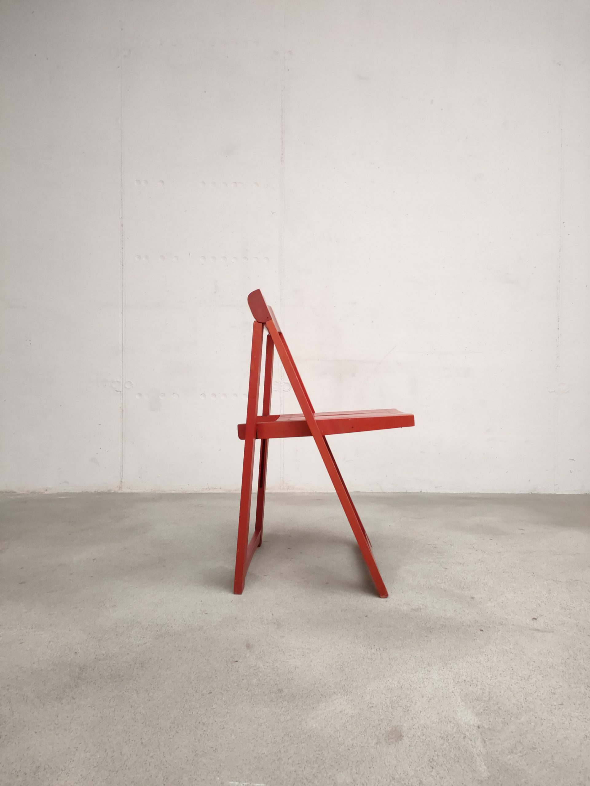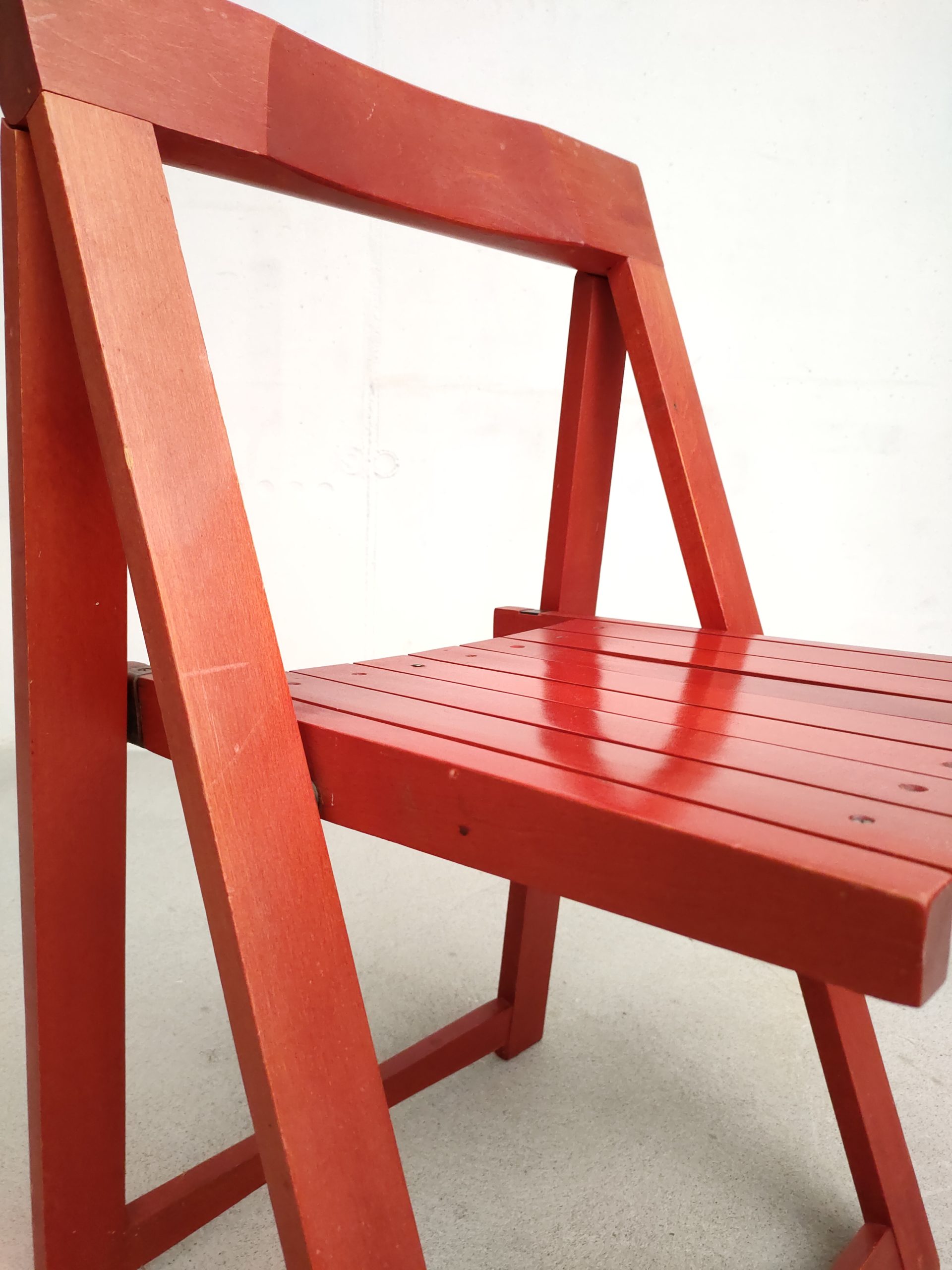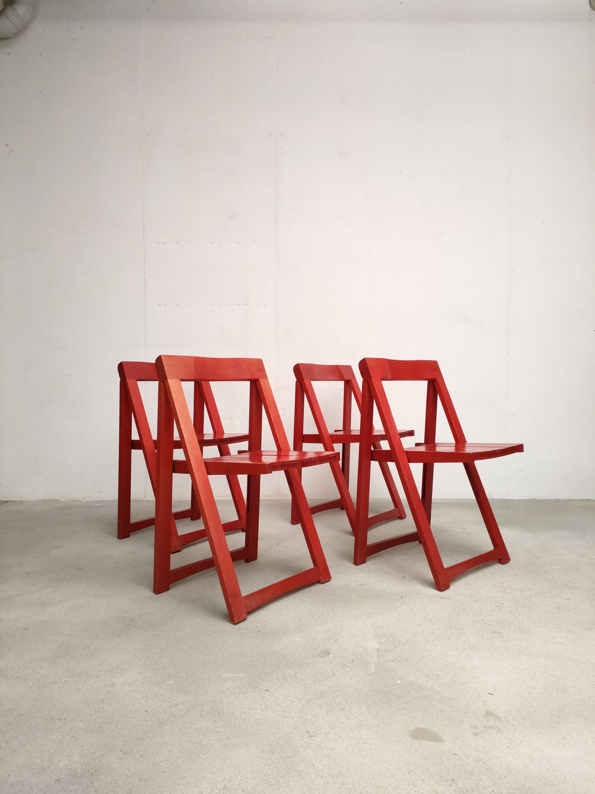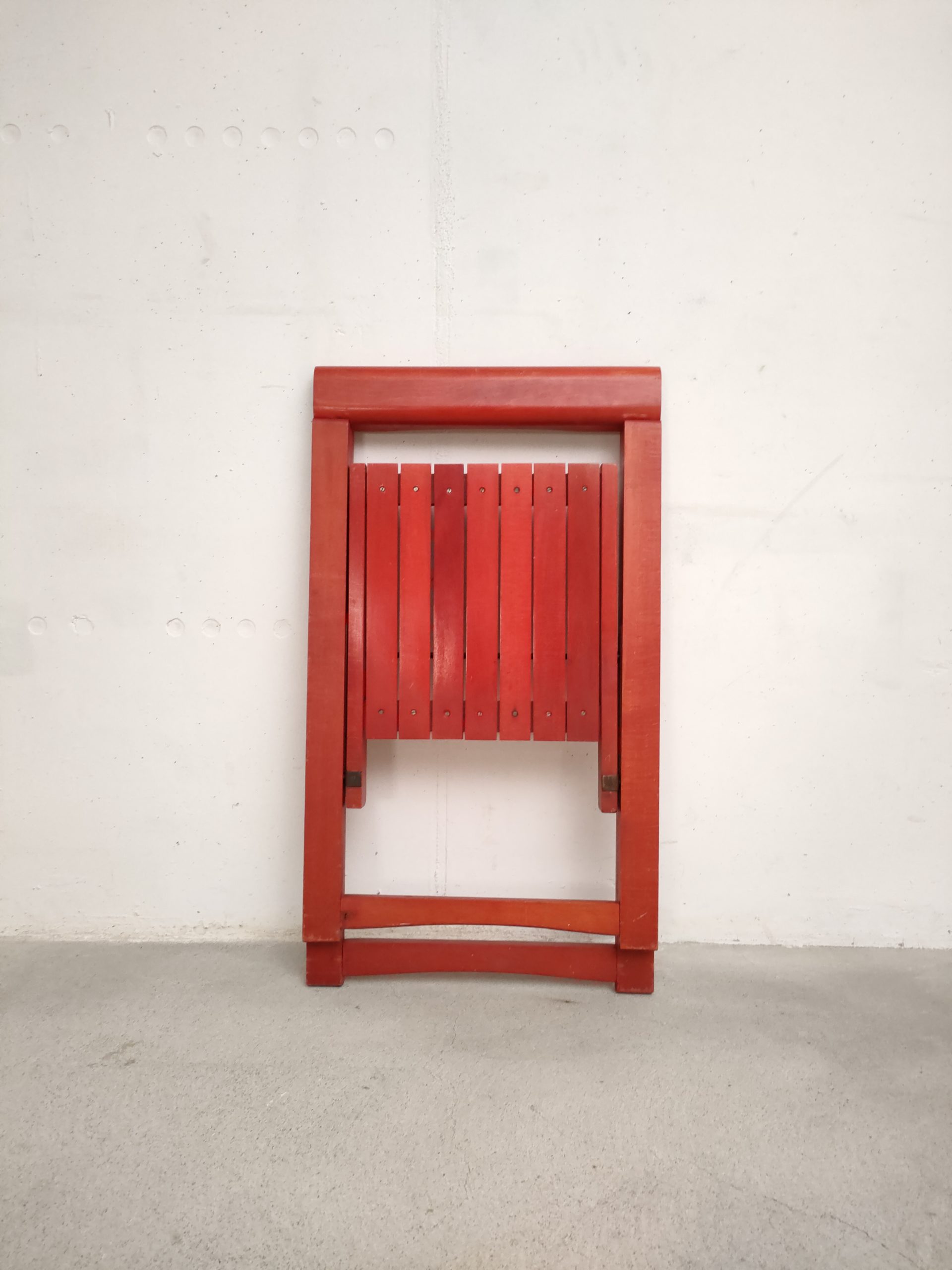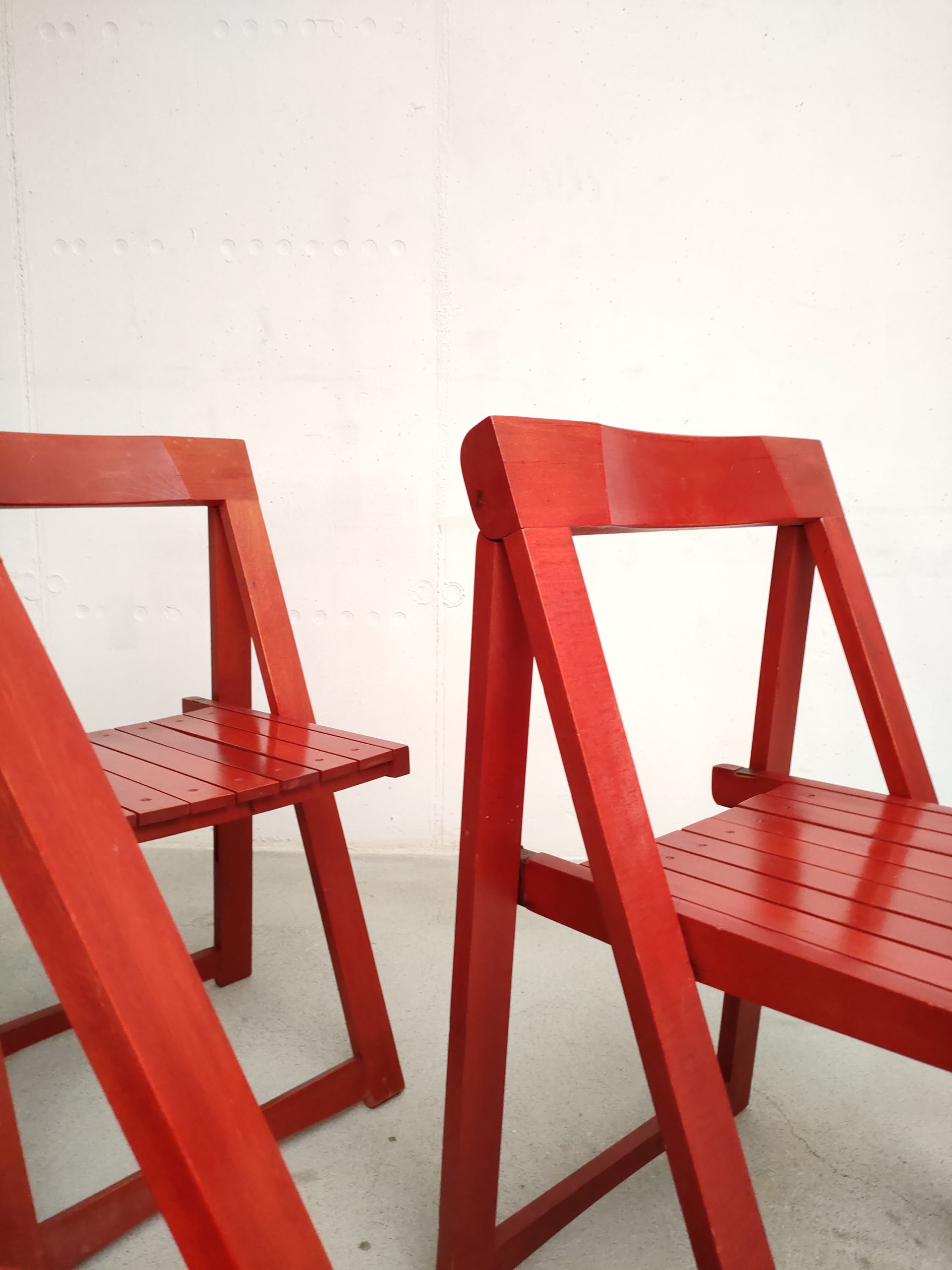 Produit venduSet de 4 chaises pliantes en hêtre massif, dessinées par Aldo Jacober et produites par Alberto Bazzani. Elles présentes quelques marques sur le bois à cause de l’usure et au temps. Elles sont stables et solides et parfaitement fonctionnelles. Hauteur de l’assise: 45 cm devant et 43 cm derrière.