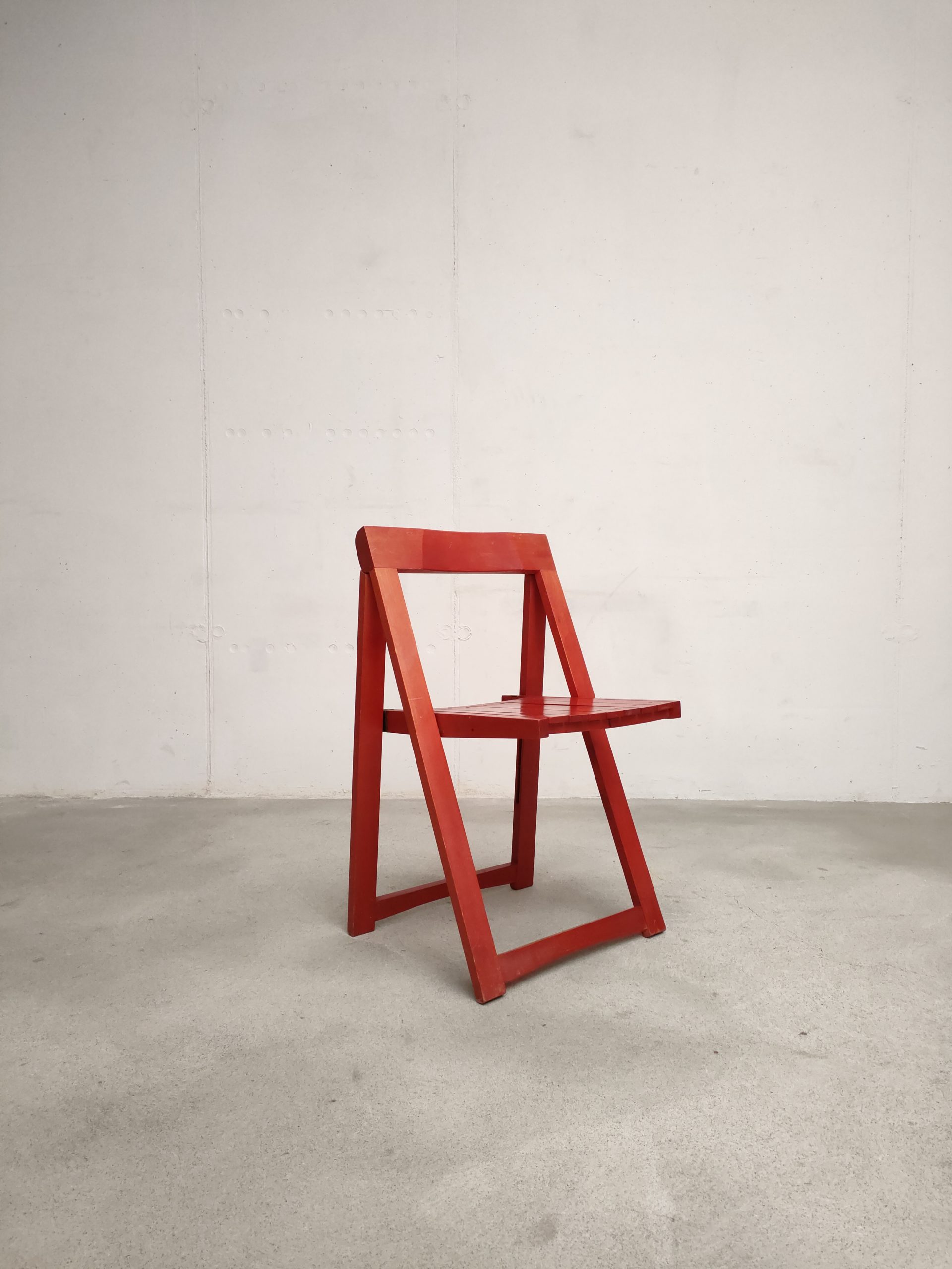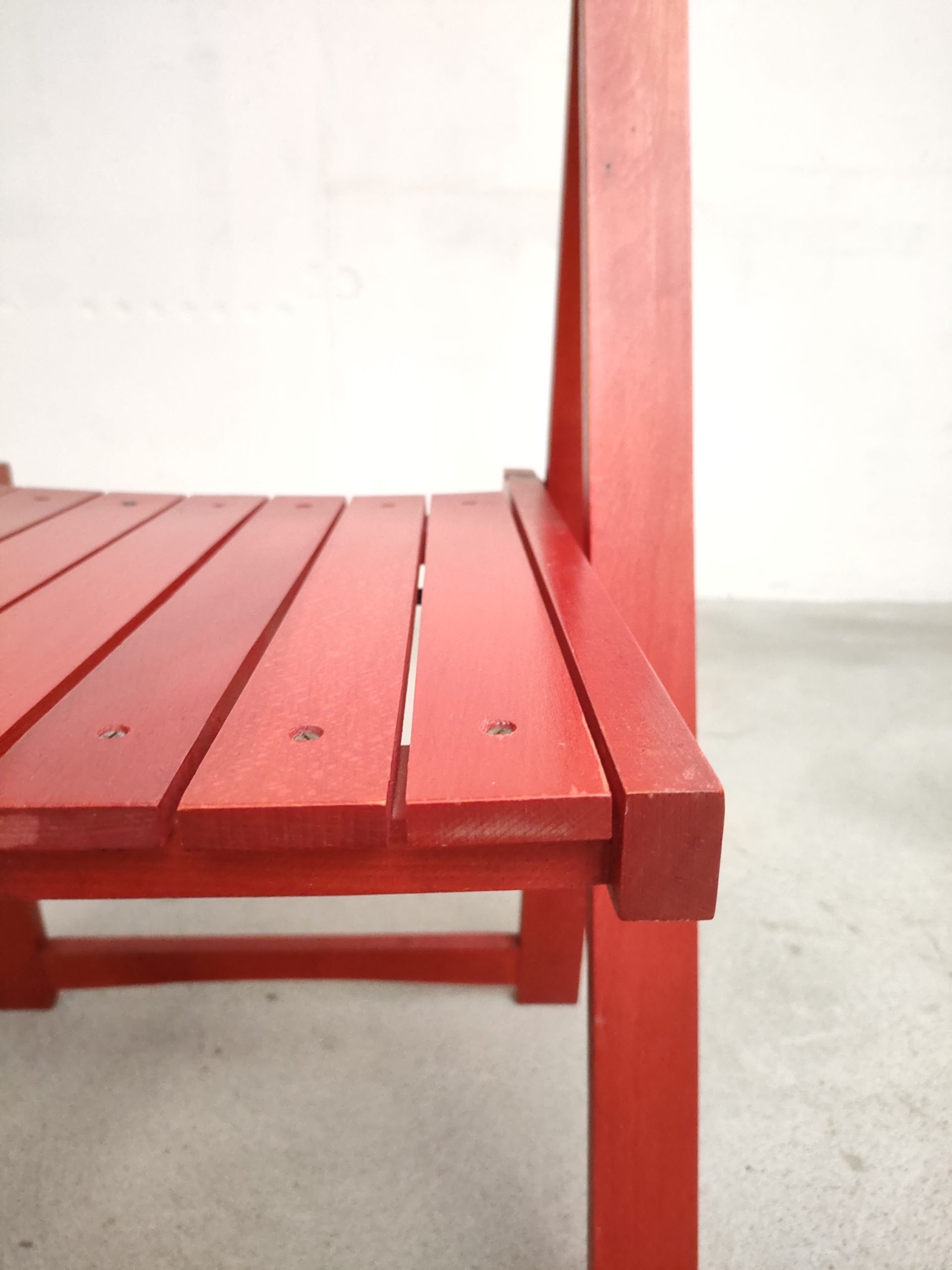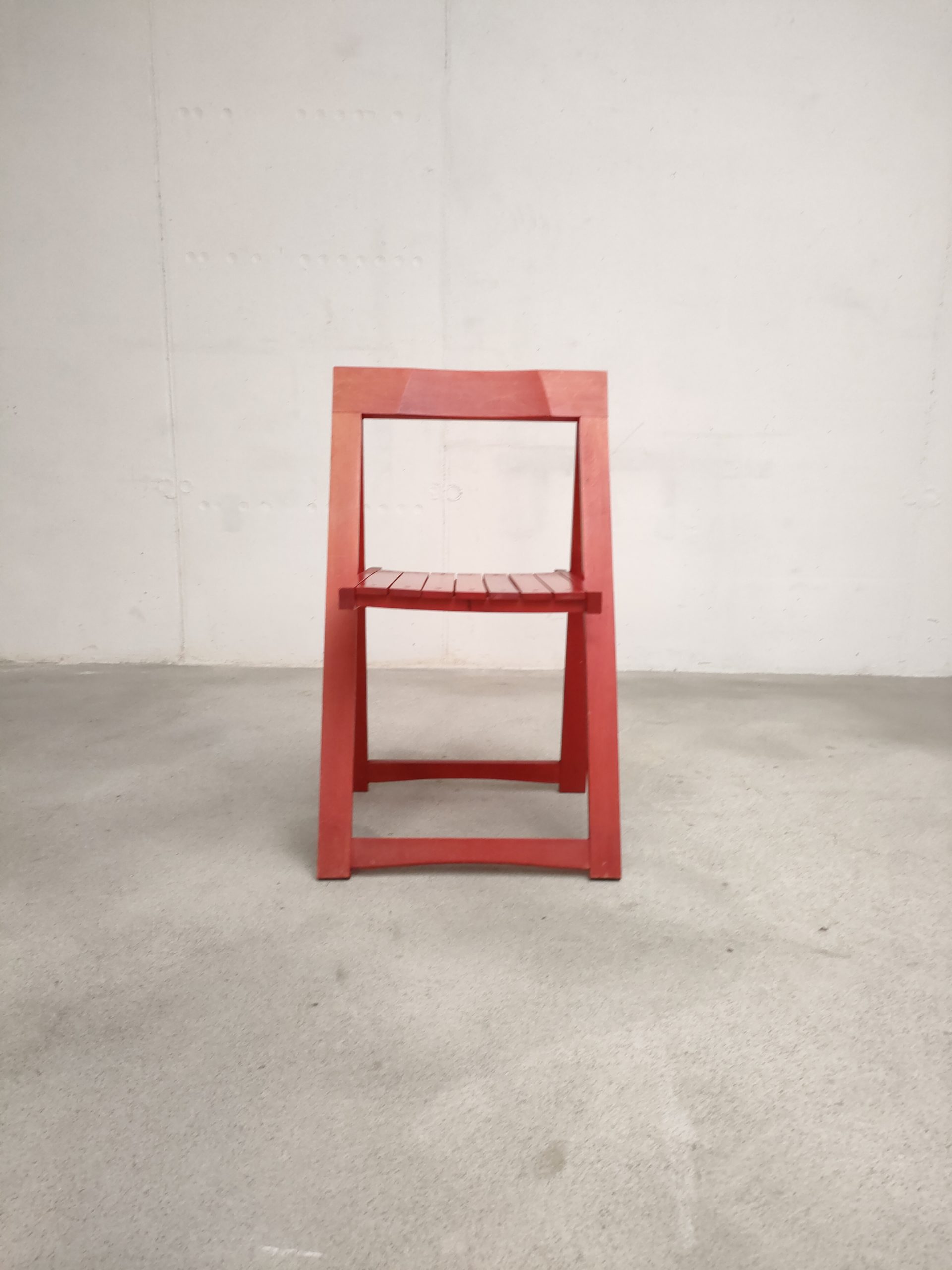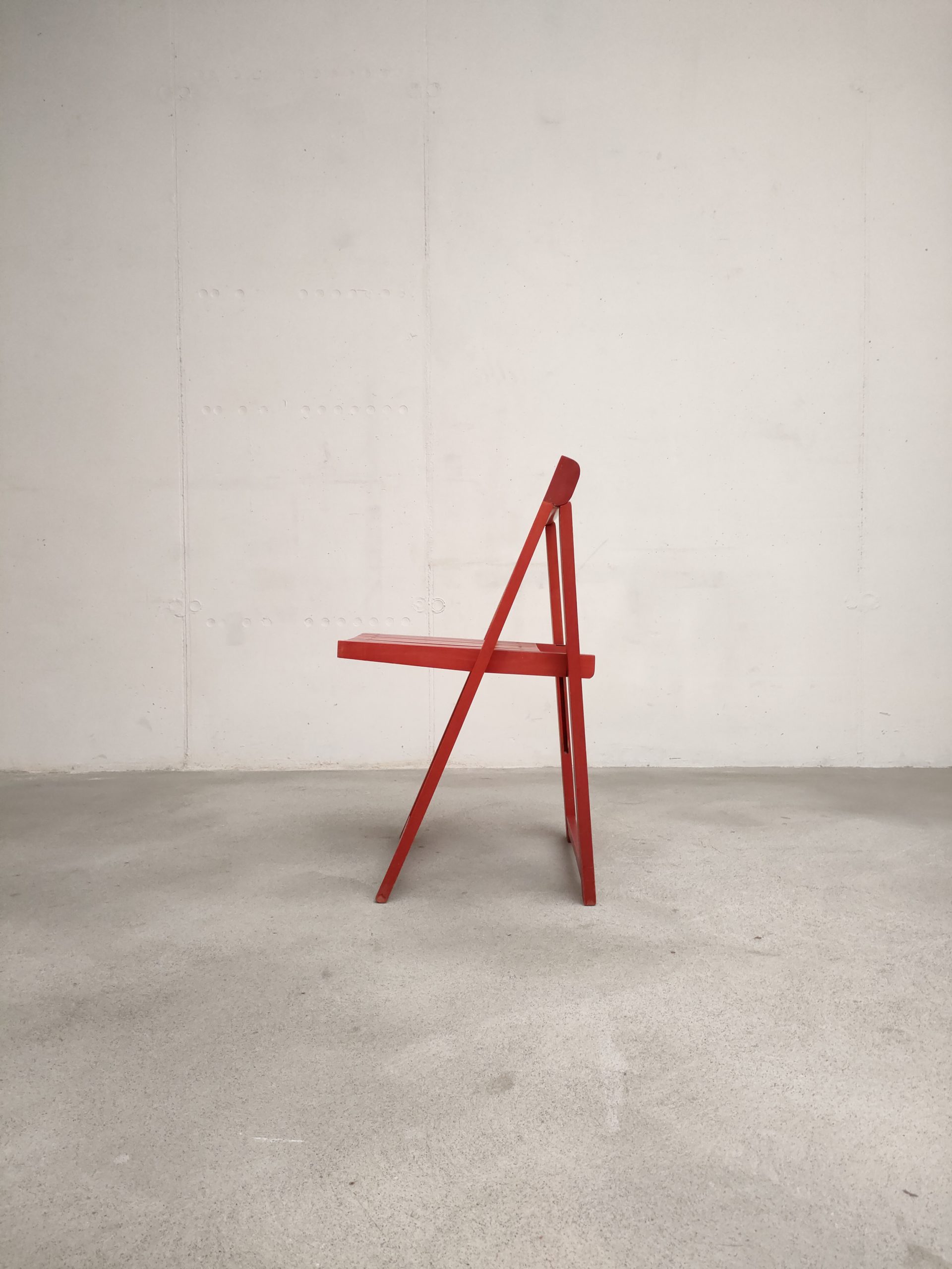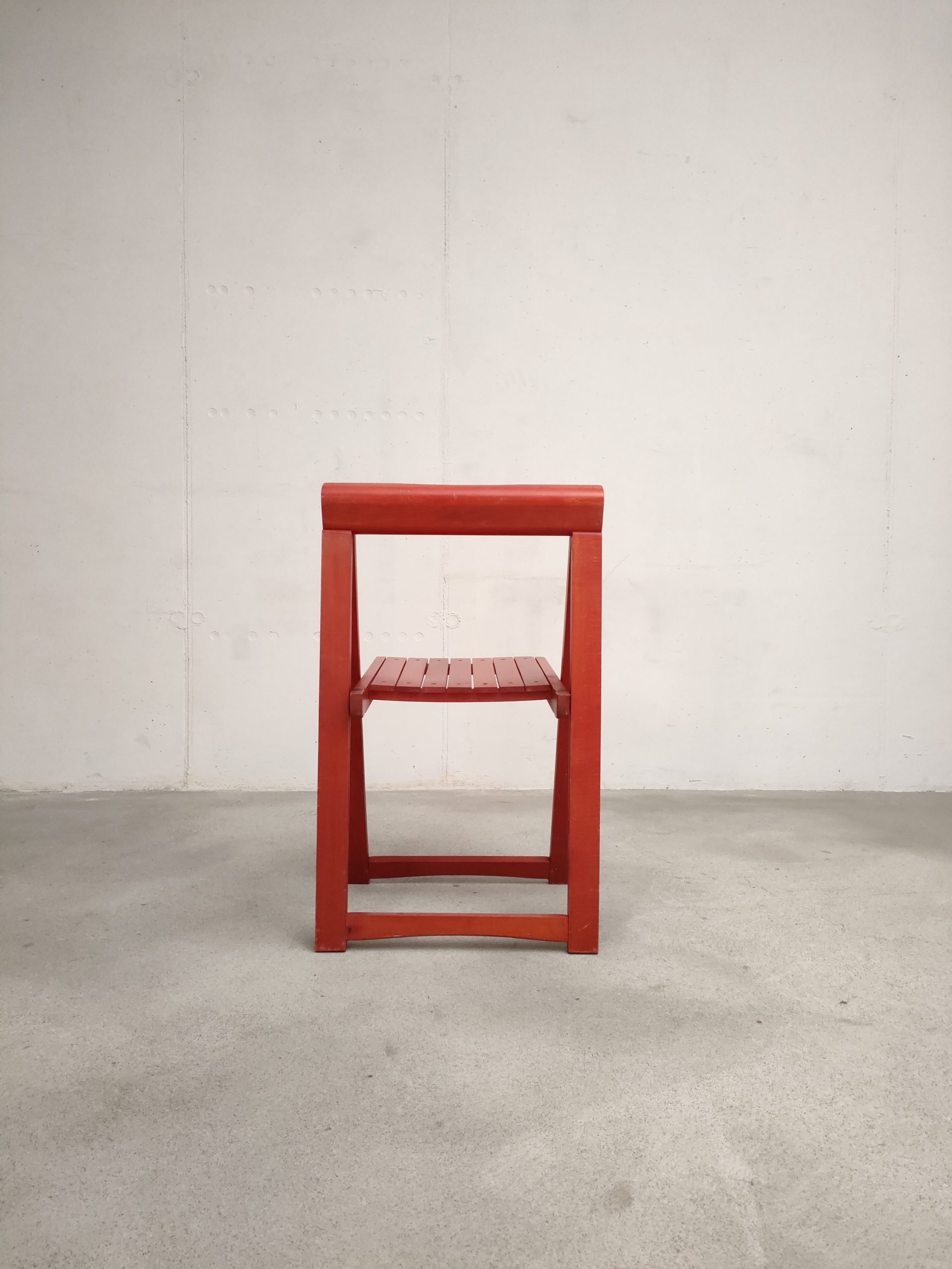 Produit venduSet de 4 chaises pliantes en hêtre massif, dessinées par Aldo Jacober et produites par Alberto Bazzani. Elles présentes quelques marques sur le bois à cause de l’usure et au temps. Elles sont stables et solides et parfaitement fonctionnelles. Hauteur de l’assise: 45 cm devant et 43 cm derrière.