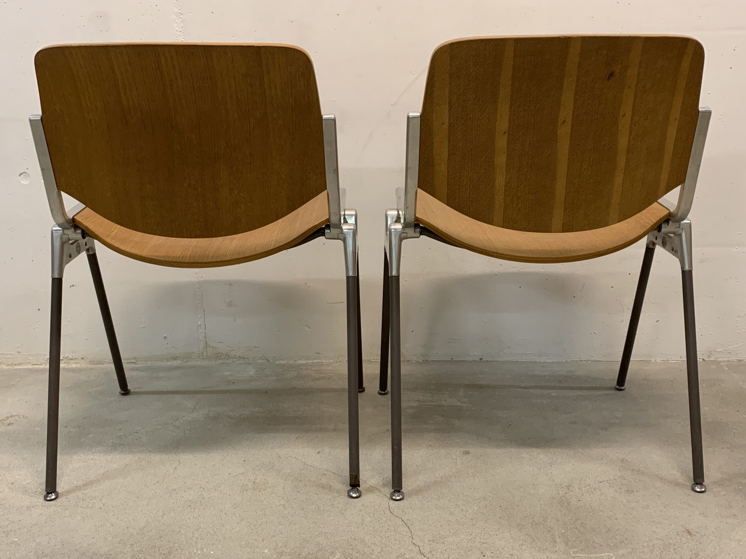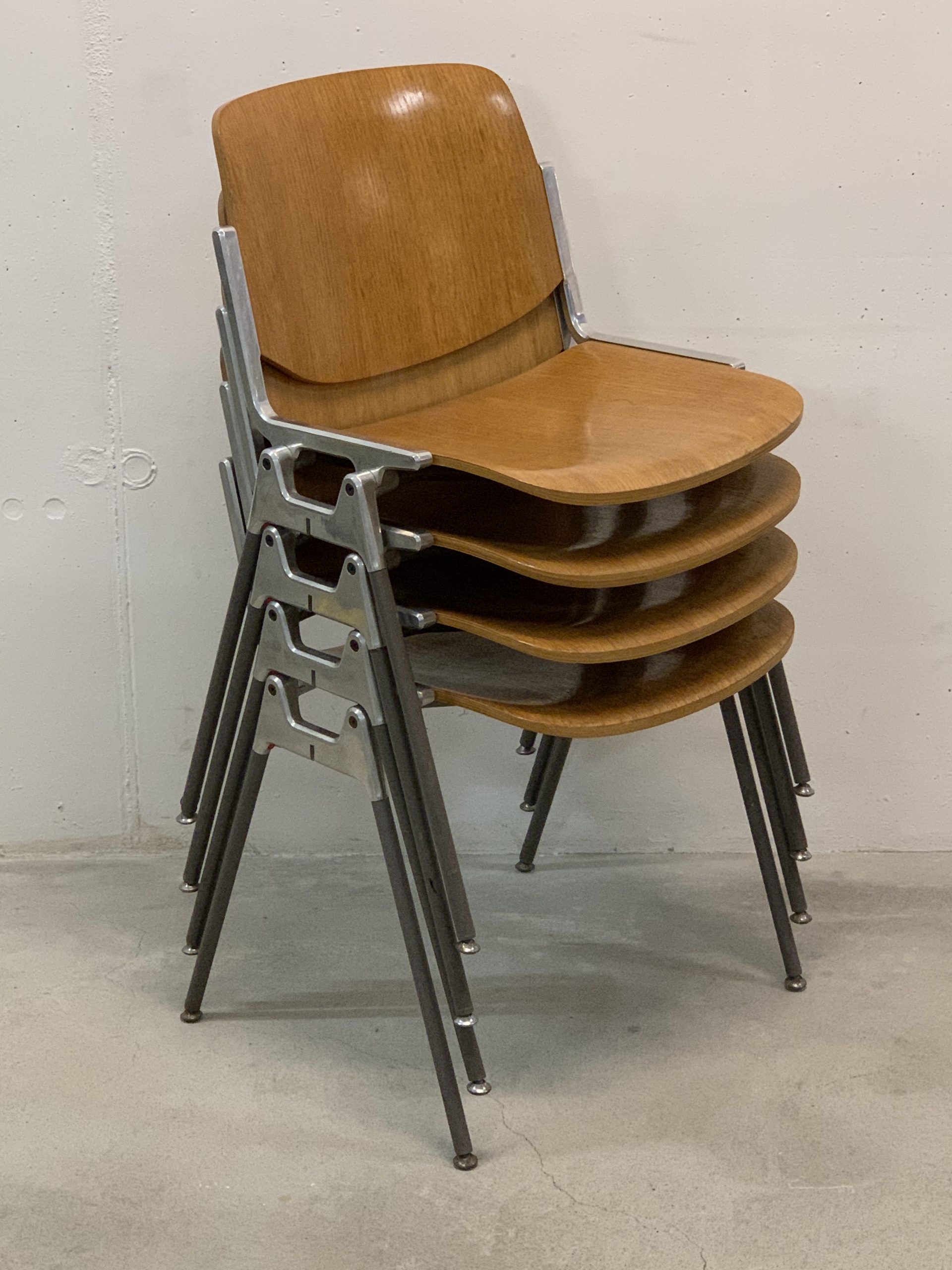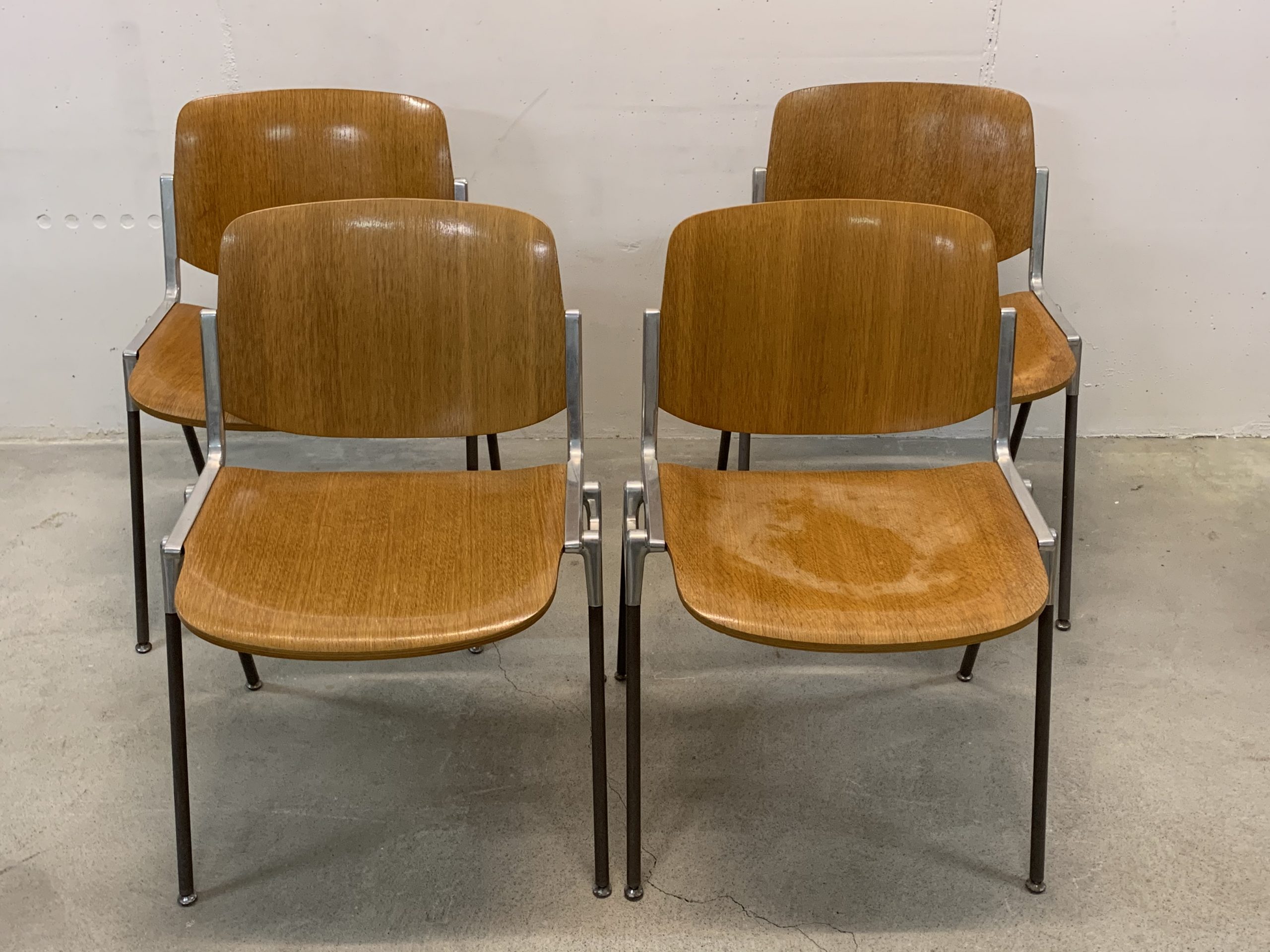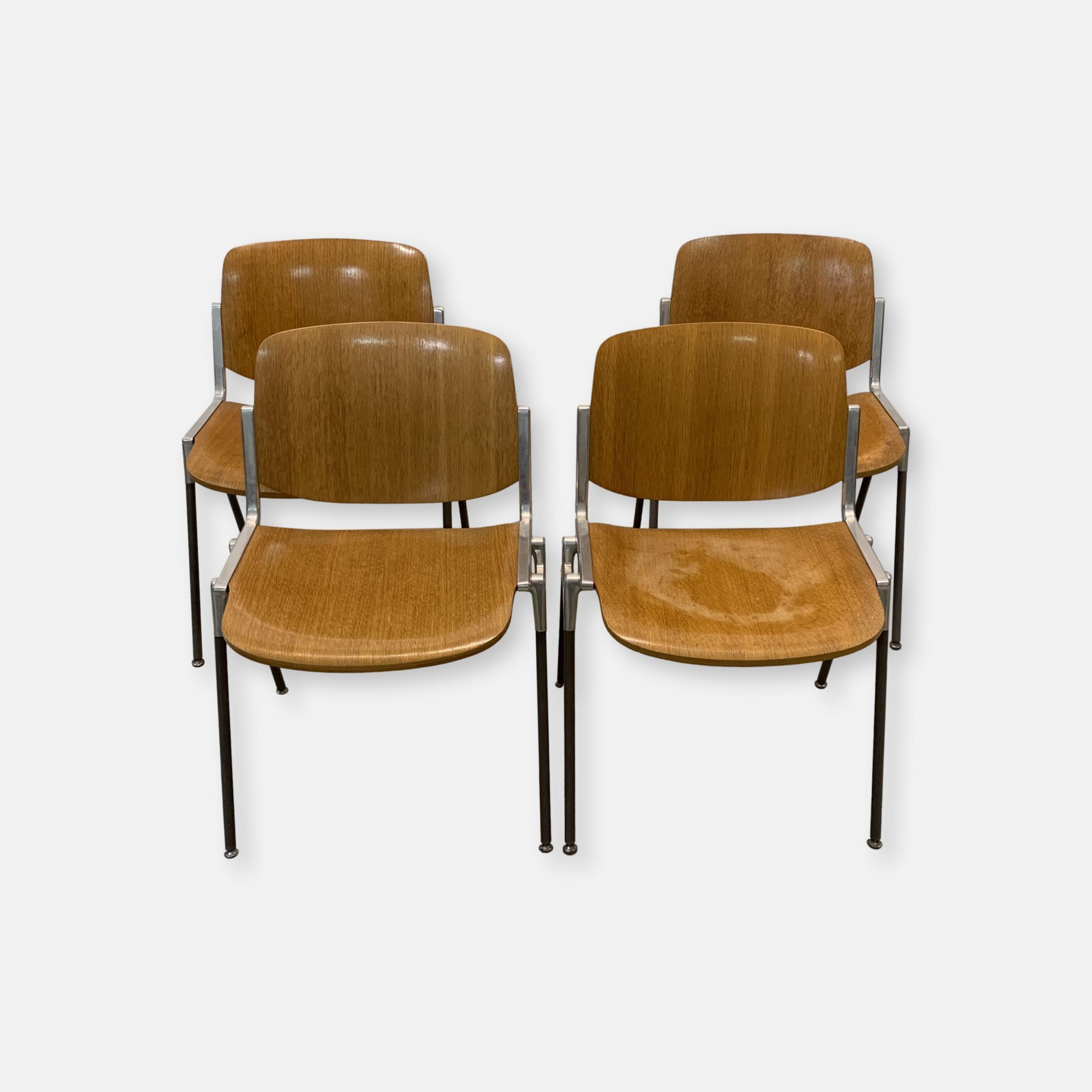 Produit venduSet de 4 chaises empilables de Giancarlo Piretti pour Castelli. Hauteur d’assise d’environ 44cm. Assise et dossier en bois avec plusieurs traces d’utilisation. En particulier, une assise comporte les restes d’une trace d’eau. Le bois est un peu abîmé à certains endroits (au dos des chaises, et non sur des zones qui pourraient être inconfortables), et le revêtement synthétique au bas d’un pied à été déchiré. Les principaux défauts sont visibles sur les photos, mais l’ensemble reste assez esthétique et parfaitement fonctionnel.