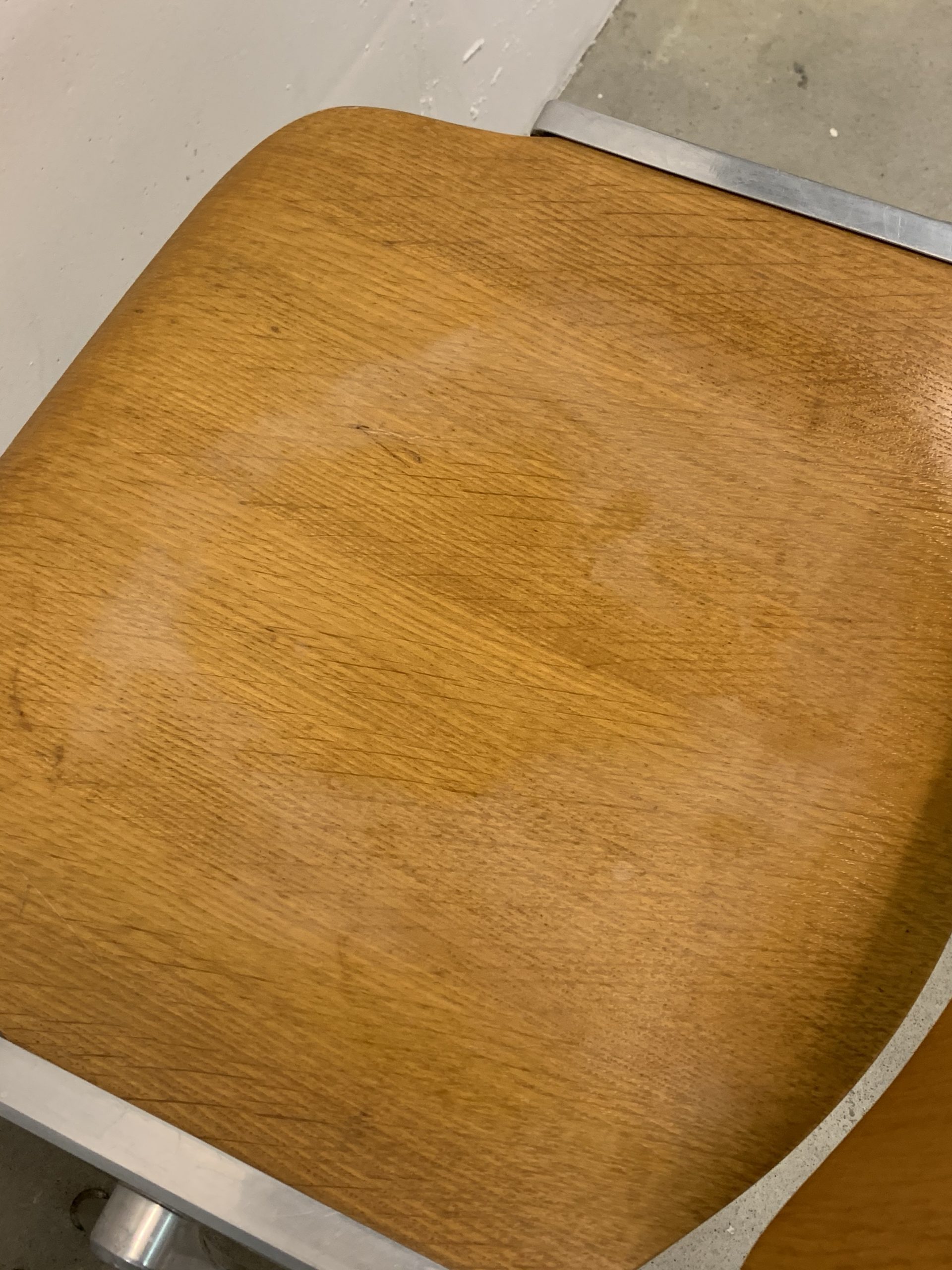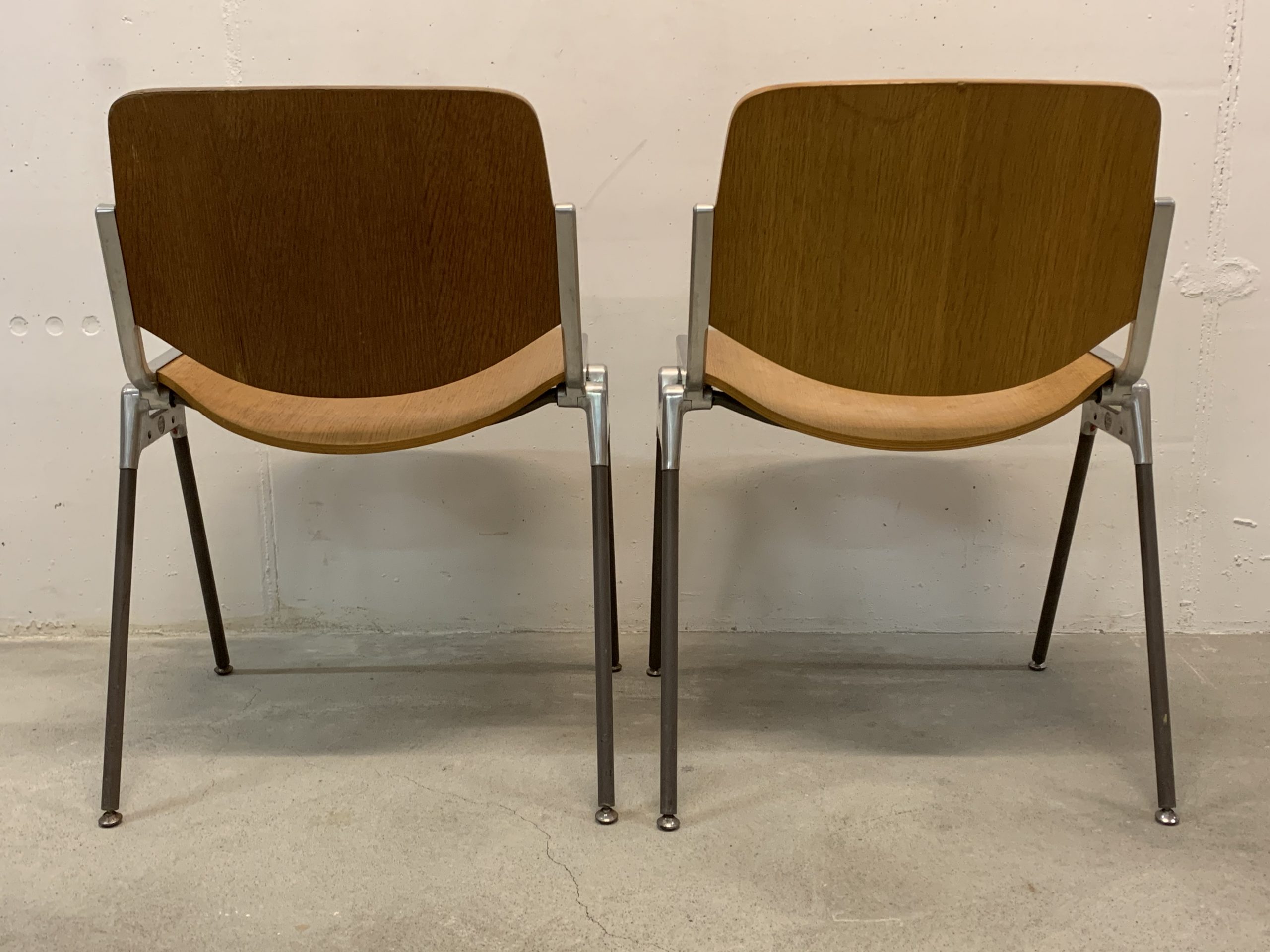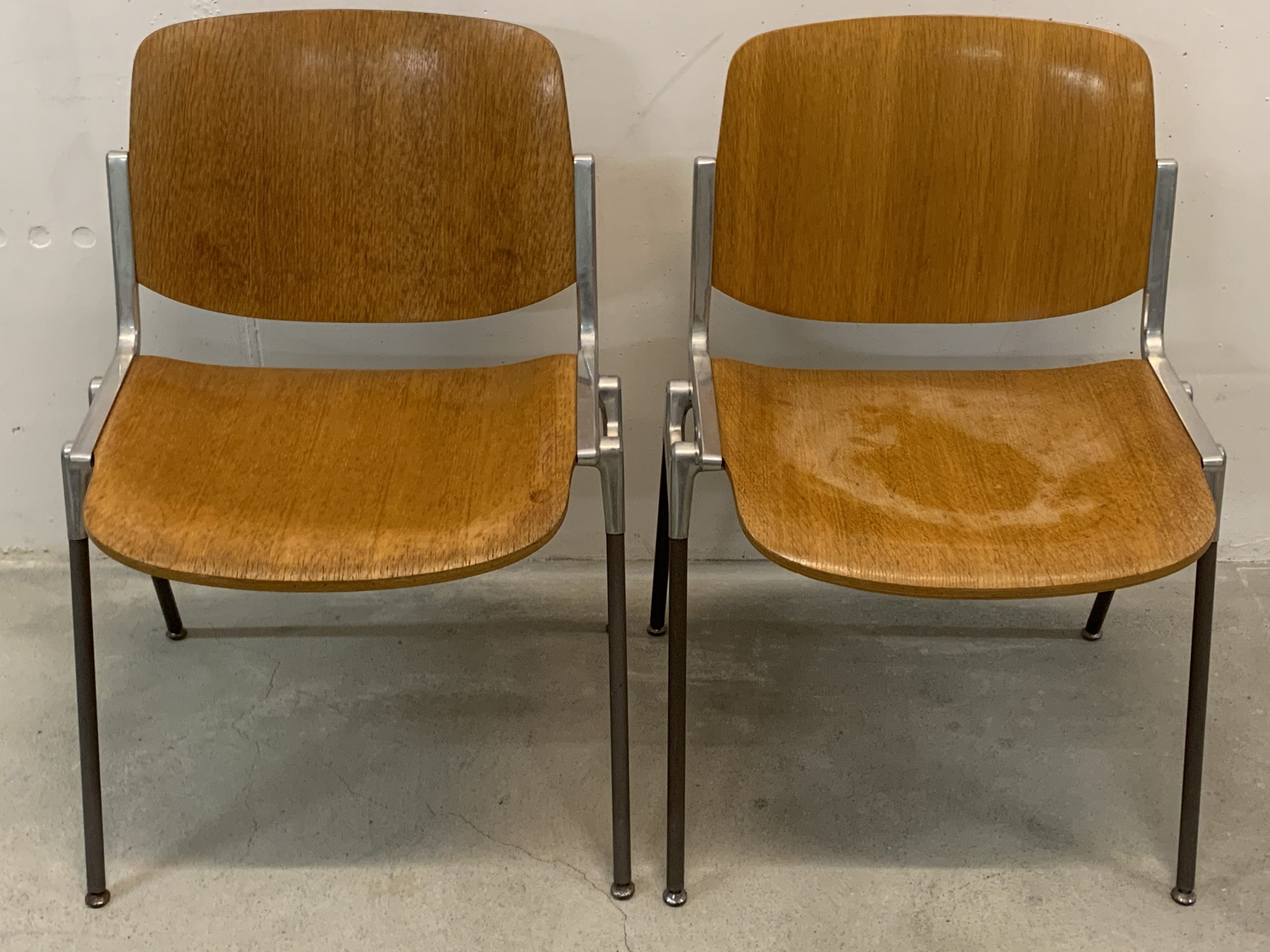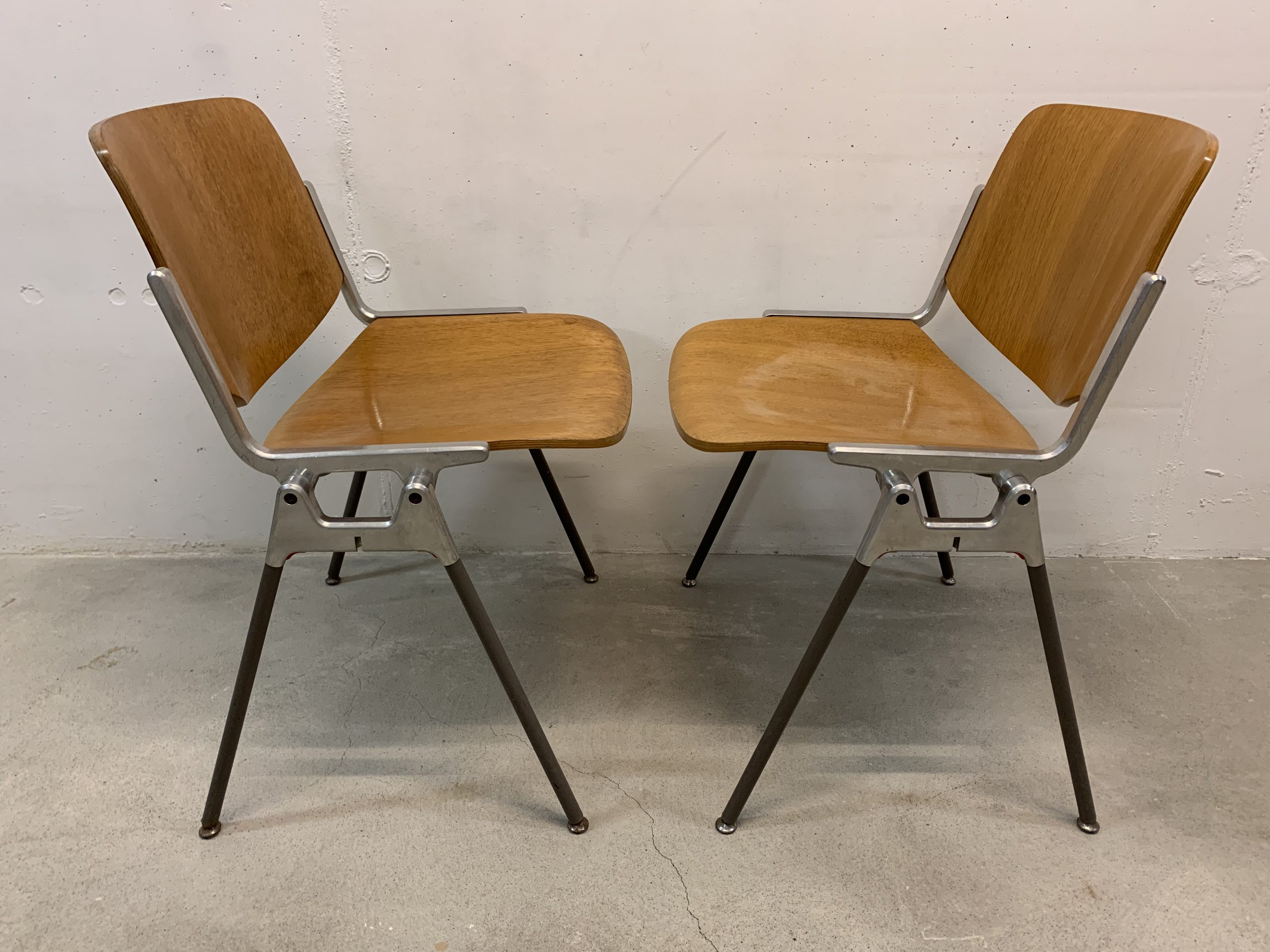 Produit venduSet de 4 chaises empilables de Giancarlo Piretti pour Castelli. Hauteur d’assise d’environ 44cm. Assise et dossier en bois avec plusieurs traces d’utilisation. En particulier, une assise comporte les restes d’une trace d’eau. Le bois est un peu abîmé à certains endroits (au dos des chaises, et non sur des zones qui pourraient être inconfortables), et le revêtement synthétique au bas d’un pied à été déchiré. Les principaux défauts sont visibles sur les photos, mais l’ensemble reste assez esthétique et parfaitement fonctionnel.