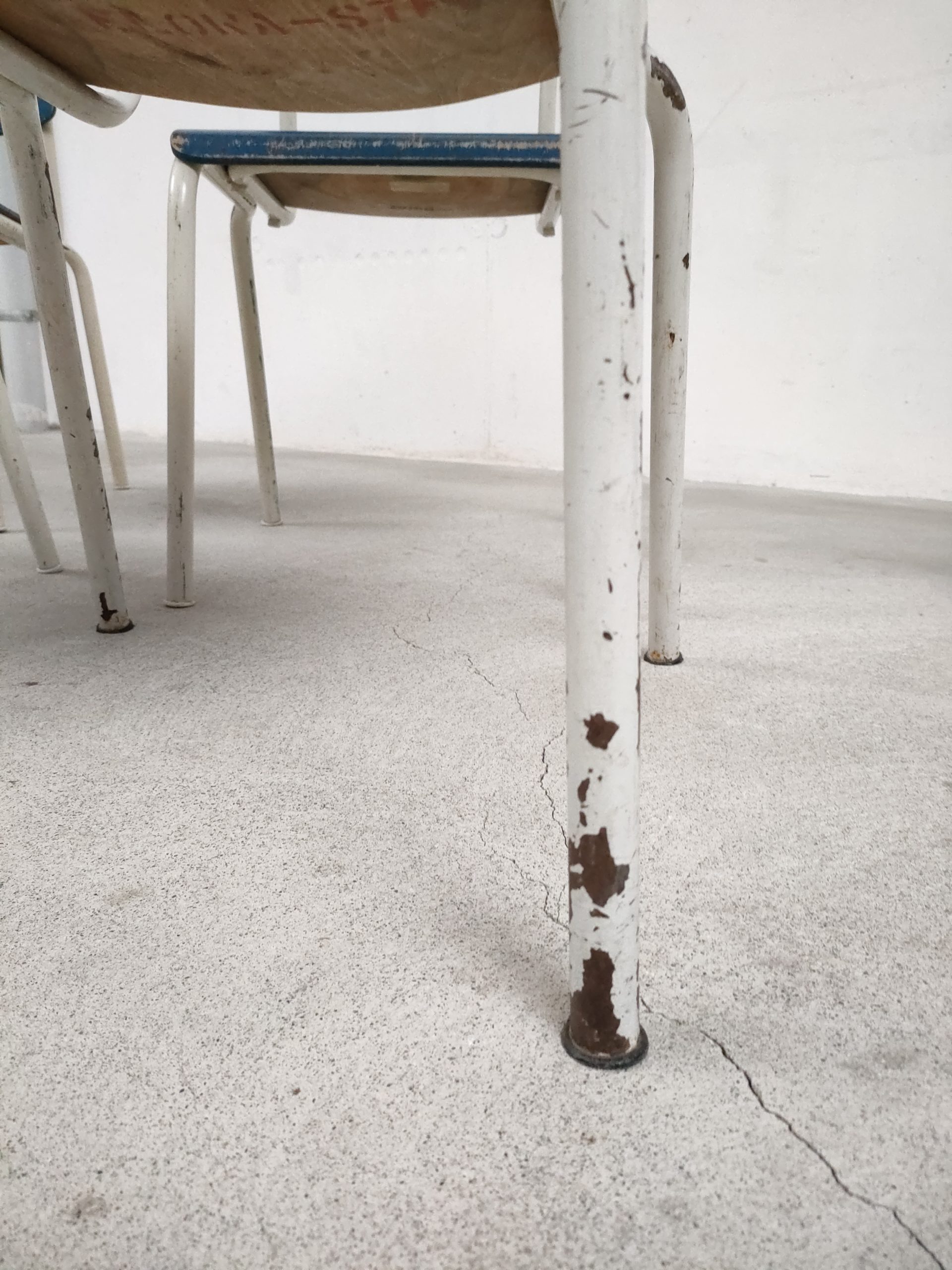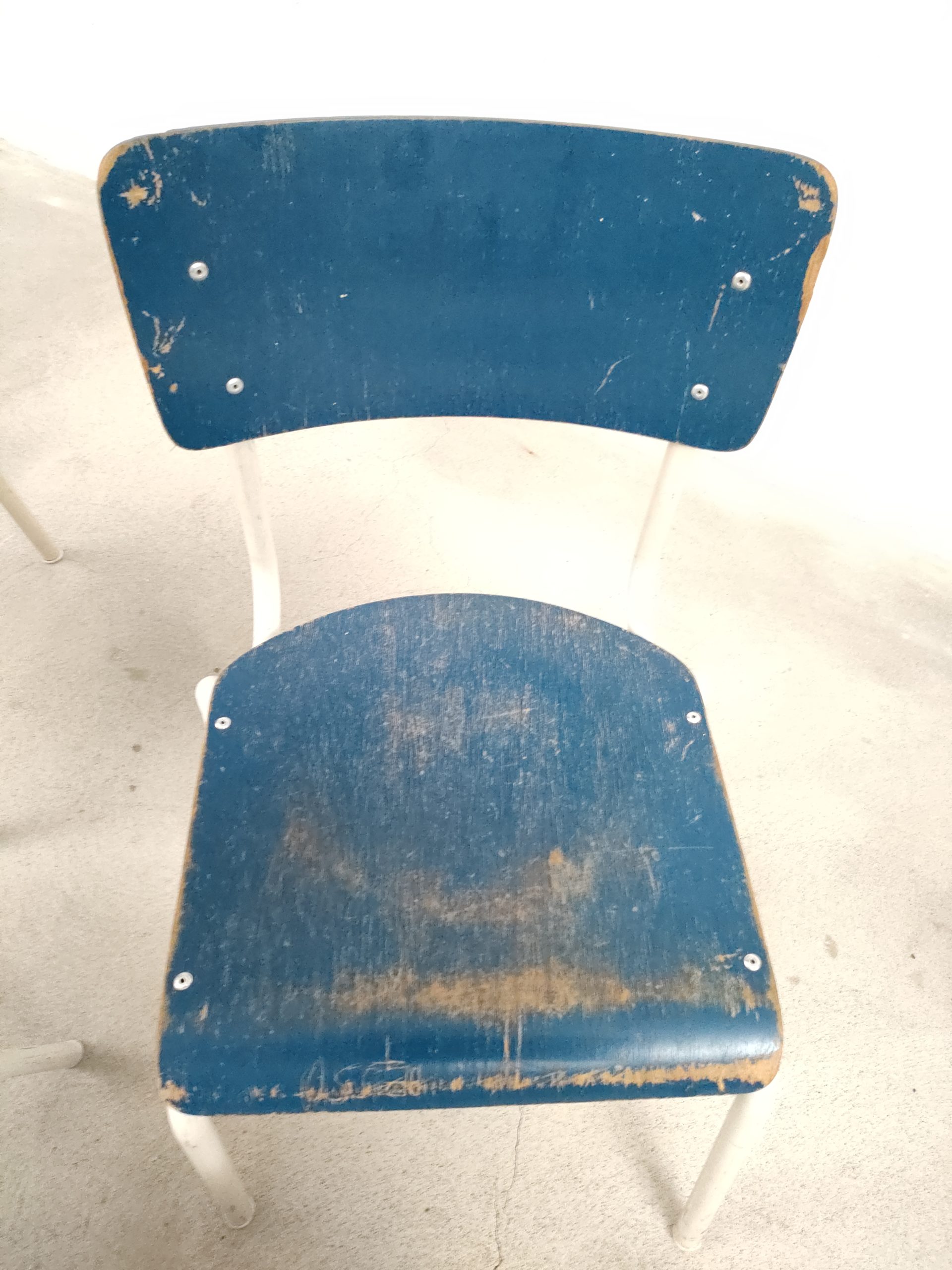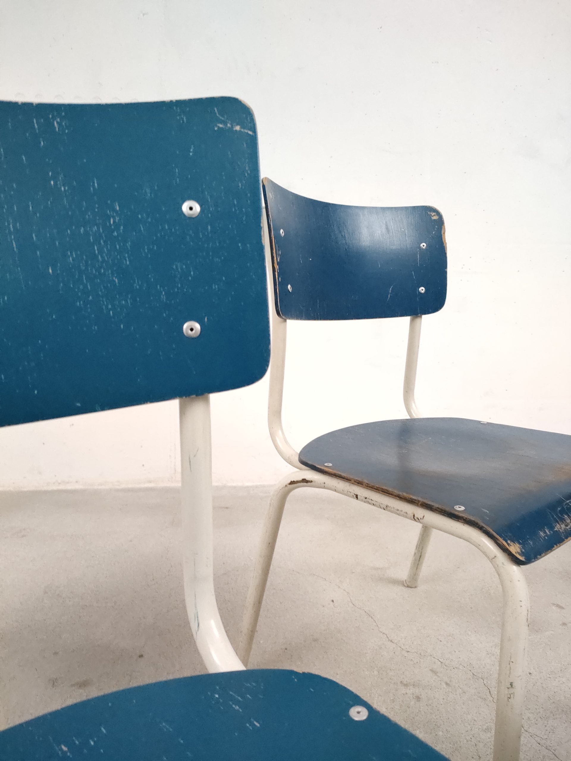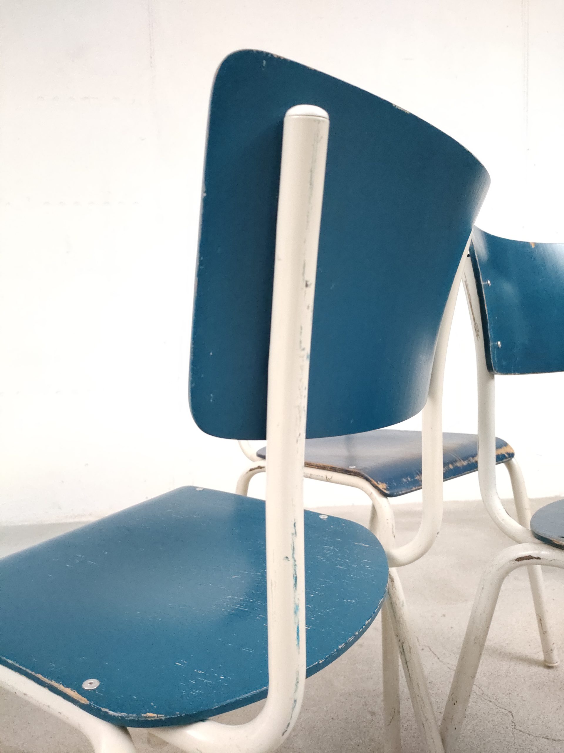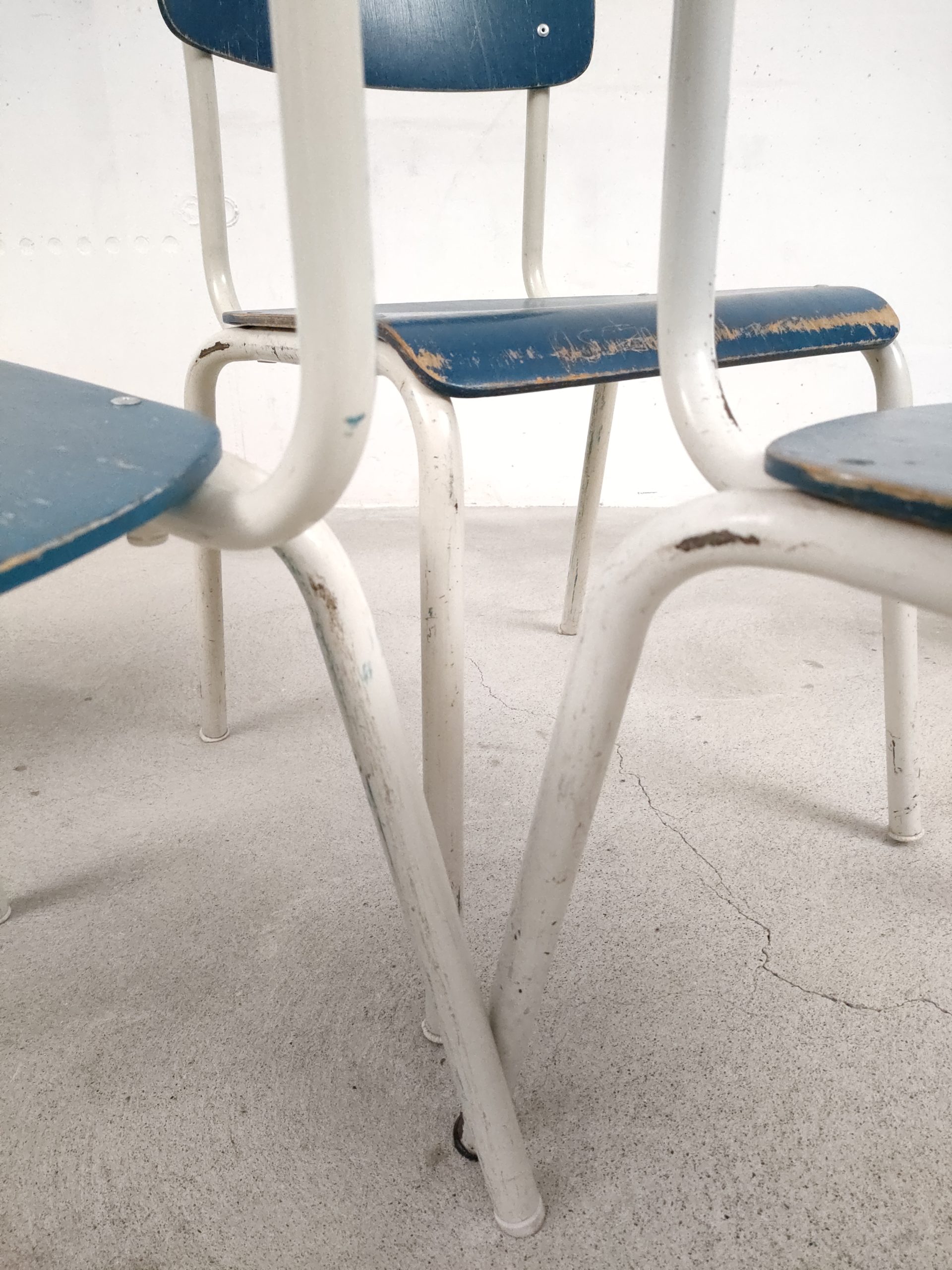 Produit venduSet de 4 chaises vintage empilables avec structure en métal blanc et assise et dossier en bois de couleur bleu. Des traces d’usure et des signes du temps sont présents à plusieurs endroits sur le métal et sur le bois (voir photos). Sur l’assise d’une d’elles une vis est manquante. Les chaises sont un peu bancales mais restent stables et fonctionnelles.