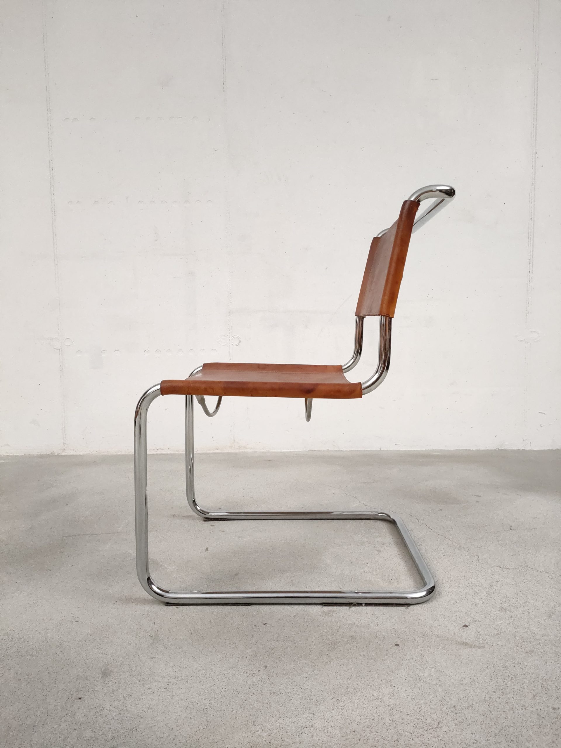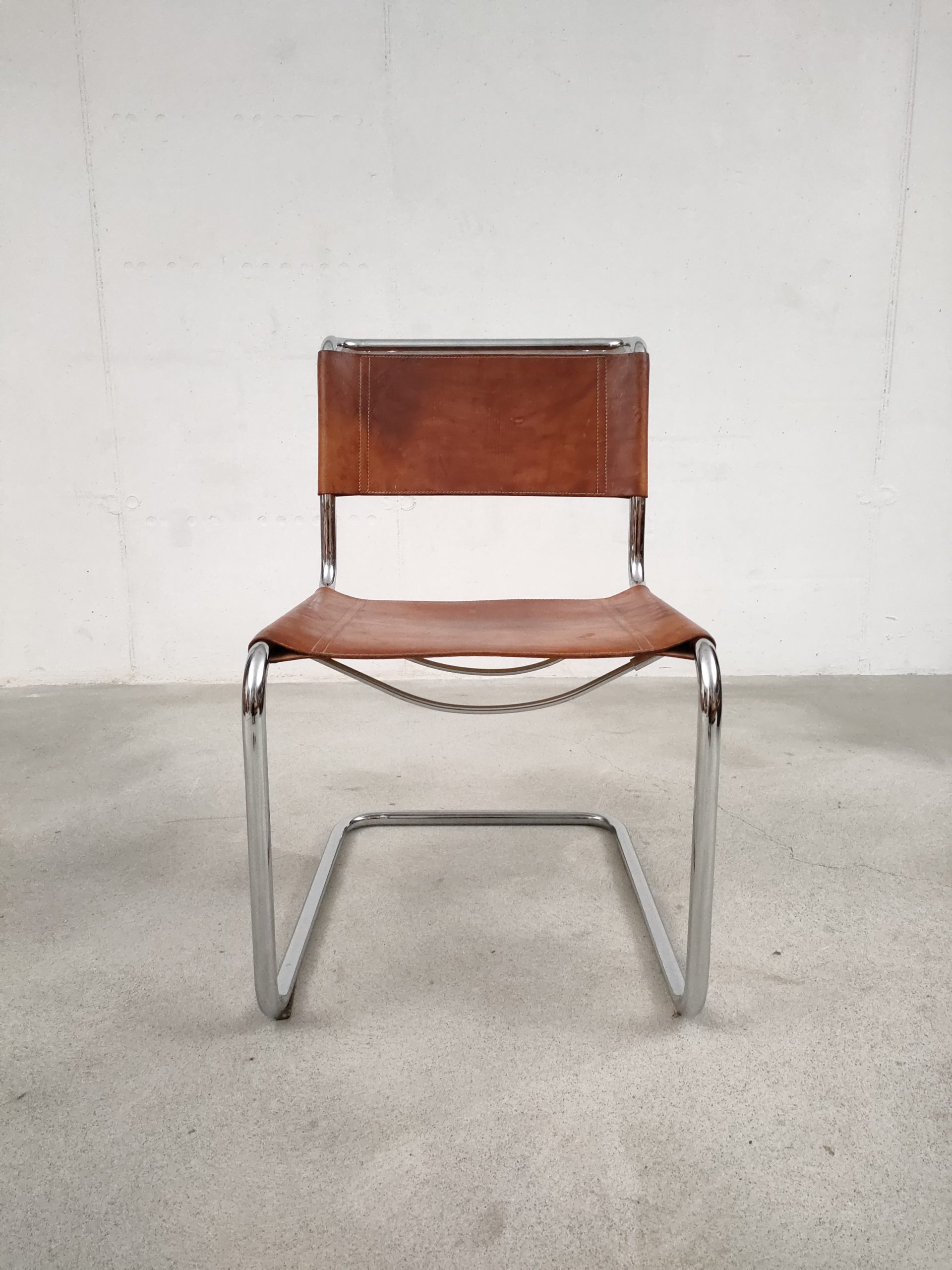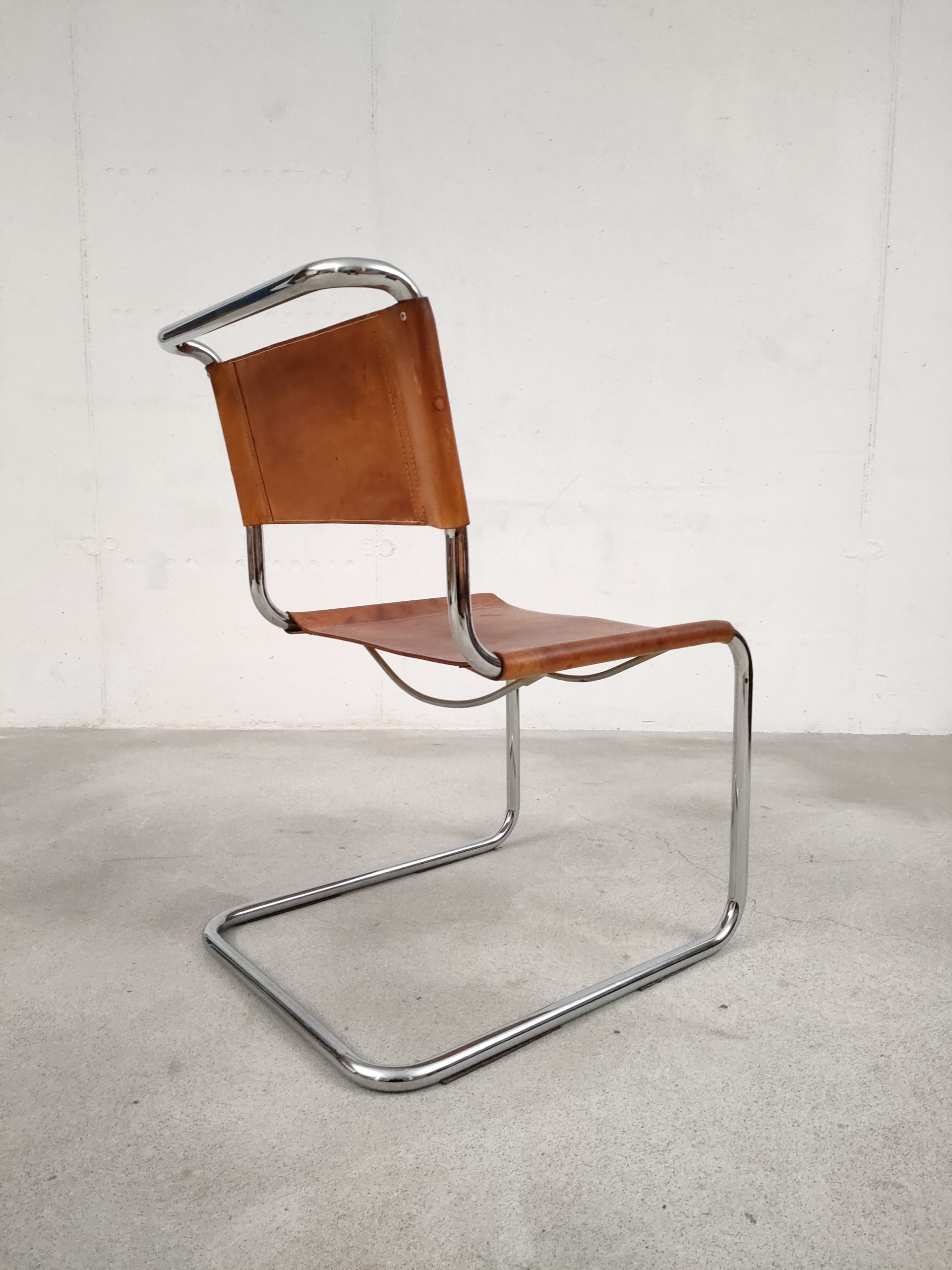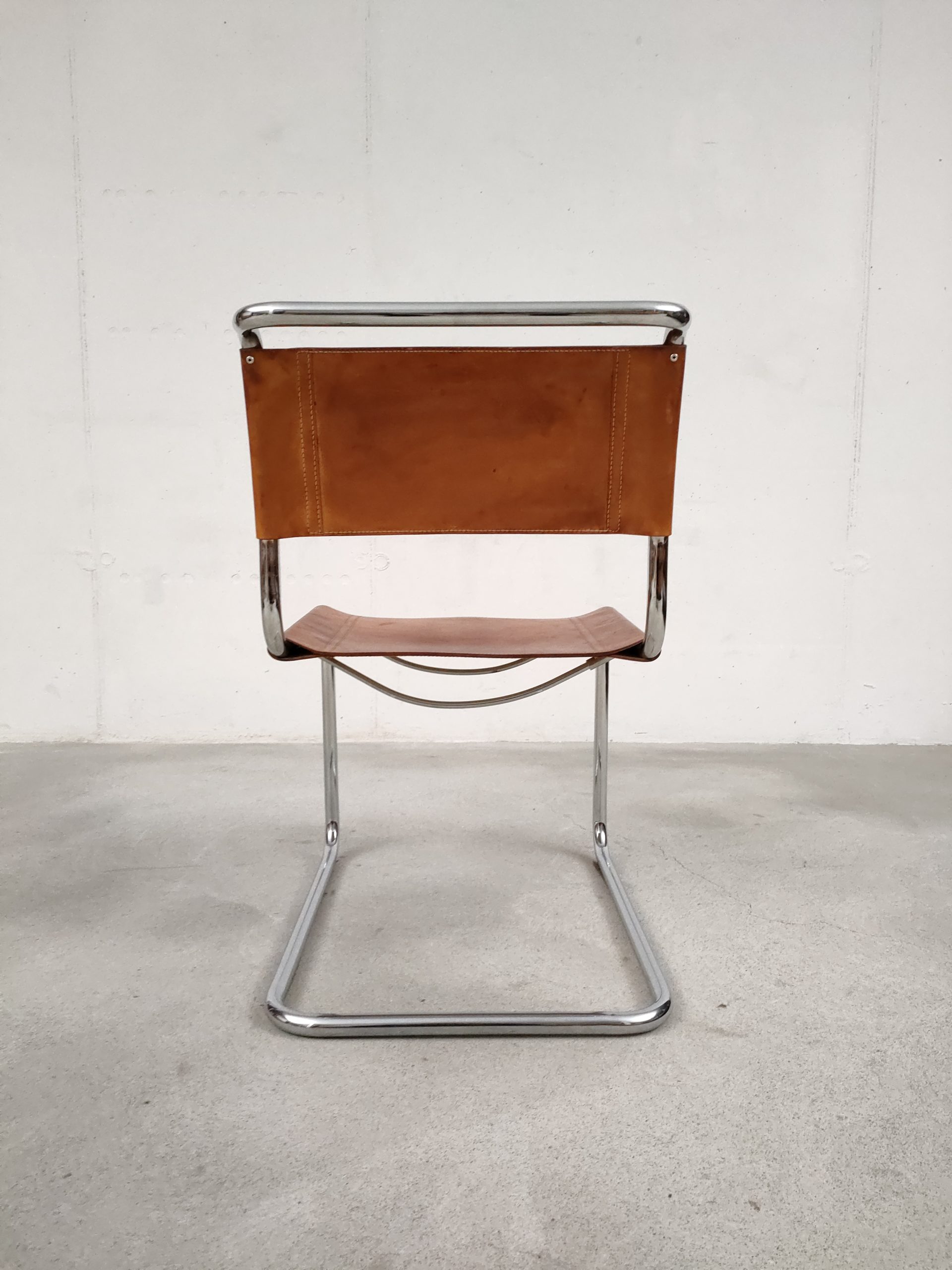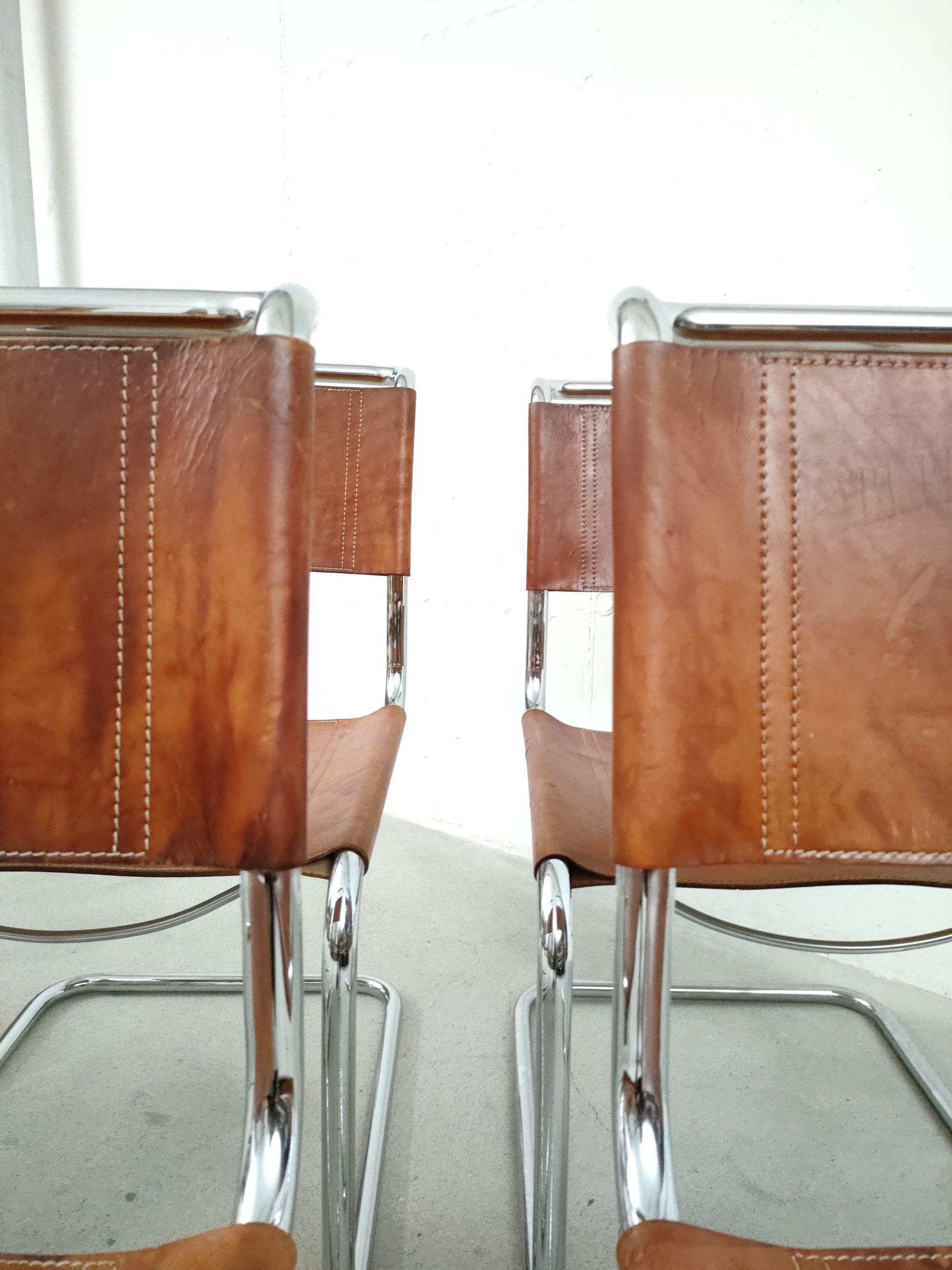 Produit venduSet de 6 chaises avec structure tubulaire en métal et assise et dossier en cuir. Des traces d’usure et signes du temps sont présents sur le cuir et donnent aux chaises une très belle patine vintage. Les chaises sont stables et solides et parfaitement fonctionnelles. Certaines chaises présentent une différence de hauteur (voir dernière photo). Hauteur de l’assise: 44 cm.