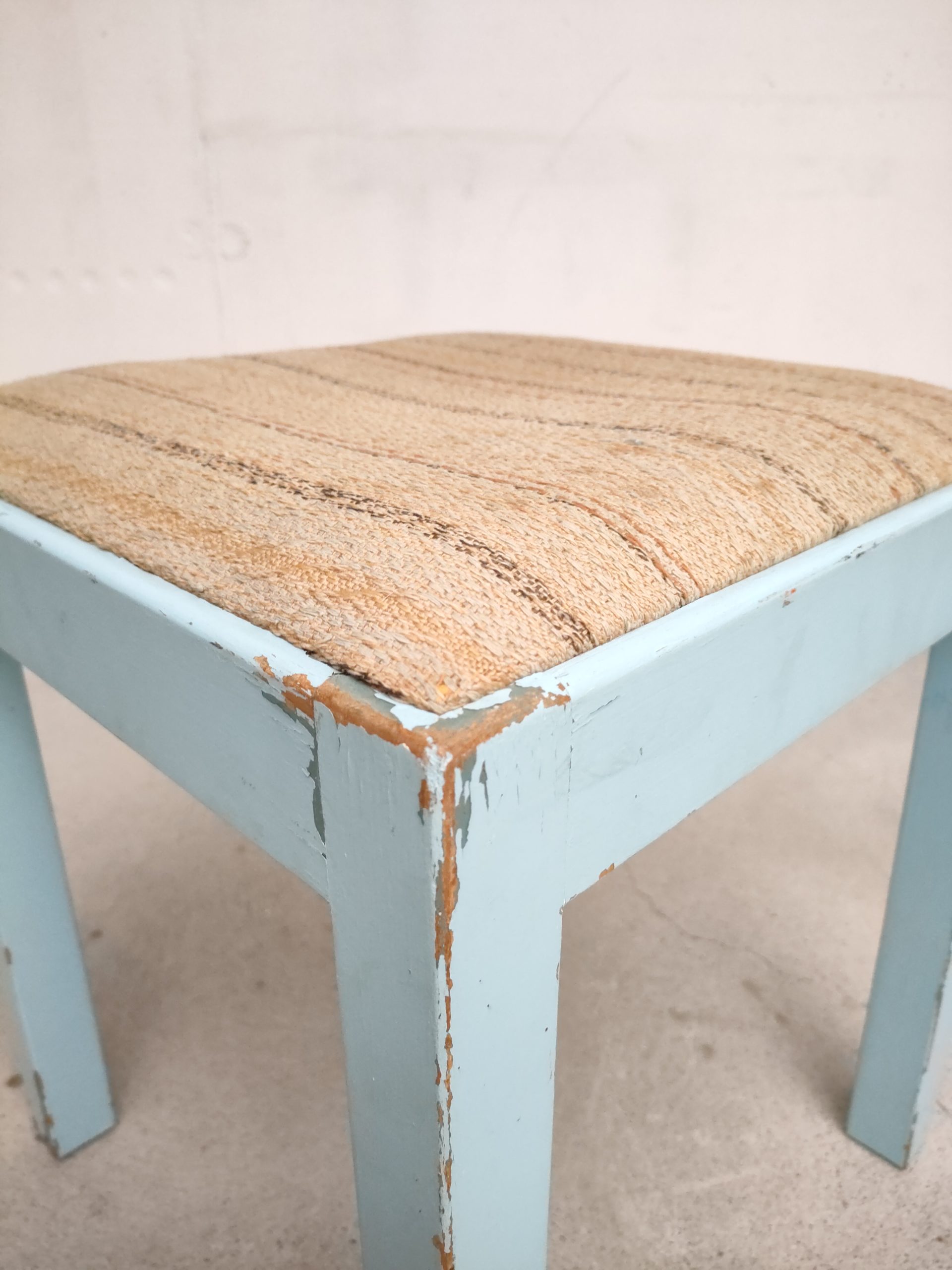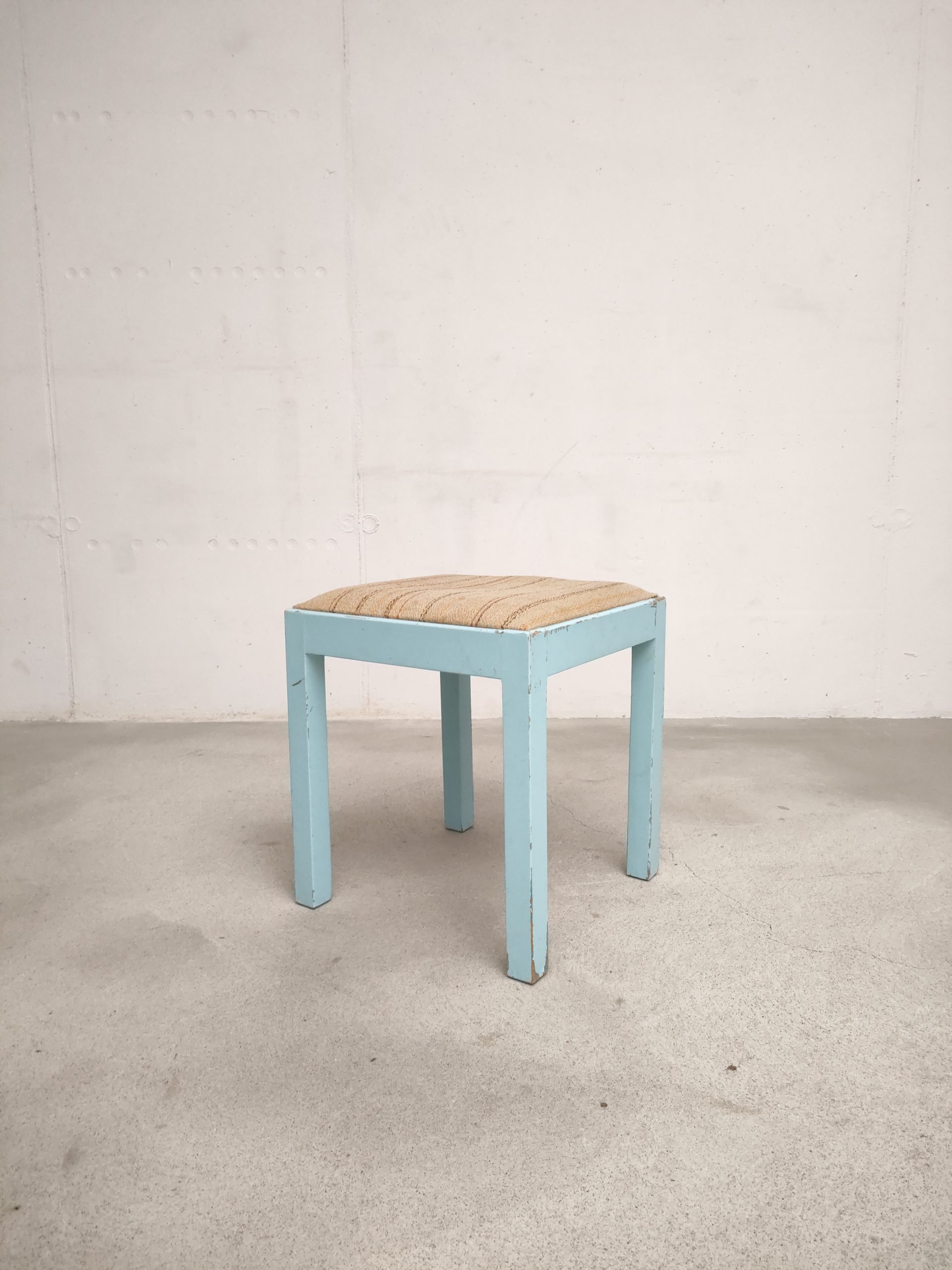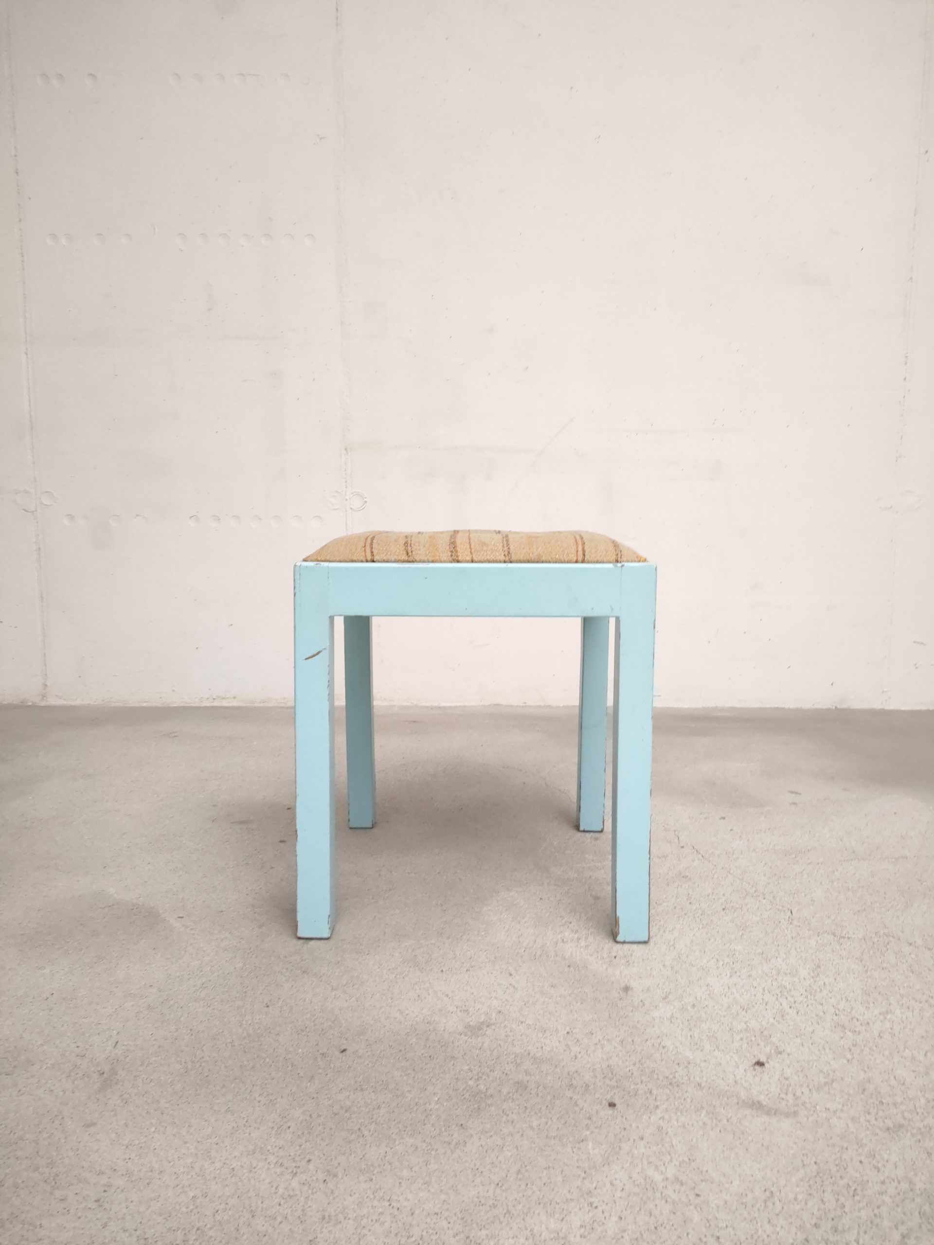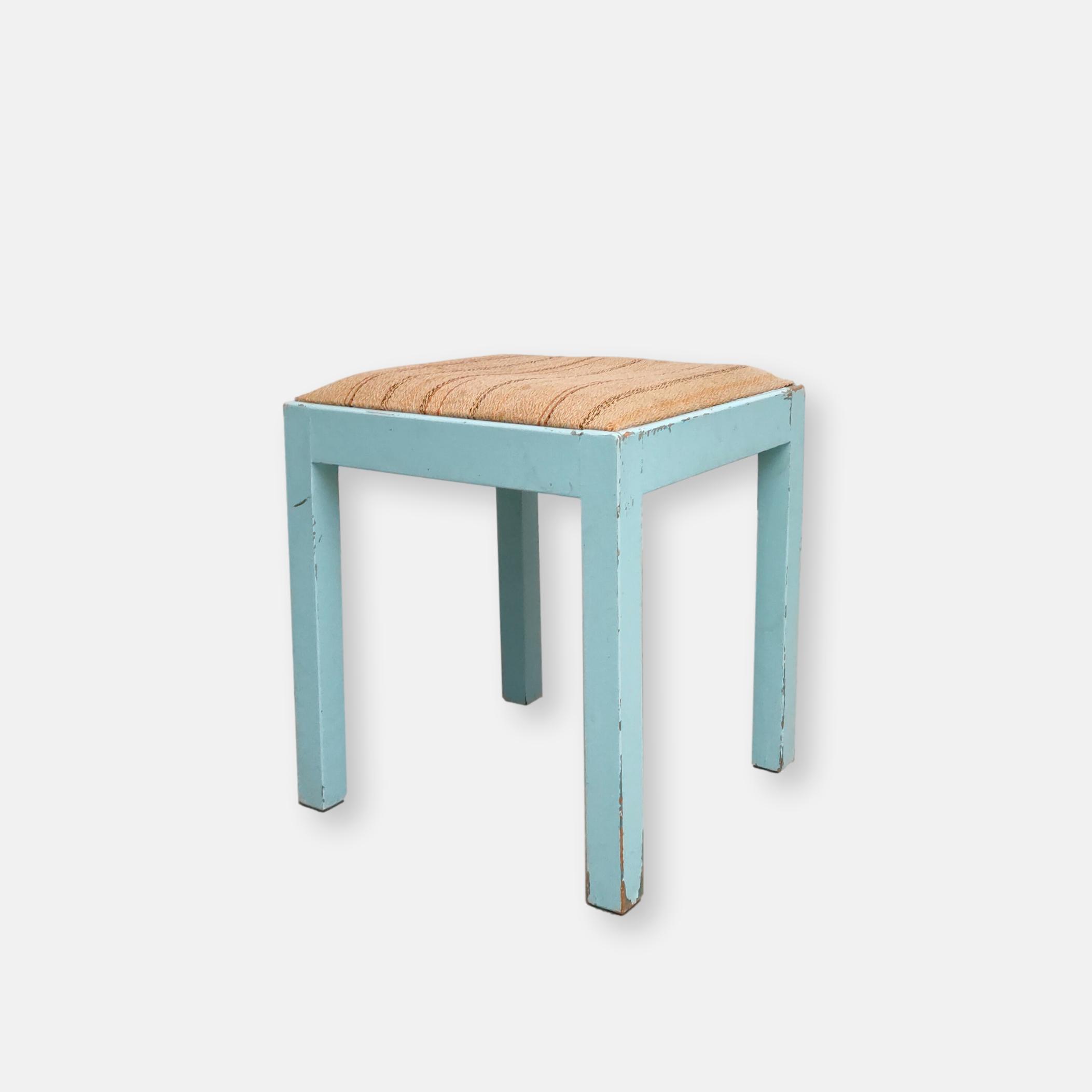 Produit venduTabouret vintage avec structure en bois peint en bleu ciel (d’origine) avec assise en tissu. Le tabouret est stable.