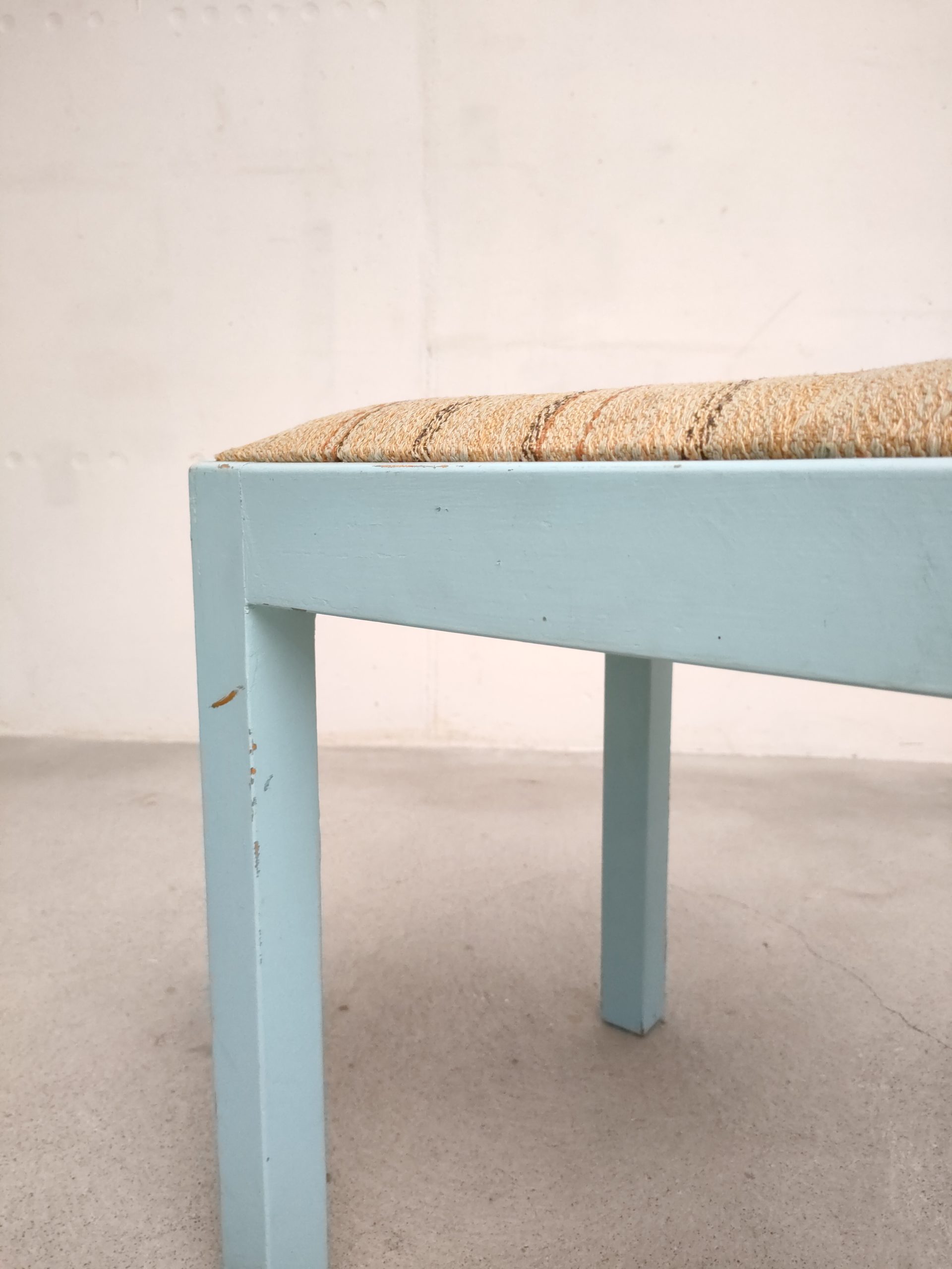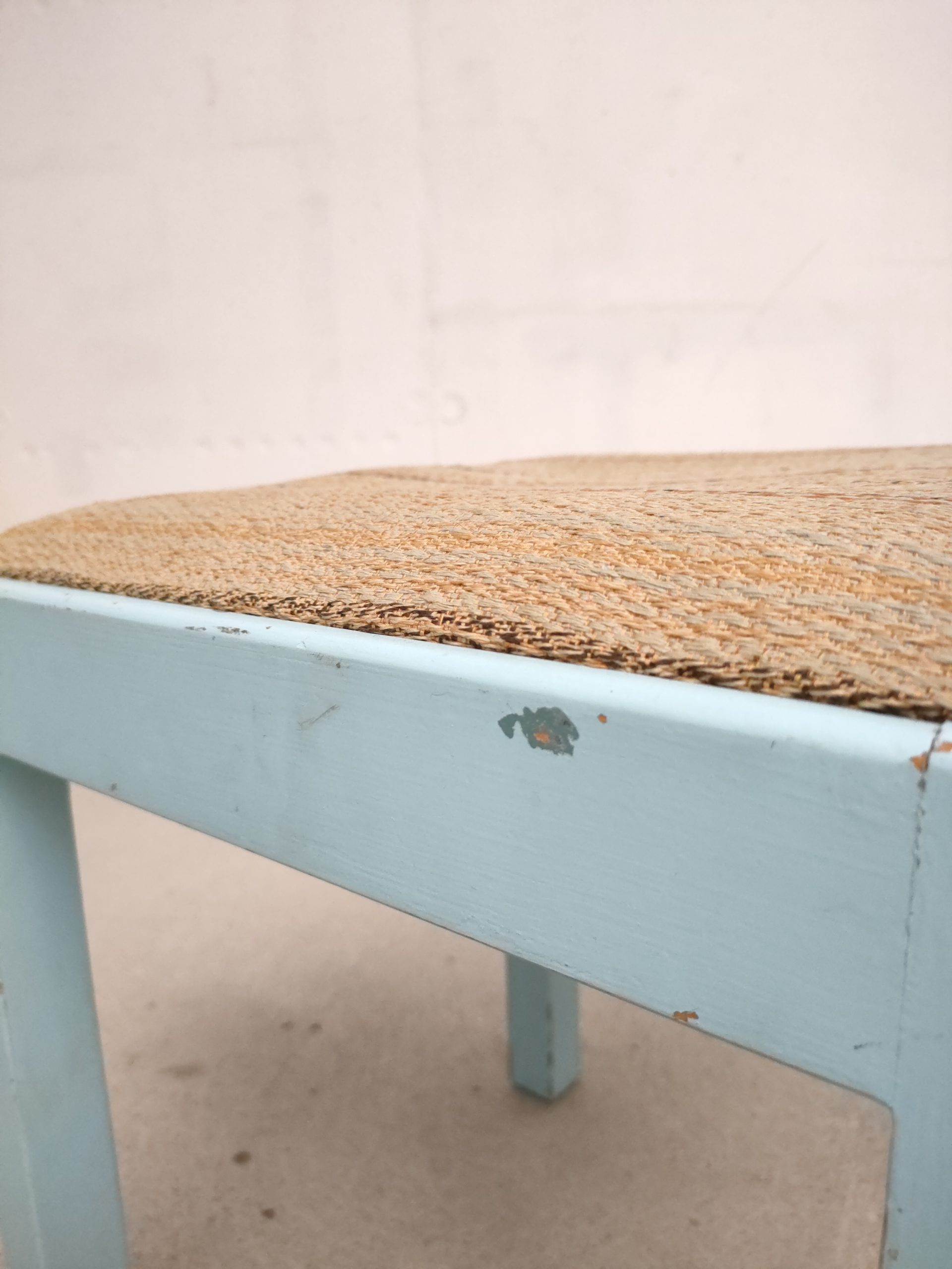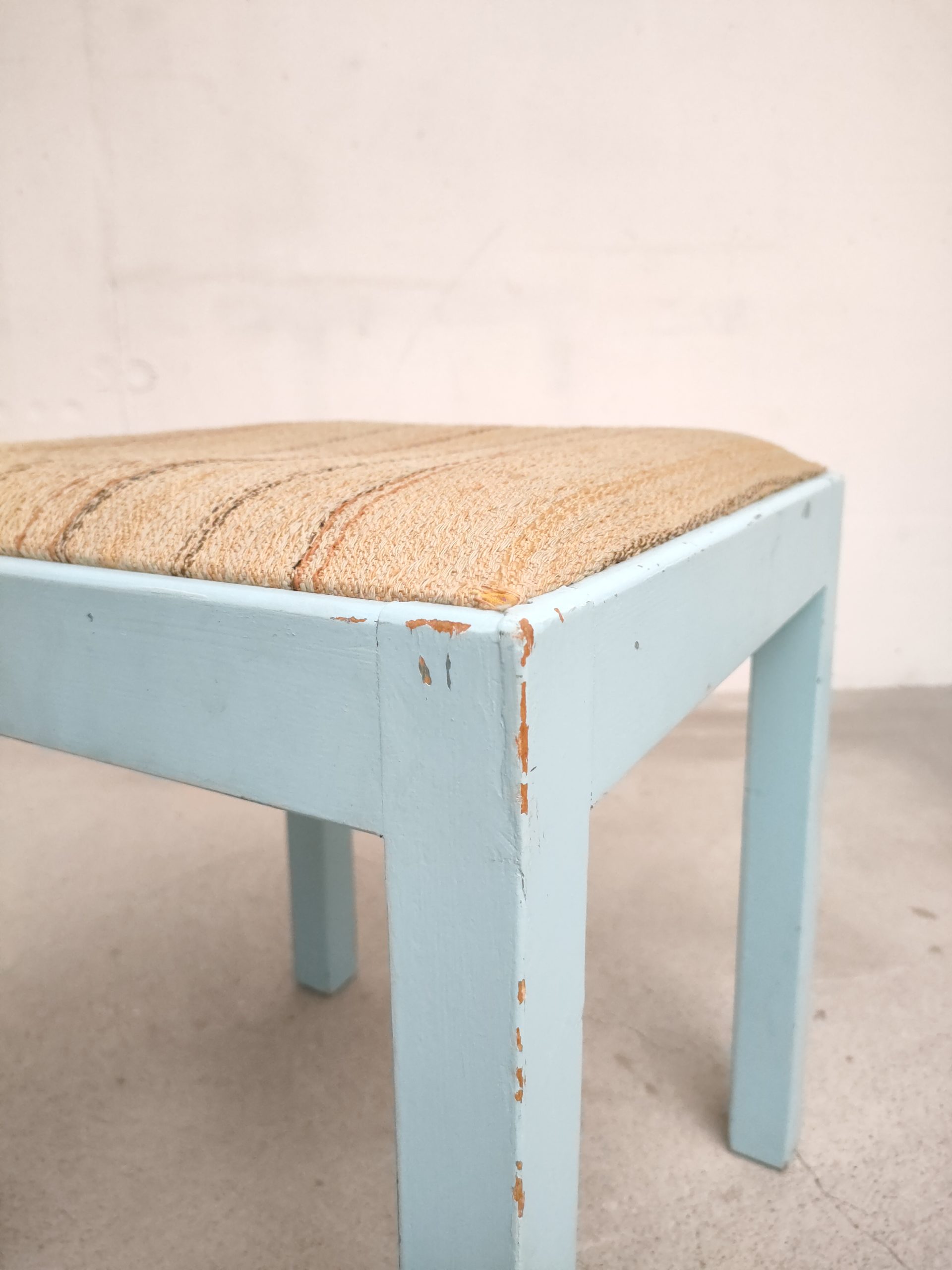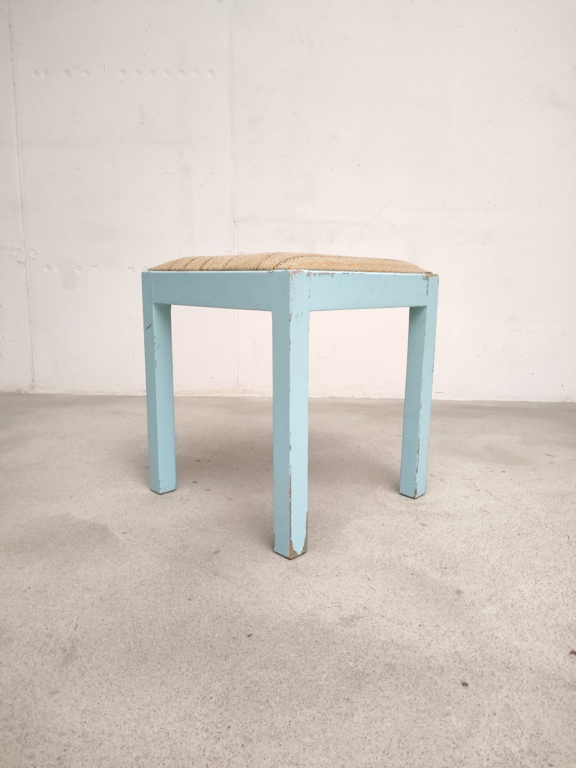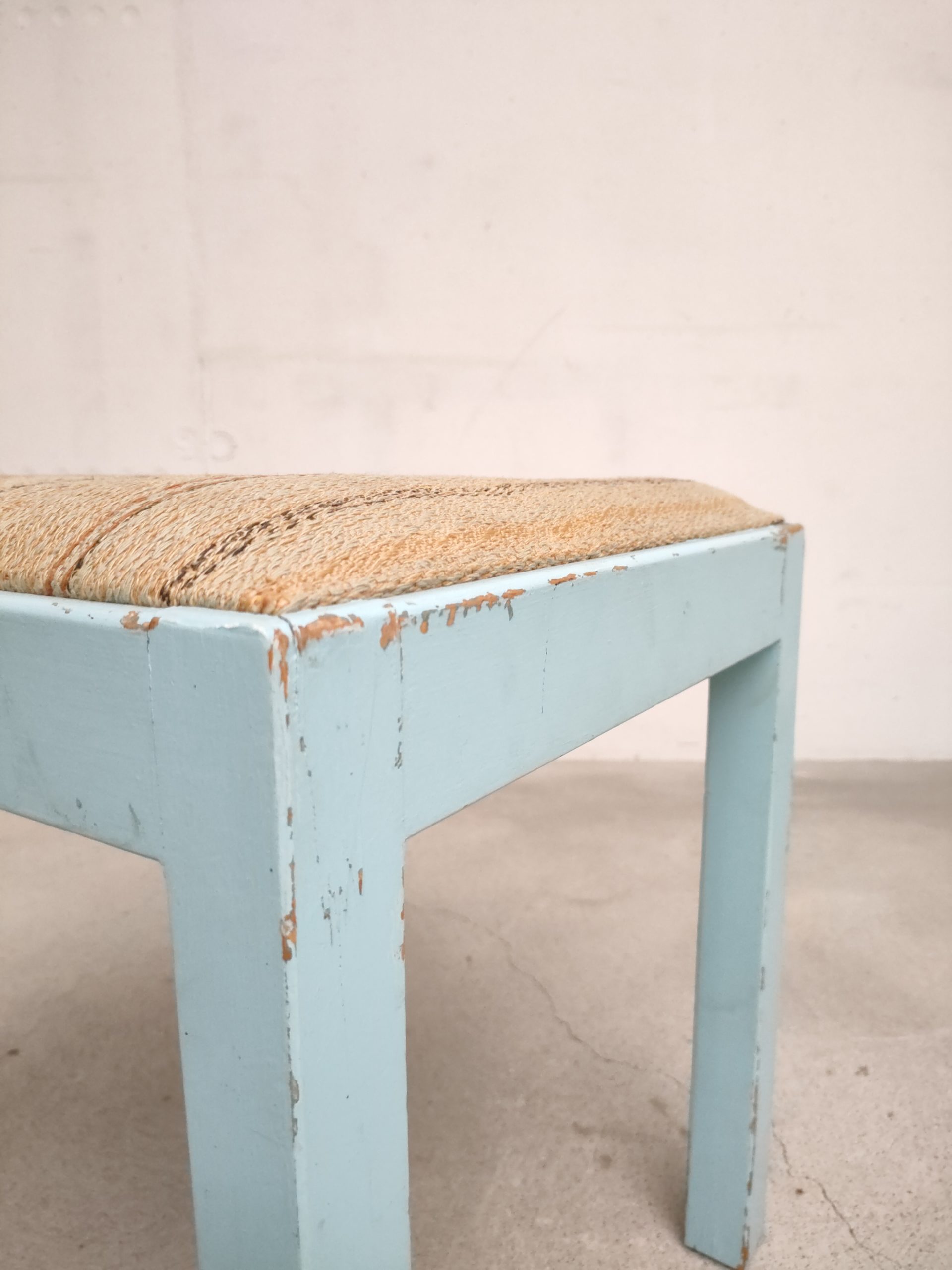 Produit venduTabouret vintage avec structure en bois peint en bleu ciel (d’origine) avec assise en tissu. Le tabouret est stable.