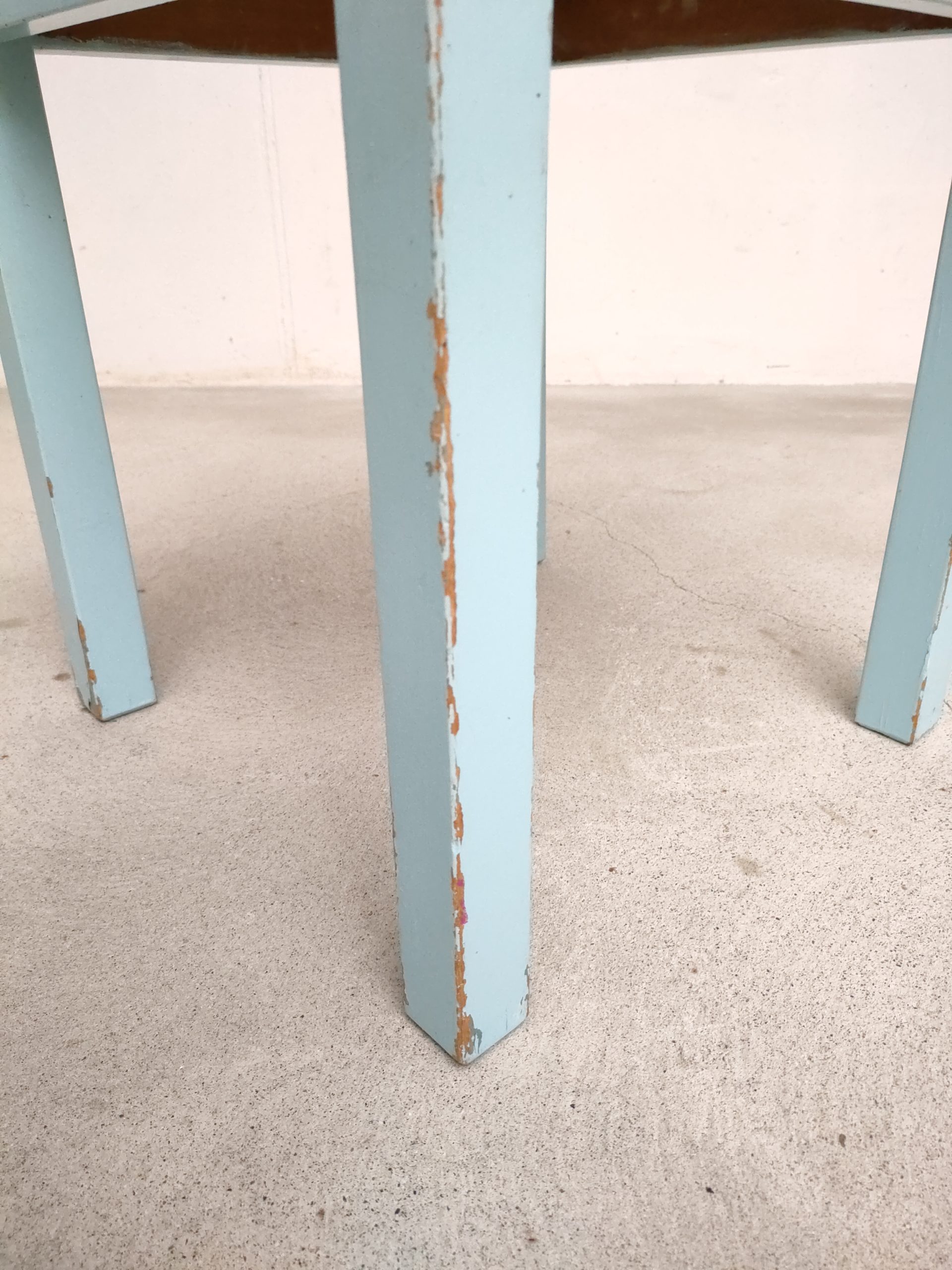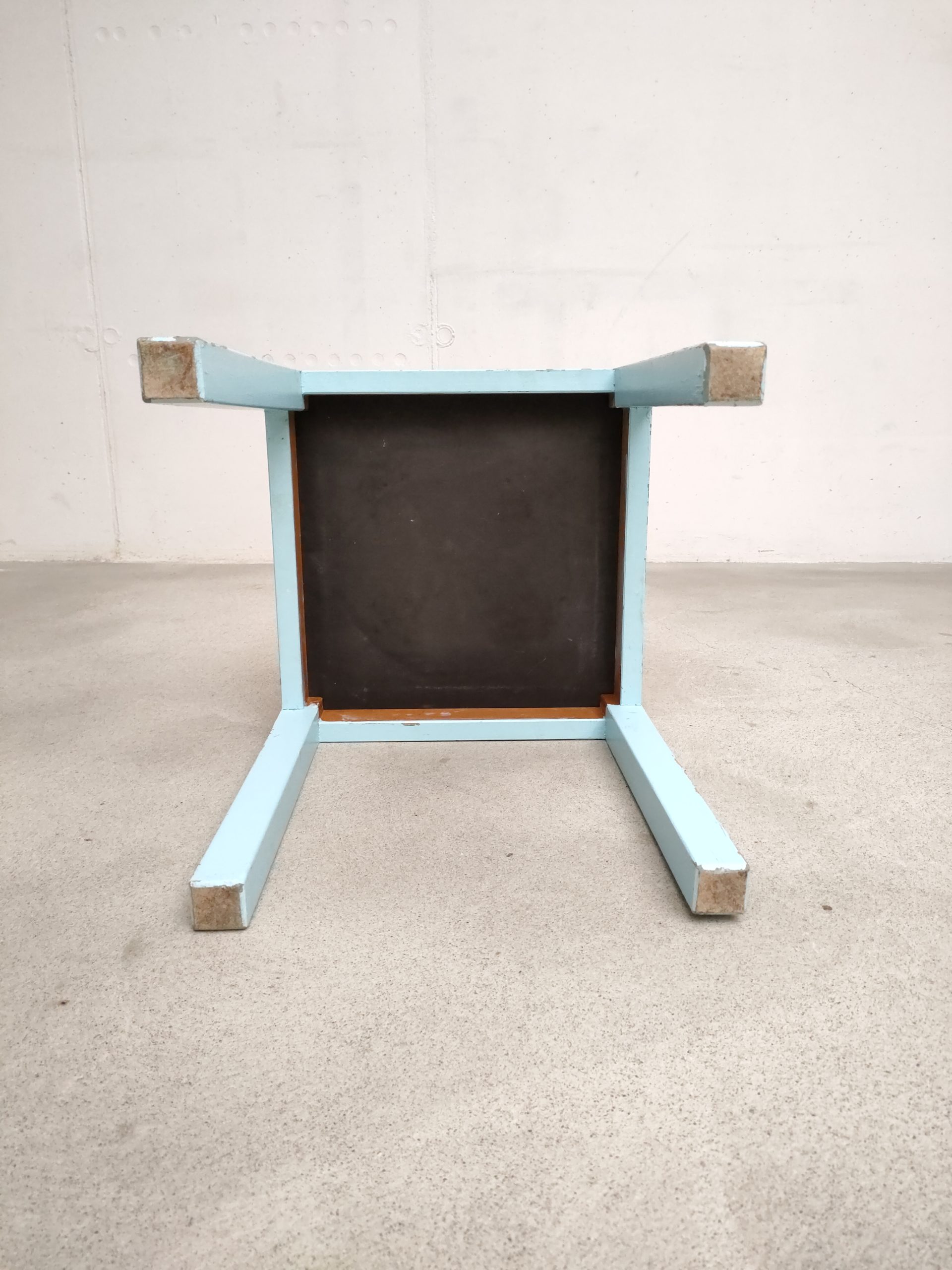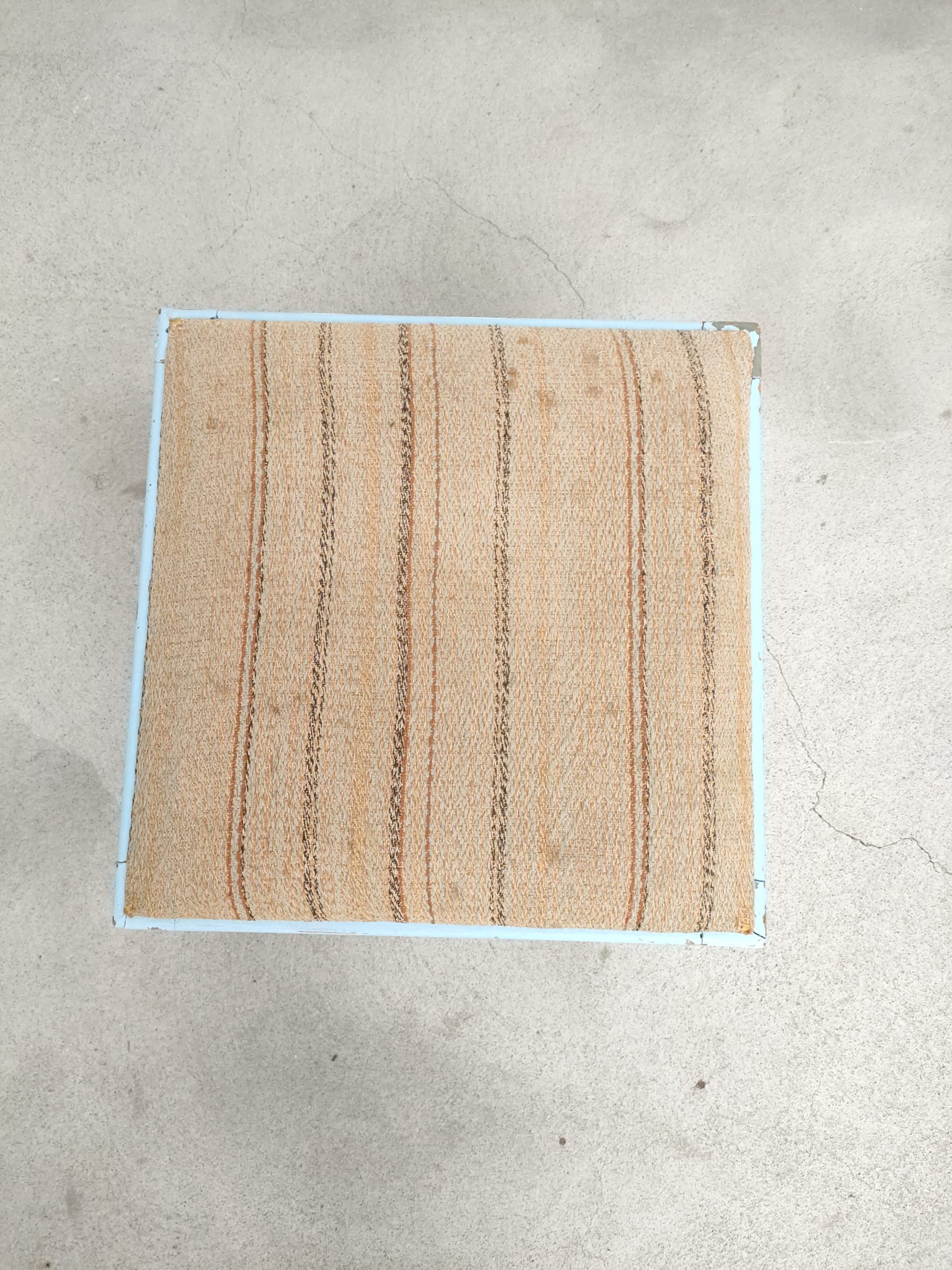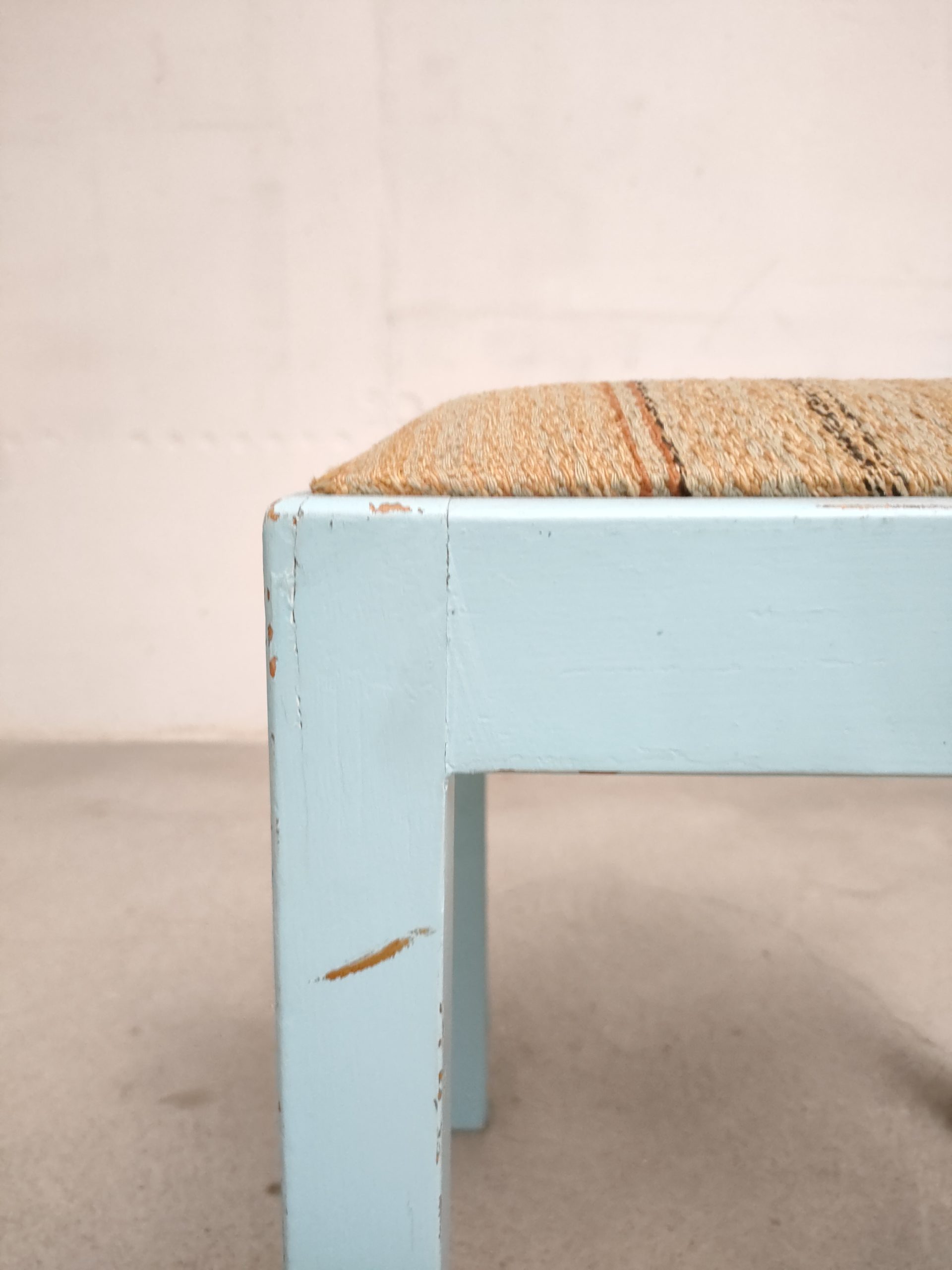 Produit venduTabouret vintage avec structure en bois peint en bleu ciel (d’origine) avec assise en tissu. Le tabouret est stable.