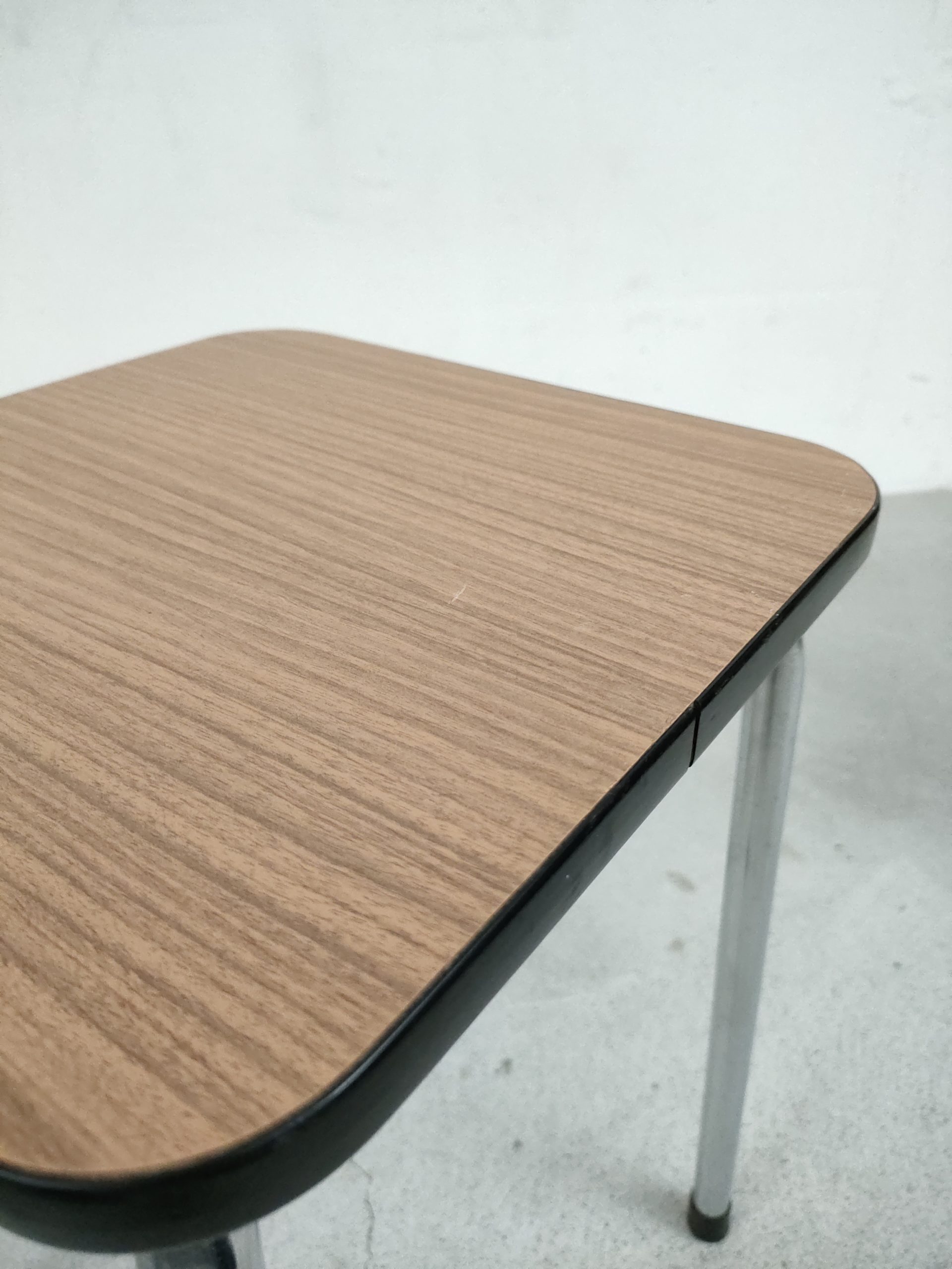 Produit venduTabouret vintage avec pieds en métal et assise en formica imitation bois.