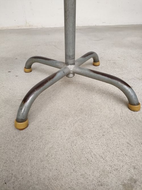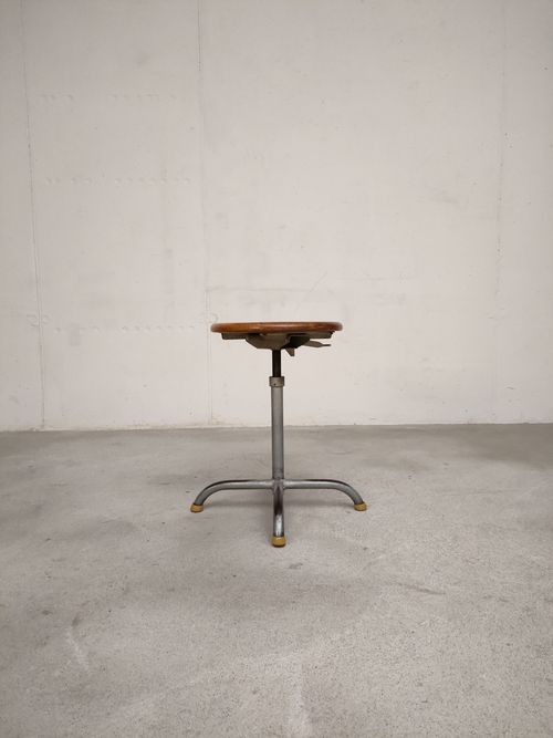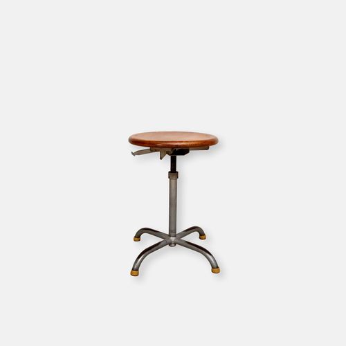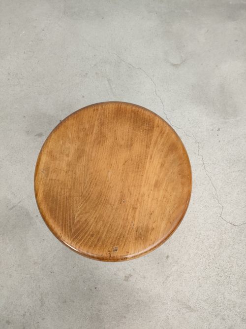 Produit venduTabouret industriel vintage avec structure en métal et assise en bois. La hauteur est réglable (min 43 cm, max 64 cm). Des traces d’usure sont présentes et lui donnent une très belle patine vintage. Diamètre de l’assise: 34 cm.