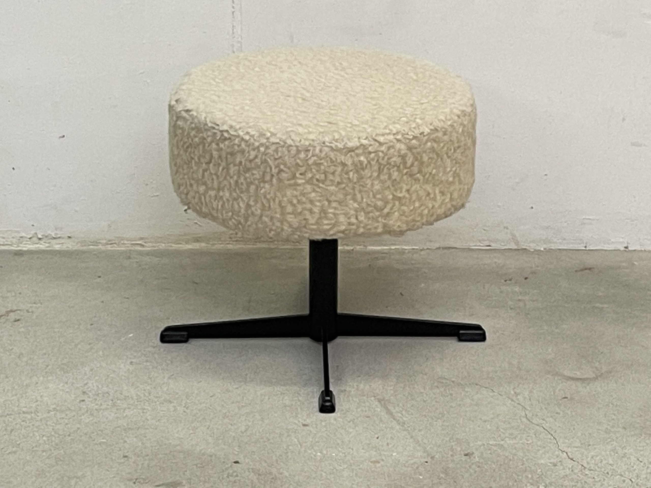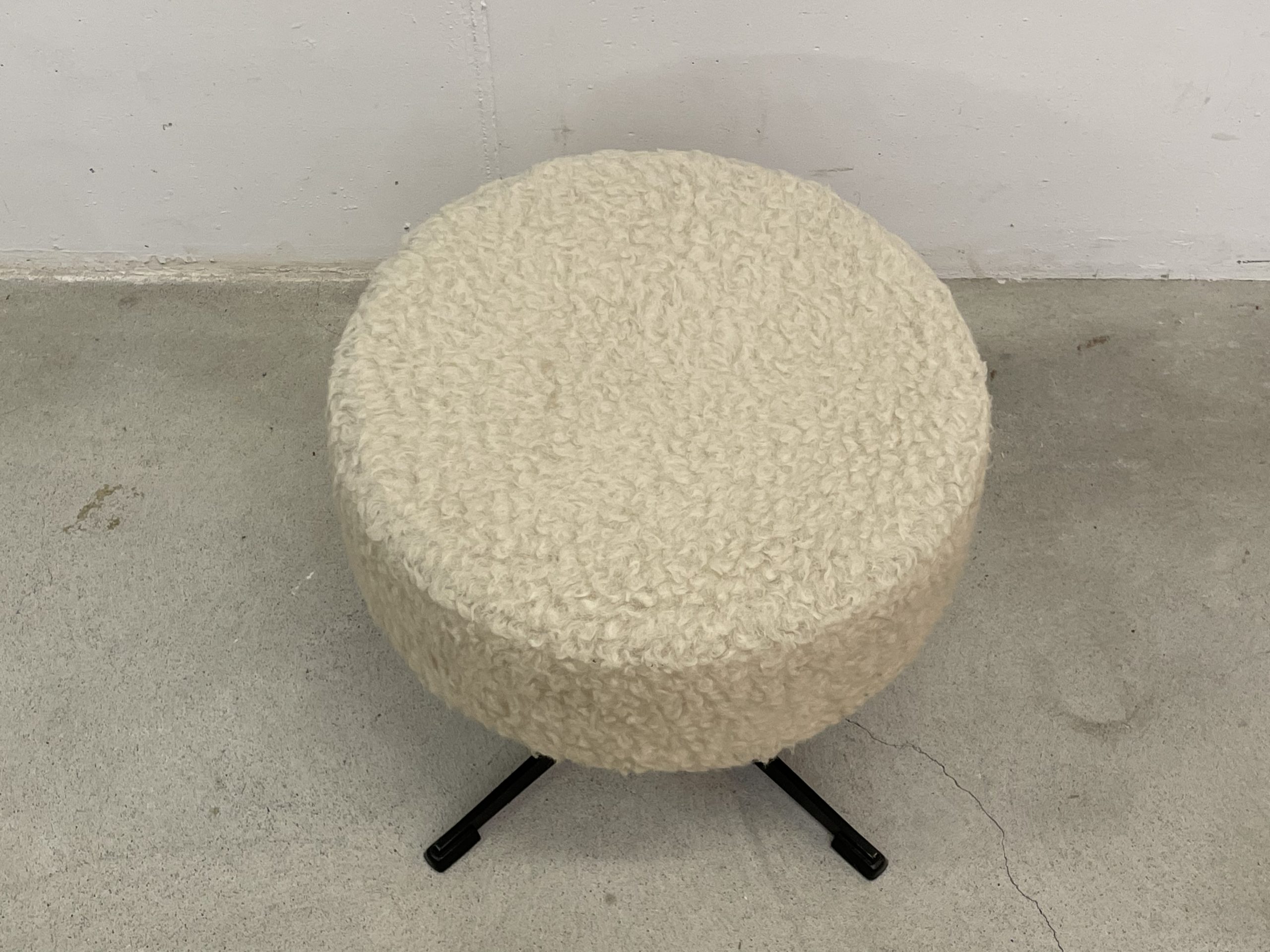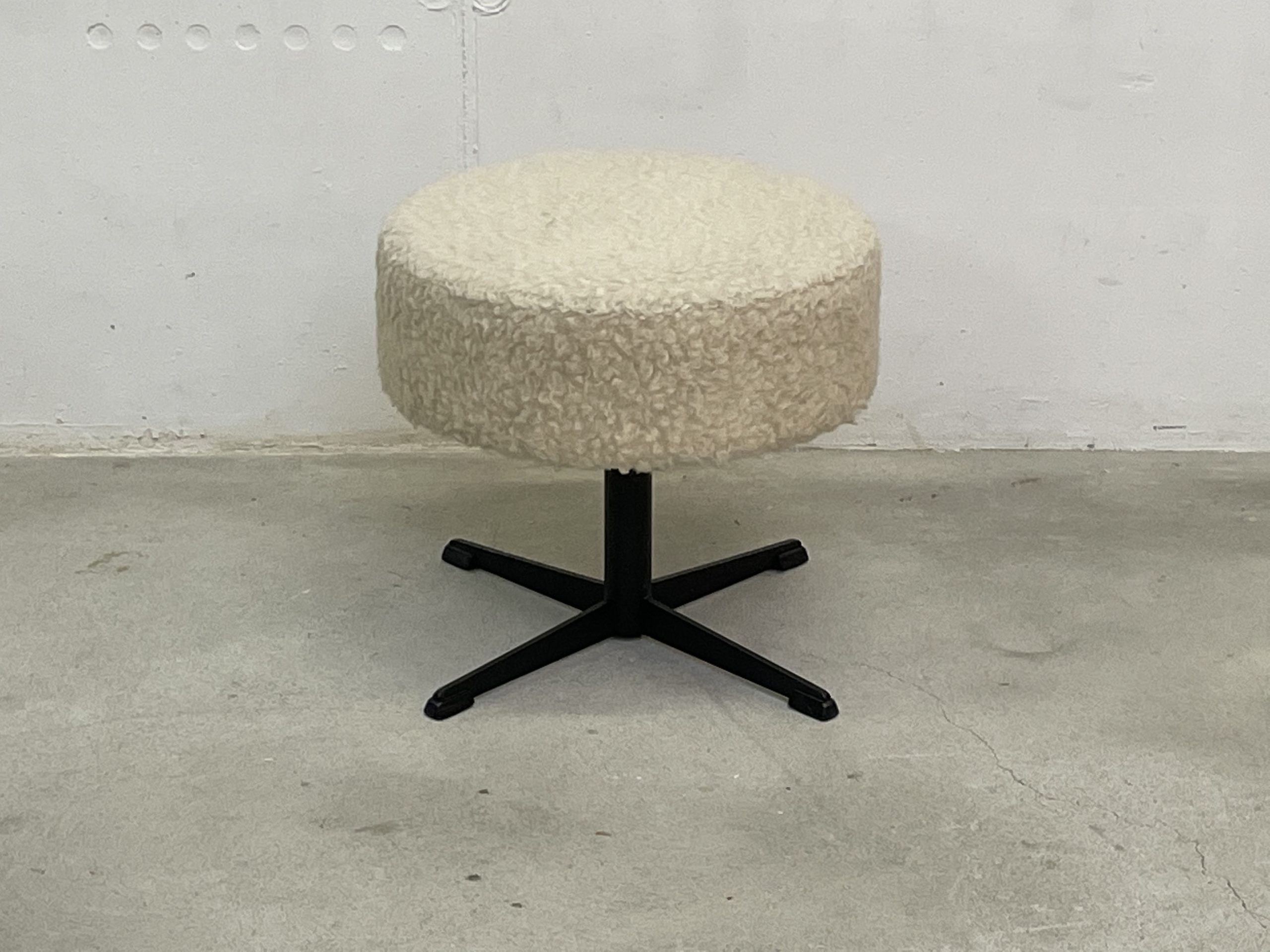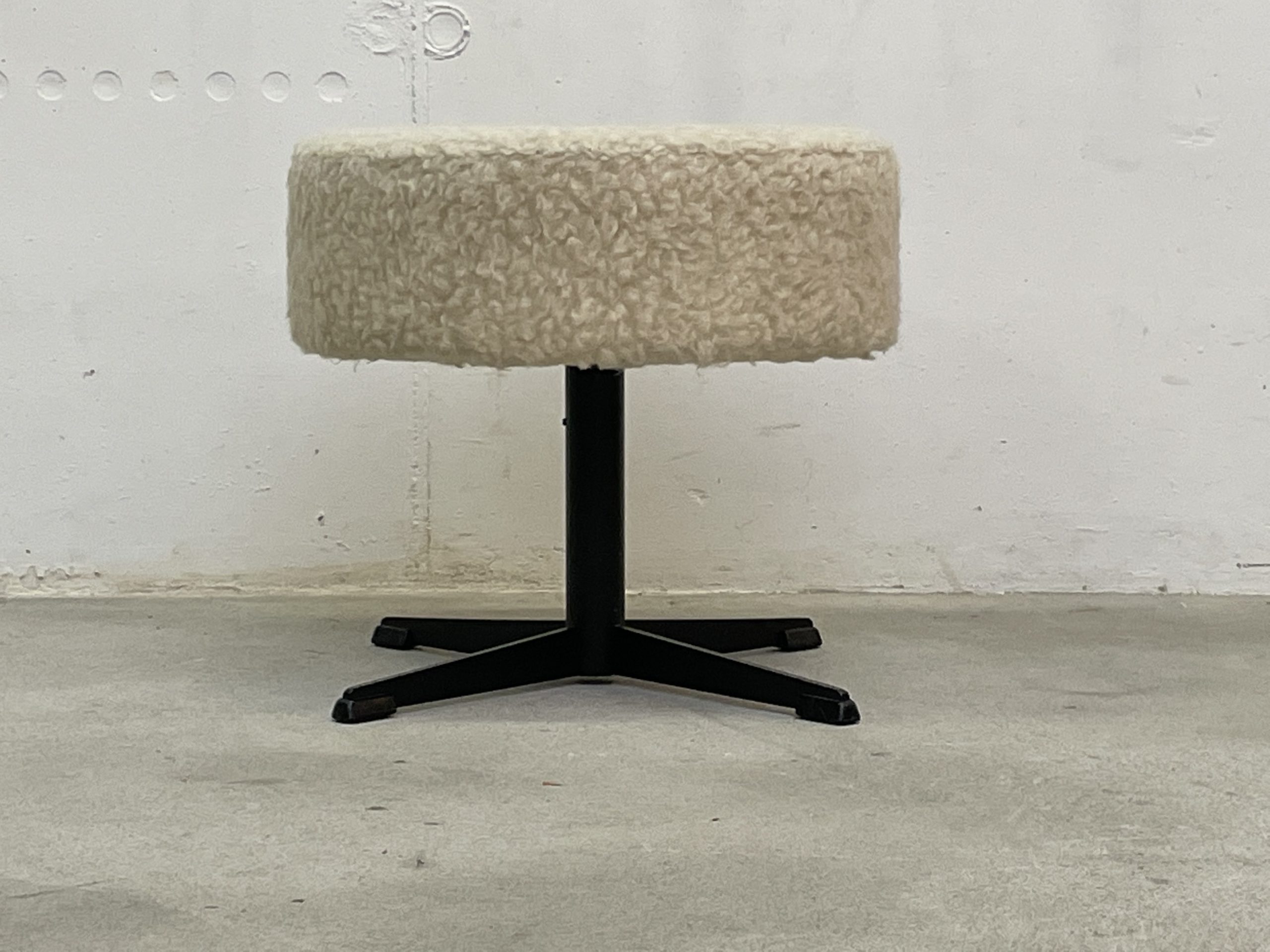 Produit venduTabouret vintage recouvert de tissu synthétique ressemblant à une peau de mouton. Le tabouret tourne à 360 degrés, n’est pas réglable en hauteur, mais très confortable, car rembourré.