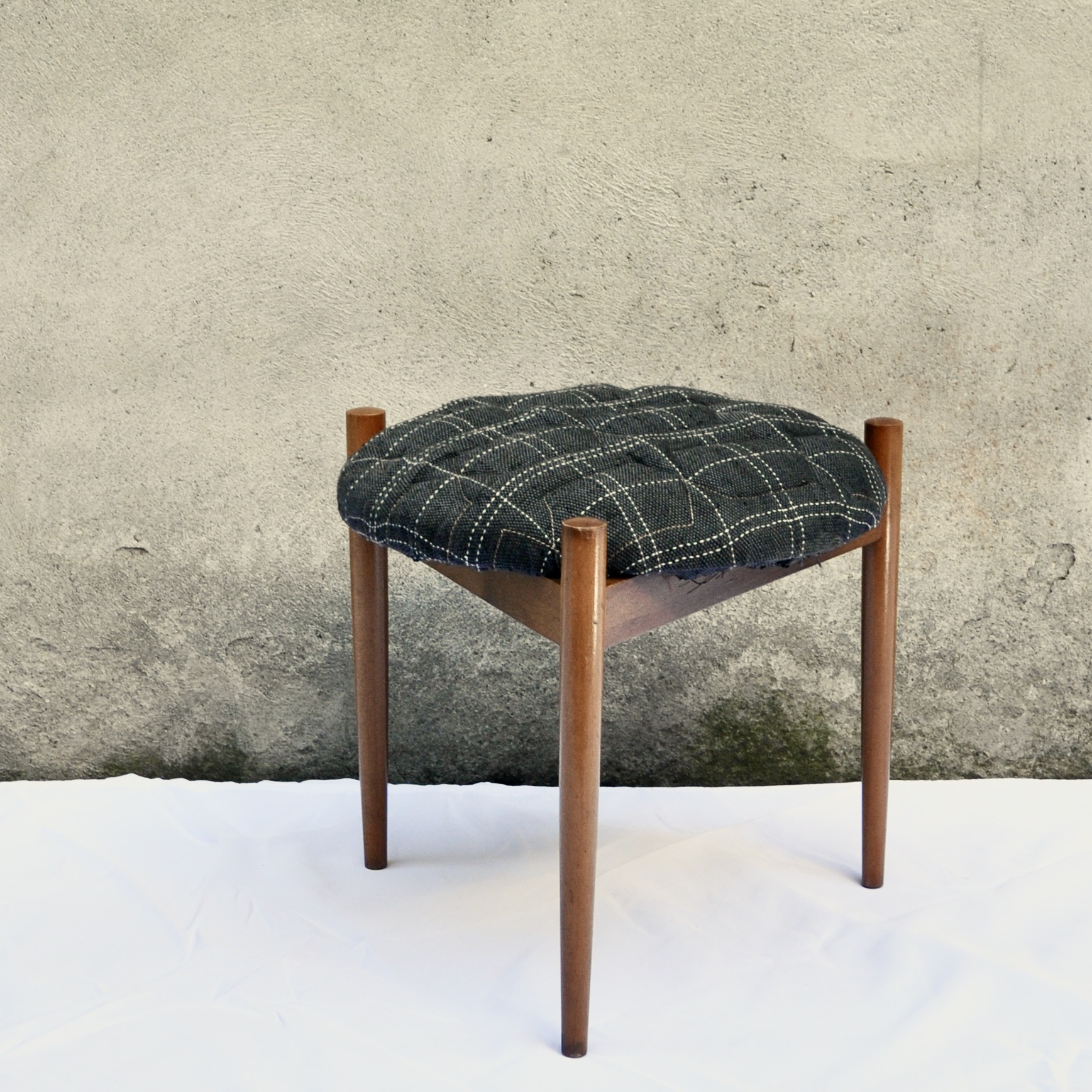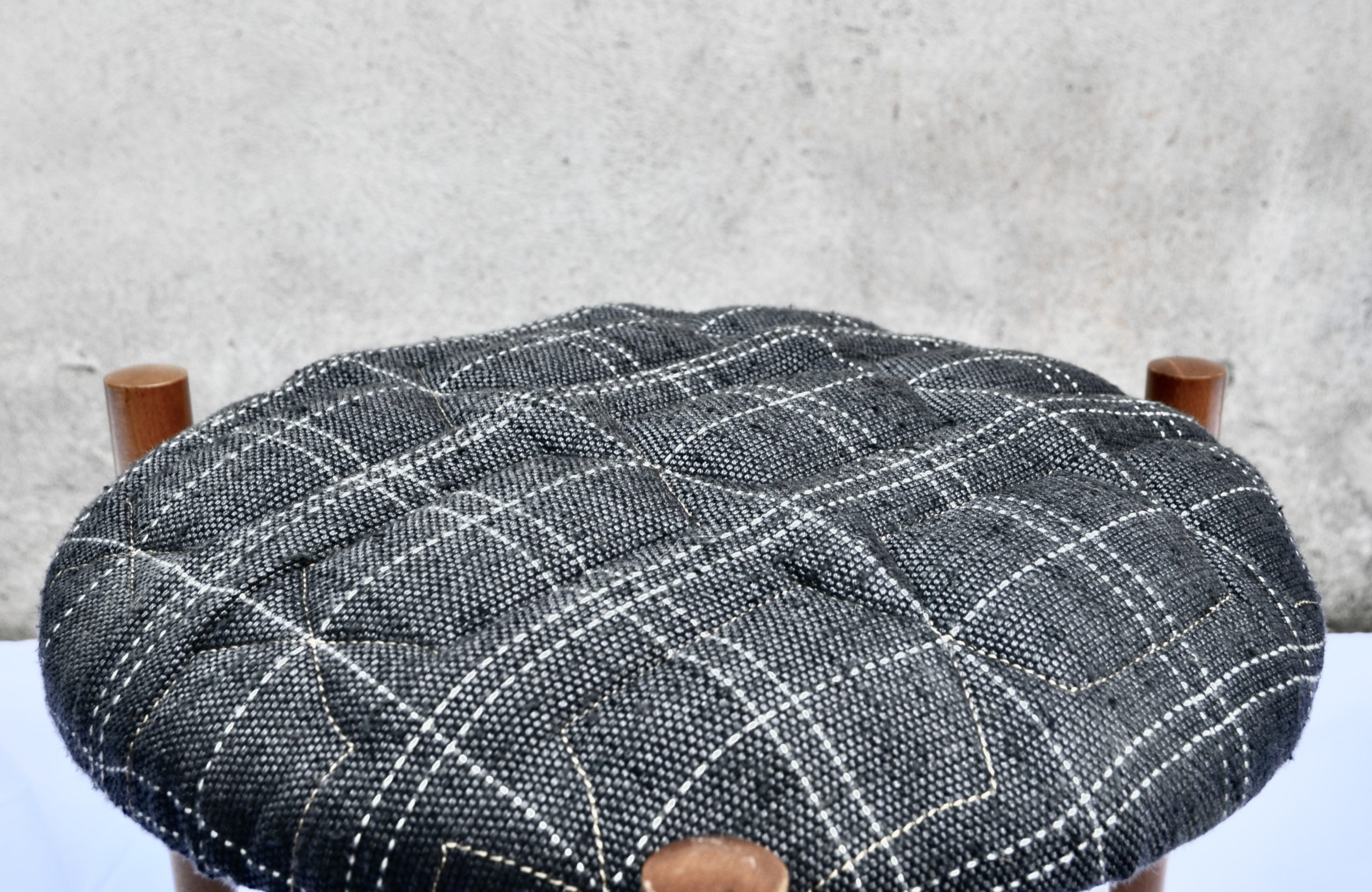 Ces tabourets tripodes en bois de teck d’origine danoise ont complètement été restaurés. La mousse de l’assise a été changée et est recouverte d’un tissu cousu en 3D à la pièce dans nos ateliers.
