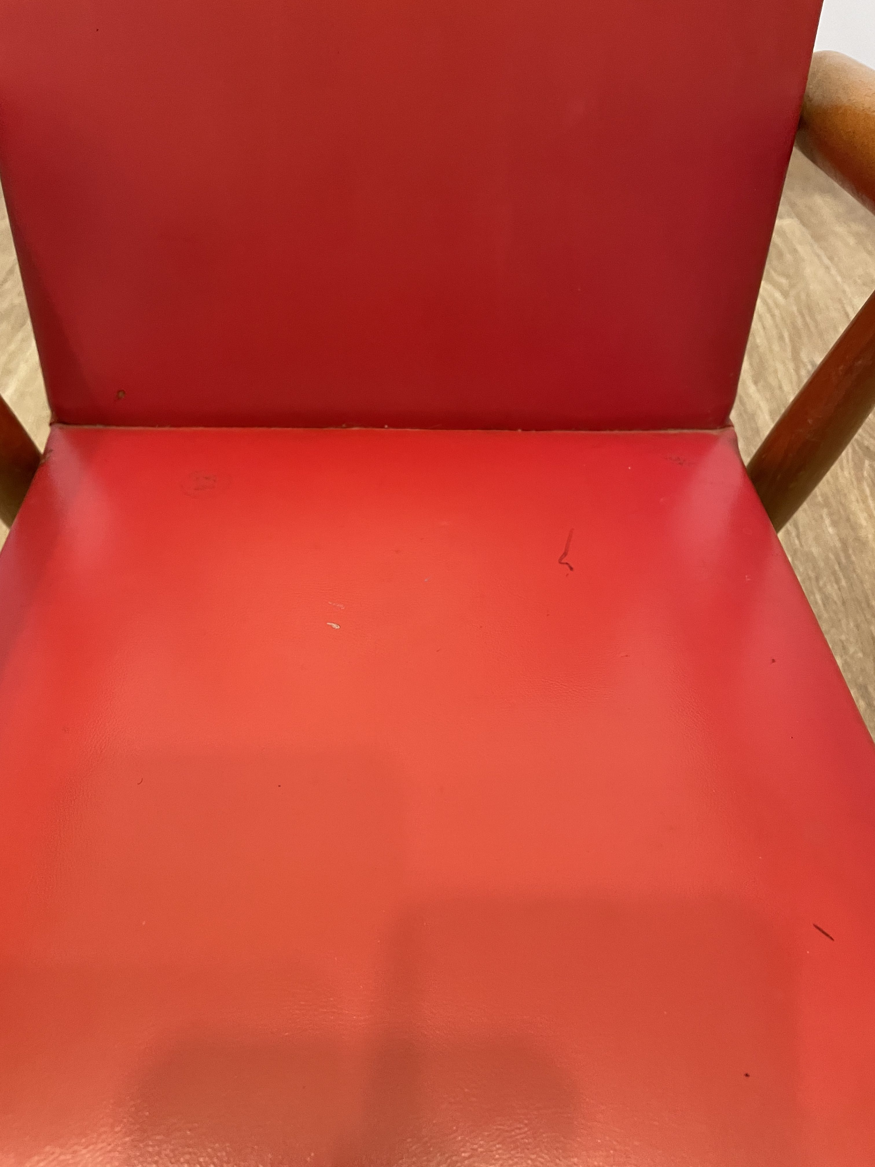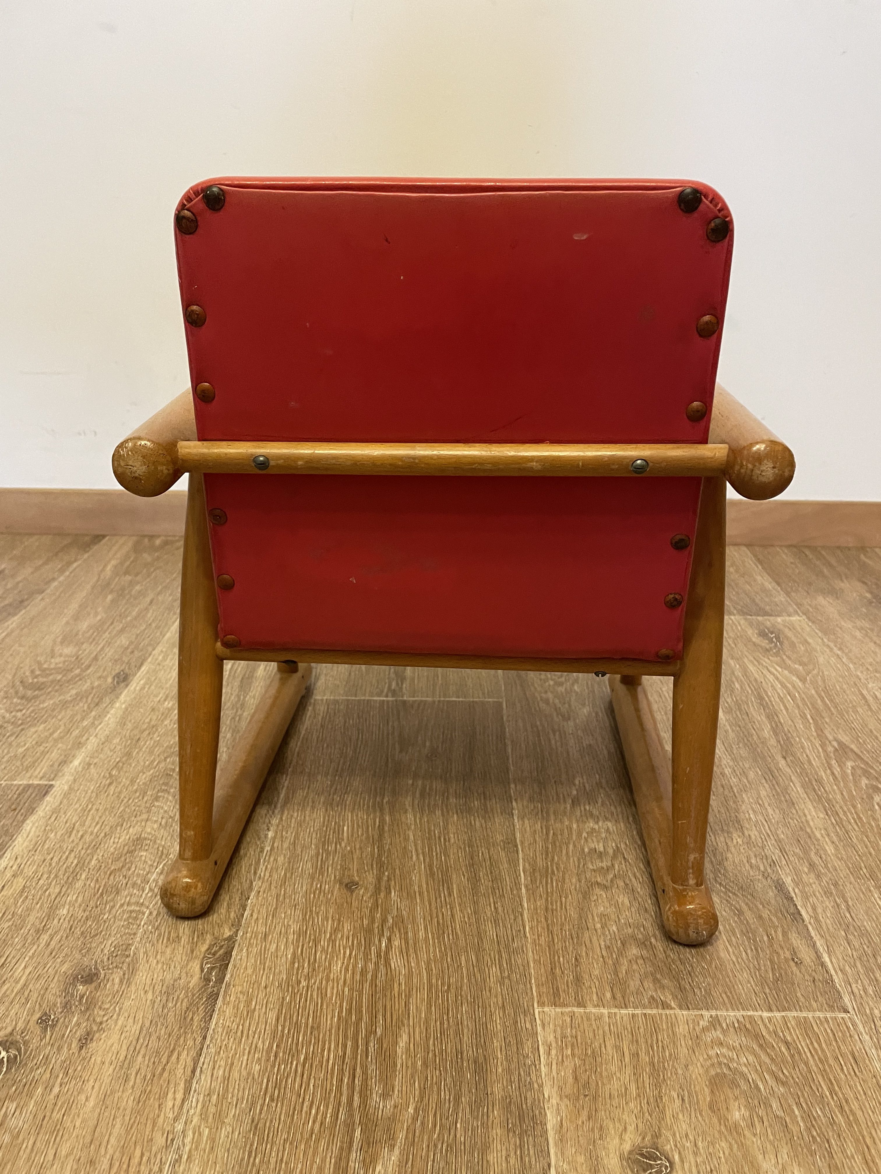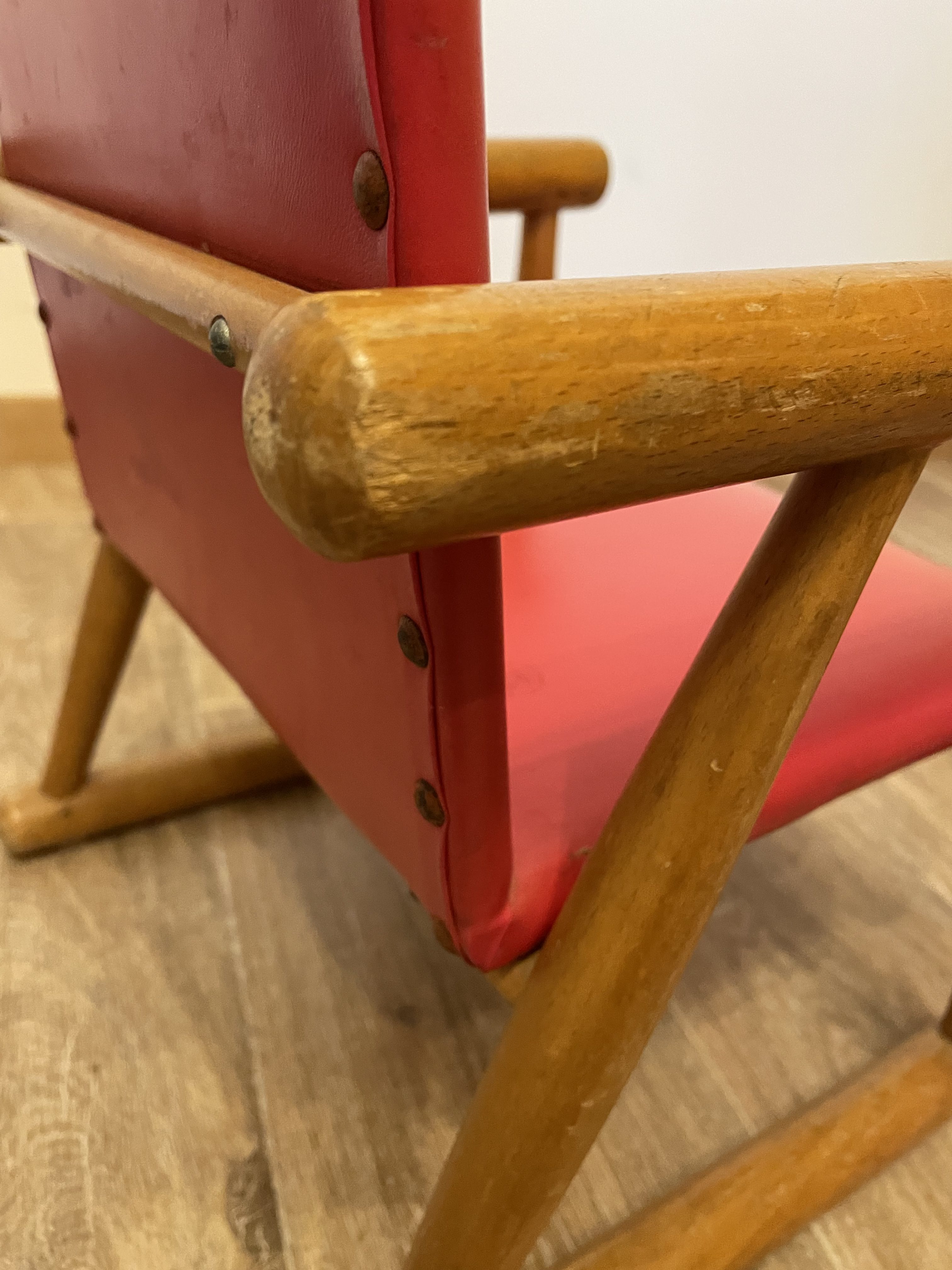 La structure est en bois et l’assise en simili cuir de couleur rouge.